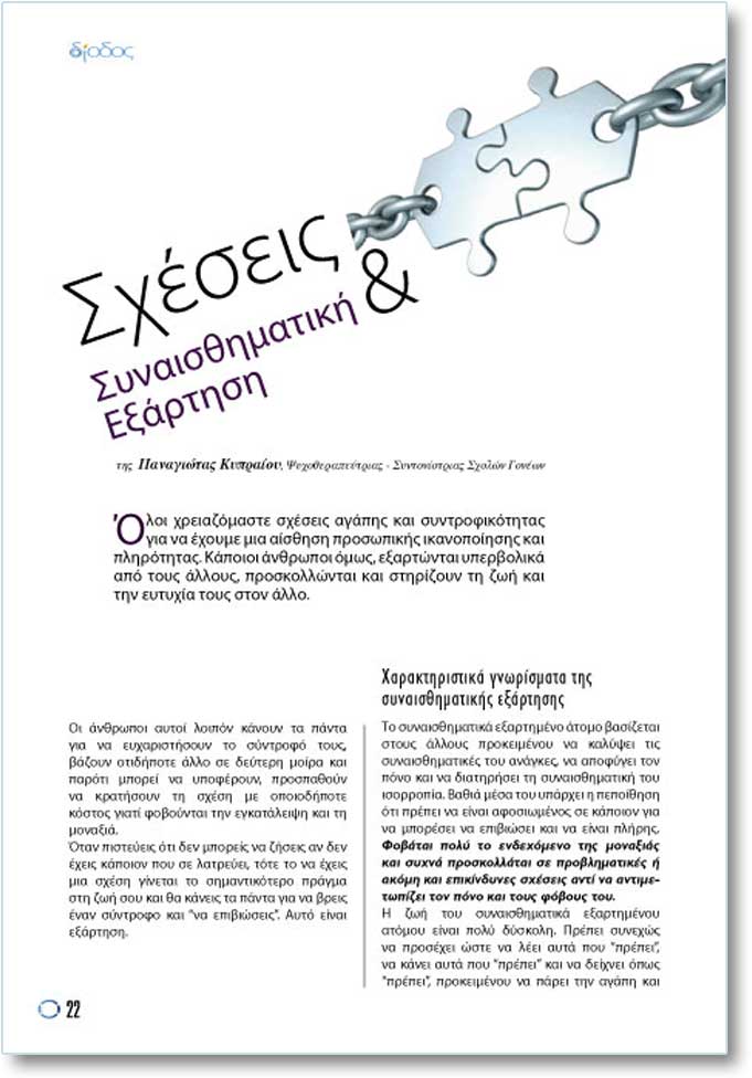 ¼ëïé ÷ñåéáæüìáóôå ó÷Ýóåéò áãÜðçò êáé óõíôñïöéêüôçôáò ãéá íá Ý÷ïõìå ìéá áßóèçóç ðñïóùðéêÞò éêáíïðïßçóçò êáé ðëçñüôçôáò. ÊÜðïéïé Üíèñùðïé üìùò, åîáñôþíôáé õðåñâïëéêÜ áðü ôïõò Üëëïõò, ðñïóêïëëþíôáé êáé óôçñßæïõí ôç æùÞ êáé ôçí åõôõ÷ßá ôïõò óôïí Üëëï. Ïé Üíèñùðïé áõôïß ëïéðüí êÜíïõí ôá ðÜíôá ãéá íá åõ÷áñéóôÞóïõí ôï óýíôñïöü ôïõò, âÜæïõí ïôéäÞðïôå Üëëï óå äåýôåñç ìïßñá êáé ðáñüôé ìðïñåß íá õðïöÝñïõí, ðñïóðáèïýí íá êñáôÞóïõí ôç ó÷Ýóç ìå ïðïéïäÞðïôå êüóôïò ãéáôß öïâïýíôáé ôçí åãêáôÜëåéøç êáé ôç ìïíáîéÜ. ¼ôáí ðéóôåýåéò üôé äåí ìðïñåßò íá æÞóåéò áí äåí Ý÷åéò êÜðïéïí ðïõ óå ëáôñåýåé, ôüôå ôï íá Ý÷åéò ìéá ó÷Ýóç ãßíåôáé ôï óçìáíôéêüôåñï ðñÜãìá óôç æùÞ óïõ êáé èá êÜíåéò ôá ðÜíôá ãéá íá âñåéò Ýíáí óýíôñïöï êáé “íá åðéâéþóåéò”. Áõôü åßíáé åîÜñôçóç. ×áñáêôçñéóôéêÜ ãíùñßóìáôá ôçò óõíáéóèçìáôéêÞò åîÜñôçóçò Ôï óõíáéóèçìáôéêÜ åîáñôçìÝíï Üôïìï âáóßæåôáé óôïõò Üëëïõò ðñïêåéìÝíïõ íá êáëýøåé ôéò óõíáéóèçìáôéêÝò ôïõ áíÜãêåò, íá áðïöýãåé ôïí ðüíï êáé íá äéáôçñÞóåé ôç óõíáéóèçìáôéêÞ ôïõ éóïññïðßá. ÂáèéÜ ìÝóá ôïõ õðÜñ÷åé ç ðåðïßèçóç üôé ðñÝðåé íá åßíáé áöïóéùìÝíïò óå êÜðïéïí ãéá íá ìðïñÝóåé íá åðéâéþóåé êáé íá åßíáé ðëÞñçò. ÖïâÜôáé ðïëý ôï åíäå÷üìåíï ôçò ìïíáîéÜò êáé óõ÷íÜ ðñïóêïëëÜôáé óå ðñïâëçìáôéêÝò Þ áêüìç êáé åðéêßíäõíåò ó÷Ýóåéò áíôß íá áíôéìåôùðßæåé ôïí ðüíï êáé ôïõò öüâïõò ôïõ. Ç æùÞ ôïõ óõíáéóèçìáôéêÜ åîáñôçìÝíïõ áôüìïõ åßíáé ðïëý äýóêïëç. ÐñÝðåé óõíå÷þò íá ðñïóÝ÷åé þóôå íá ëÝåé áõôÜ ðïõ “ðñÝðåé”, íá êÜíåé áõôÜ ðïõ “ðñÝðåé” êáé íá äåß÷íåé üðùò “ðñÝðåé”, ðñïêåéìÝíïõ íá ðÜñåé ôçí áãÜðç êáé ôçí áðïäï÷Þ ðïõ ÷ñåéÜæåôáé. |