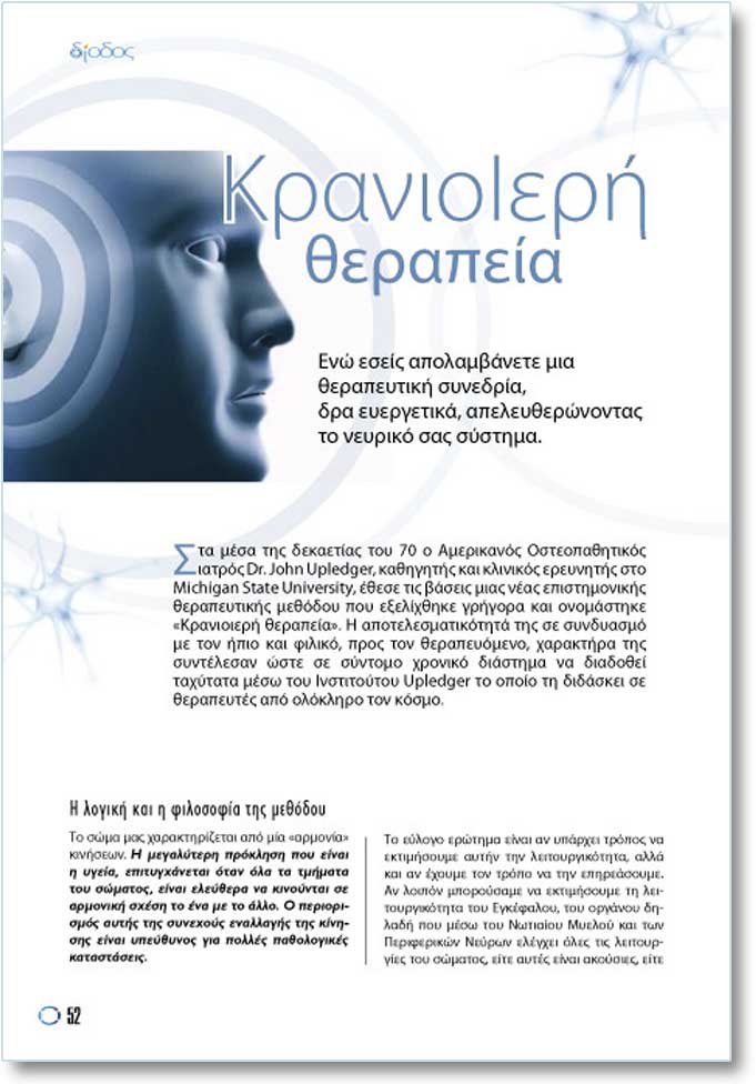 Åíþ åóåßò áðïëáìâÜíåôå ìéá èåñáðåõôéêÞ óõíåäñßá, äñá åõåñãåôéêÜ, áðåëåõèåñþíïíôáò ôï íåõñéêü óáò óýóôçìá. Óôá ìÝóá ôçò äåêáåôßáò ôïõ 70 ï Áìåñéêáíüò Ïóôåïðáèçôéêüò éáôñüò Dr. John Upledger, êáèçãçôÞò êáé êëéíéêüò åñåõíçôÞò óôï Michigan State University, Ýèåóå ôéò âÜóåéò ìéáò íÝáò åðéóôçìïíéêÞò èåñáðåõôéêÞò ìåèüäïõ ðïõ åîåëß÷èçêå ãñÞãïñá êáé ïíïìÜóôçêå «ÊñáíéïéåñÞ èåñáðåßá». Ç áðïôåëåóìáôéêüôçôÜ ôçò óå óõíäõáóìü ìå ôïí Þðéï êáé öéëéêü, ðñïò ôïí èåñáðåõüìåíï, ÷áñáêôÞñá ôçò óõíôÝëåóáí þóôå óå óýíôïìï ÷ñïíéêü äéÜóôçìá íá äéáäïèåß ôá÷ýôáôá ìÝóù ôïõ Éíóôéôïýôïõ Upledger ôï ïðïßï ôç äéäÜóêåé óå èåñáðåõôÝò áðü ïëüêëçñï ôïí êüóìï.