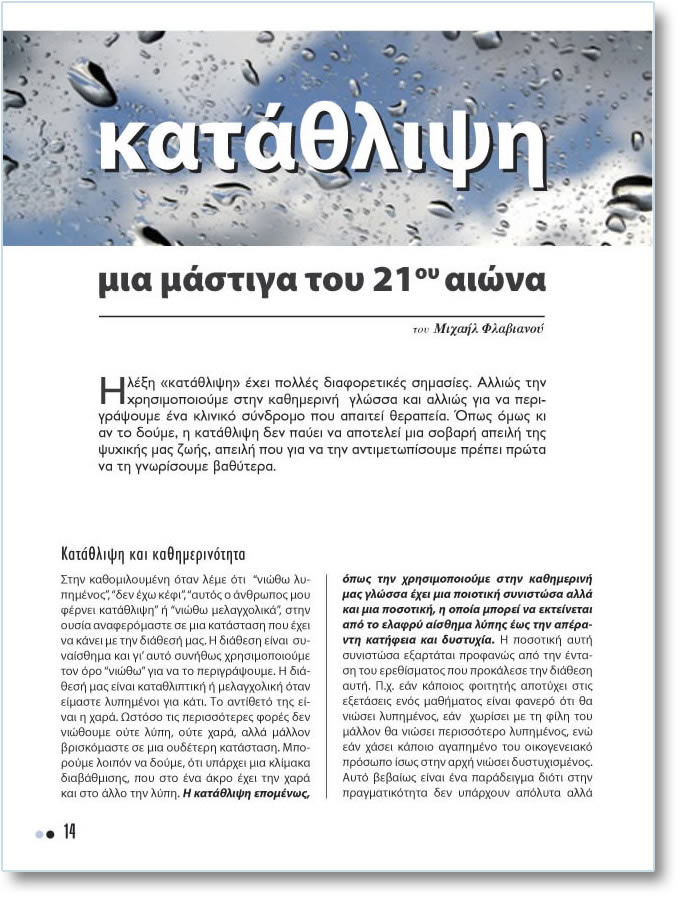 Ç ëÝîç «êáôÜèëéøç» Ý÷åé ðïëëÝò äéáöïñåôéêÝò óçìáóßåò. Áëëéþò ôçí ÷ñçóéìïðïéïýìå óôçí êáèçìåñéíÞ ãëþóóá êáé áëëéþò ãéá íá ðåñéãñÜøïõìå Ýíá êëéíéêü óýíäñïìï ðïõ áðáéôåß èåñáðåßá. ¼ðùò üìùò êé áí ôï äïýìå, ç êáôÜèëéøç äåí ðáýåé íá áðïôåëåß ìéá óïâáñÞ áðåéëÞ ôçò øõ÷éêÞò ìáò æùÞò, áðåéëÞ ðïõ ãéá íá ôçí áíôéìåôùðßóïõìå ðñÝðåé ðñþôá íá ôç ãíùñßóïõìå âáèýôåñá. ÊáôÜèëéøç êáé êáèçìåñéíüôçôá