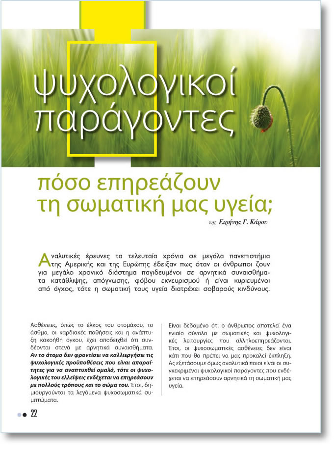 Åßíáé äåäïìÝíï üôé ï Üíèñùðïò áðïôåëåß Ýíá åíéáßï óýíïëï ìå óùìáôéêÝò êáé øõxïëïãéêÝò ëåéôïõñãßåò ðïõ áëëçëïåðçñåÜæïíôáé. ¸ôóé, ïé øõxïóùìáôéêÝò áóèÝíåéåò äåí åßíáé êÜôé ðïõ èá ðñÝðåé íá ìáò ðñïêáëåß Ýêðëçîç.