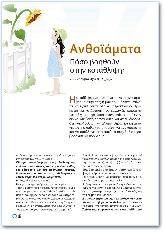AíèïéÜìáôá Ðüóï âïçèïýí óôçí êáôÜèëéøç; Ôçò Ìáñßíáò ÁããåëÞ Ç êáôÜèëéøç áðïôåëåß Ýíá ðïëý óõ÷íü ðñüâëçìá óôçí åðï÷Þ ìáò ðïõ ìÜëéóôá öáßíåôáé íá åîáðëþíåôáé üëï êáé ðåñéóóüôåñï. Ðñüêåéôáé ãéá êáôÜóôáóç ðïõ åìöáíßæåé ïñéóìÝíá ôõðéêÜ ÷áñáêôçñéóôéêÜ, áíáãíùñßóéìá áðü Ýíáí åéäéêü. Ìå âÜóç ëïéðüí áõôÜ êáé áöïý äéáãíùóôåß, áêïëïõèåß ç êáôÜëëçëç èåñáðåõôéêÞ áãùãÞ, þóôå ï ðáèþí íá ìðïñÝóåé íá áíáêïõöéóôåß êáé íá áðáëëáãåß áðü áõôü ôï óõ÷íÜ éäéáßôåñá âáóáíéóôéêü ðñüâëçìá. Áò äïýìå ðñþôá ðïéá åßíáé ôá êõñéüôåñá ÷áñáêôçñéóôéêÜ ôïõ ðñïâëÞìáôïò: ¸ëëåéøç åõ÷áñßóôçóçò, êáêÞ äéÜèåóç êáé áðþëåéá ôïõ åíäéáöÝñïíôïò ãéá æùÞ êáèþò êáé áäéáöïñßá ãéá üóá ðñÜãìáôá, ó÷Ýóåéò, äñáóôçñéüôçôåò êáé áó÷ïëßåò åíäéÝöåñáí êáé Ýäéíáí ÷áñÜ óôï Üôïìï ìÝ÷ñé ôüôå. Ìåëáã÷ïëßá Þ êáé áðåëðéóßá. Ìüíéìï áßóèçìá êïýñáóçò êáé áäõíáìßáò. ÔÜóç ãéá áñíçôéêÝò óêÝøåéò, äõóáñÝóêåéá, ðéêñßá ãéá ôç óõìðåñéöïñÜ ôùí Üëëùí Þ áíôßèåôá, óêÝøåéò áõôïìïìöÞò, åíï÷Ýò êáé ôÜóç íá êáôçãïñåß êáíåßò ôïí åáõôü ôïõ ãéá üëá. Óõ÷íÜ ìåãáëïðïéåß êáíåßò ôéò åõèýíåò ôïõ ãéá áðþëåéåò Þ ëÜèç ôïõ ðáñåëèüíôïò Þ áíáêáëýðôåé ëÜèç êáé åõèýíåò ãéá ôïí åáõôü ôïõ ÷ùñßò íá õðÜñ÷ïõí ðñáãìáôéêÜ. Óôá ðëáßóéá ôçò êáôÜèëéøçò, ï Üíèñùðïò ìðïñåß íá áéóèÜíåôáé ìåãÜëç ìåßùóç ôçò áõôïðåðïßèçóÞò ôïõ, íá íïìßæåé üôé îåí áîßæåé êáé üôé äåí ìðïñåß íá êáôáöÝñåé ôßðïôå. Óõ÷íÜ ìðïñåß íá õðÜñ÷ïõí áõôïêôïíéêÝò óêÝøåéò Þ áêüìá êáé áðüðåéñåò áõôïêôïíßáò. Ôï Üôïìï ìðïñåß íá õðïöÝñåé áðü áûðíßåò Þ áíôßèåôá íá êïéìÜôáé ðÜñá ðïëý. Áêüìç, ßóùò íá Ý÷ïõìå óïâáñÞ åëëÜôùóç ôçò üñåîçò ãéá öáãçôü êáé áðþëåéá âÜñïõò Þ áíôßèåôá ìåãáëýôåñç áíÜãêç ãéá öáãçôü êáé áýîçóç ôïõ óùìáôéêïý âÜñïõò. Óå ðïëëÝò ðåñéðôþóåéò, ç êáôÜèëéøç äåí åßíáé éäéáßôåñá óïâáñÞ êáé ïé Üíèñùðïé ôçí õößóôáíôáé ÷ùñßò íá êÜíïõí ôßðïôå ãéá íá âïçèçèïýí. ¶ëëïôå ðÜëé ðáßñíïõí êÜðïéï áíôéêáôáèëéðôéêü öÜñìáêï áðü êÜðïéï ãéáôñü. |
