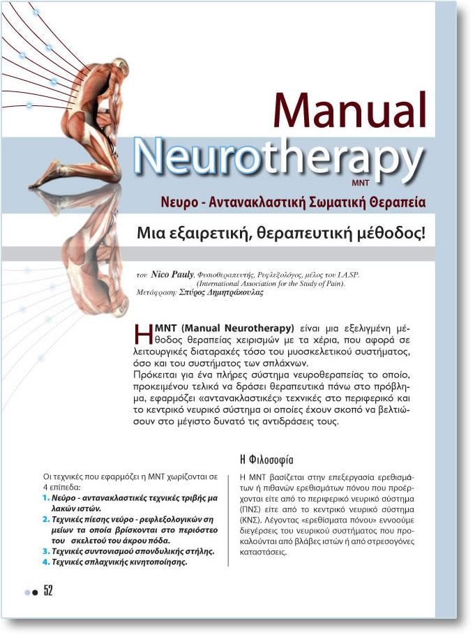 Manual Neurotherapy MNT Íåõñï - ÁíôáíáêëáóôéêÞ ÓùìáôéêÞ ÈåñáðåßáÌéá åîáéñåôéêÞ, èåñáðåõôéêÞ ìÝèïäïò ôïõ Nico Pauly, ÖõóéïèåñáðåõôÞò, Ñåöëåîïëüãïò, ìÝëïò ôïõ I.A.SP. (International Association for the Study of Pain) Ç MNT åßíáé ìéá åîåëéãìÝíç ìÝèïäïò èåñáðåßáò ÷åéñéóìþí ìå ôá ÷Ýñéá, ðïõ áöïñÜ óå ëåéôïõñãéêÝò äéáôáñá÷Ýò ôüóï ôïõ ìõïóêåëåôéêïý óõóôÞìáôïò, üóï êáé ôïõ óõóôÞìáôïò ôùí óðëÜ÷íùí. Ðñüêåéôáé ãéá Ýíá ðëÞñåò óýóôçìá íåõñïèåñáðåßáò ôï ïðïßï, ðñïêåéìÝíïõ ôåëéêÜ íá äñÜóåé èåñáðåõôéêÜ ðÜíù óôï ðñüâëçìá, åöáñìüæåé «áíôáíáêëáóôéêÝò» ôå÷íéêÝò óôï ðåñéöåñéêü êáé ôï êåíôñéêü íåõñéêü óýóôçìá ïé ïðïßåò Ý÷ïõí óêïðü íá âåëôéþóïõí óôï ìÝãéóôï äõíáôü ôéò áíôéäñÜóåéò ôïõò. Ïé ôå÷íéêÝò ðïõ åöáñìüæåé ç ÌÍÔ ÷ùñßæïíôáé óå 4 åðßðåäá: 1. Íåýñï - áíôáíáêëáóôéêÝò ôå÷íéêÝò ôñéâÞò ìáëáêþí éóôþí. 2. Ôå÷íéêÝò ðßåóçò íåýñï - ñåöëåîïëïãéêþí óçìåßùí ôá ïðïßá âñßóêïíôáé óôï ðåñéüóôåï ôïõ óêåëåôïý ôïõ Üêñïõ ðüäá. 3. Ôå÷íéêÝò óõíôïíéóìïý óðïíäõëéêÞò óôÞëçò. 4. Ôå÷íéêÝò óðëá÷íéêÞò êéíçôïðïßçóçò. Ç Öéëïóïößá Ç ÌNT âáóßæåôáé óôçí åðåîåñãáóßá åñåèéóìÜôùí Þ ðéèáíþí åñåèéóìÜôùí ðüíïõ ðïõ ðñïÝñ÷ïíôáé åßôå áðü ôï ðåñéöåñéêü íåõñéêü óýóôçìá (ÐÍÓ) åßôå áðü ôï êåíôñéêü íåõñéêü óýóôçìá (ÊÍÓ). ËÝãïíôáò «åñåèßóìáôá ðüíïõ» åííïïýìå äéåãÝñóåéò ôïõ íåõñéêïý óõóôÞìáôïò ðïõ ðñïêáëïýíôáé áðü âëÜâåò éóôþí Þ áðü óôñåóïãüíåò êáôáóôÜóåéò. |