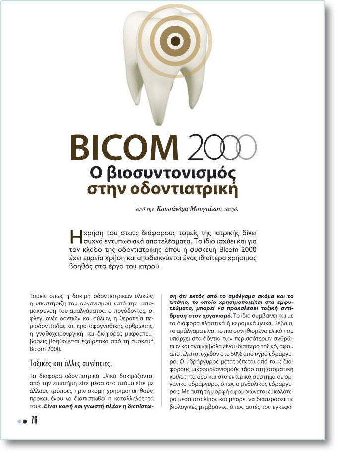 ÂÉCOM 2000 Ï âéïóõíôïíéóìüò óôçí ïäïíôéáôñéêÞ Áðü ôçí ÊáóóÜíäñá ÌïõãéÜêïõ, éáôñü. H ÷ñÞóç ôçò óôïõò äéÜöïñïõò ôïìåßò ôçò éáôñéêÞò äßíåé óõ÷íÜ åíôõðùóéáêÜ áðïôåëÝóìáôá. Ôï ßäéï éó÷ýåé êáé ãéá ôïí êëÜäï ôçò ïäïíôéáôñéêÞò üðïõ ç óõóêåõÞ Bicom 2000 Ý÷åé åõñåßá ÷ñÞóç êáé áðïäåéêíýåôáé Ýíáò éäéáßôåñá ÷ñÞóéìïò âïçèüò óôï Ýñãï ôïõ éáôñïý. Ôïìåßò üðùò ç äïêéìÞ ïäïíôéáôñéêþí õëéêþí, ç õðïóôÞñéîç ôïõ ïñãáíéóìïý êáôÜ ôçí áðïìÜêñõíóç ôïõ áìáëãÜìáôïò, ï ðïíüäïíôïò, ïé öëåãìïíÝò äïíôéþí êáé ïýëùí, ç èåñáðåßá ðåñéïäïíôßôéäáò êáé êñïôáöïãíáèéêÞò Üñèñùóçò, ç ãíáèï÷åéñïõñãéêÞ êáé äéÜöïñåò ìéêñïåðåìâÜóåéò âïçèïýíôáé åîáéñåôéêÜ áðü ôç óõóêåõÞ Âicom 2000. ÔïîéêÝò êáé Üëëåò óõíÝðåéåò. Ôá äéÜöïñá ïäïíôéáôñéêÜ õëéêÜ äïêéìÜæïíôáé áðü ôçí åðéóôÞìç åßôå ìÝóá óôï óôüìá åßôå ìå Üëëïõò ôñüðïõò ðñéí áêüìç ÷ñçóéìïðïéçèïýí, ðñïêåéìÝíïõ íá äéáðéóôùèåß ç êáôáëëçëüôçôÜ ôïõò. Åßíáé êïéíÞ êáé ãíùóôÞ ðëÝïí ç äéáðßóôùóç üôé åêôüò áðü ôï áìÜëãáìá áêüìá êáé ôï ôéôÜíéï, ôï ïðïßï ÷ñçóéìïðïéåßôáé óôá åìöõôåýìáôá, ìðïñåß íá ðñïêáëÝóåé ôïîéêÞ áíôßäñáóç óôïí ïñãáíéóìü. Ôï ßäéï óõìâáßíåé êáé ìå ôá äéÜöïñá ðëáóôéêÜ Þ êåñáìéêÜ õëéêÜ. ÂÝâáéá, ôï áìÜëãáìá åßíáé ôï ðéï óõíçèéóìÝíï õëéêü ðïõ õðÜñ÷åé óôá äüíôéá ôùí ðåñéóóüôåñùí áíèñþðùí êáé áíáìößâïëá åßíáé éäéáßôåñï ôïîéêü, áöïý áðïôåëåßôáé ó÷åäüí óôï 50% áðü õãñü õäñÜñãõñï. Ï õäñÜñãõñïò ìåôáôñÝðåôáé áðü ôïõò äéÜöïñïõò ìéêñïïñãáíéóìïýò ôüóï óôç óôïìáôéêÞ êïéëüôçôá üóï êáé óôï åíôåñéêü óýóôçìá óå ïñãáíéêü õäñÜñãõñï, üðùò ï ìåèõëéêüò õäñÜñãõñïò. Ìå áõôÞ ôç ìïñöÞ áöïìïéþíåôáé åõêïëüôåñá ìÝóá óôï ëßðïò êáé ìðïñåß íá äéáðåñÜóåé ôéò âéïëïãéêÝò ìåìâñÜíåò, üðùò áõôÝò ôïõ åãêåöÜëïõ êáé ôïõ ðëáêïýíôá, ìå éäéáßôåñá äõóÜñåóôåò óõíÝðåéåò. (ÔÏ ÃÊÑÉÆÏ ÊÅÉÌÅÍÏ ÅÉÍÁÉ Ç ÏËÏÊËÇÑÙÓÇ ÔÇÓ ÐÑÏÔÁÓÇÓ ÓÔÇÍ ÅÐÏÌÅÍÇ ÓÅËÉÄÁ ÔÇÓ ÅÍÔÕÐÇÓ ÅÊÄÏÓÇÓ) |