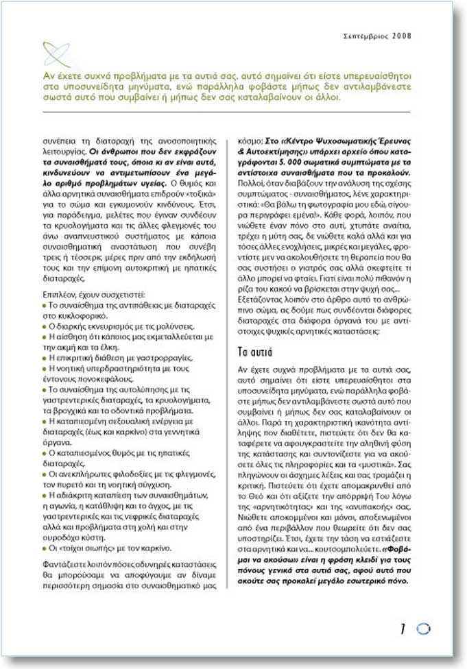 ÖáíôÜæåóôå ëïéðüí ðüóåò ïäõíçñÝò êáôáóôÜóåéò èá ìðïñïýóáìå íá áðïöýãïõìå áí äßíáìå ðåñéóóüôåñç óçìáóßá óôï óõíáéóèçìáôéêü ìáò êüóìï; Óôï «ÊÝíôñï Øõ÷ïóùìáôéêÞò ¸ñåõíáò & Áõôïåêôßìçóçò» õðÜñ÷åé áñ÷åßï üðïõ êáôáãñÜöïíôáé 5. 000 óùìáôéêÜ óõìðôþìáôá ìå ôá áíôßóôïé÷á óõíáéóèÞìáôá ðïõ ôá ðñïêáëïýí. Ðïëëïß, üôáí äéáâÜæïõí ôçí áíÜëõóç ôçò ó÷Ýóçò óõìðôþìáôïò - óõíáéóèÞìáôïò, ëÝíå ÷áñáêôçñéóôéêÜ: «Èá âÜëù ôç öùôïãñáößá ìïõ åäþ, óßãïõñá ðåñéãñÜöåé åìÝíá!». ÊÜèå öïñÜ, ëïéðüí, ðïõ íéþèåôå Ýíáí ðüíï óôï áõôß, ÷ôõðÜôå áíáßôéá, ôñÝ÷åé ç ìýôç óáò, äå íéþèåôå êáëÜ áëëÜ êáé ãéá ôüóåò Üëëåò åíï÷ëÞóåéò, ìéêñÝò êáé ìåãÜëåò, öñïíôßóôå ìåí íá áêïëïõèÞóåôå ôç èåñáðåßá ðïõ èá óáò óõóôÞóåé ï ãéáôñüò óáò áëëÜ óêåöôåßôå ôé Üëëï ìðïñåß íá öôáßåé. Ãéáôß åßíáé ðïëý ðéèáíüí ç ñßæá ôïõ êáêïý íá âñßóêåôáé óôçí øõ÷Þ óáò... ÅîåôÜæïíôáò ëïéðüí óôï Üñèñï áõôü ôï áíèñþðéíï óþìá, áò äïýìå ðùò óõíäÝïíôáé äéÜöïñåò äéáôáñá÷Ýò óôá äéÜöïñá üñãáíÜ ôïõ ìå áíôßóôïé÷åò øõ÷éêÝò áñíçôéêÝò êáôáóôÜóåéò: Ôá áõôéÜ