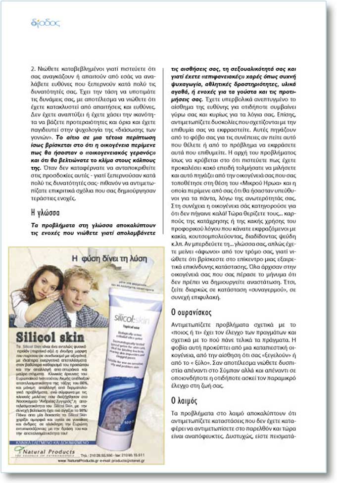 Ôá ðñïâëÞìáôá óôç ãëþóóá áðïêáëýðôïõí ôéò åíï÷Ýò ðïõ íéþèåôå ãéáôß áðïëáìâÜíåôå ôéò áéóèÞóåéò óáò, ôç óåîïõáëéêüôçôÜ óáò êáé ãéáôß Ý÷åôå «åðéöáíåéáêÝò» ÷áñÝò üðùò óõ÷íÞ øõ÷áãùãßá, áèëçôéêÝò äñáóôçñéüôçôåò, õëéêÜ áãáèÜ, Þ åíï÷Ýò ãéá ôá ãïýóôá êáé ôéò ðñïôéìÞóåéò óáò. ¸÷åôå õðåñâïëéêÜ áíåðôõãìÝíï ôï áßóèçìá ôçò åõèýíçò ãéá ïôéäÞðïôå óõìâáßíåé ãýñù óáò êáé êõñßùò ãéá ôá ëüãéá óáò. Åðßóçò, áíôéìåôùðßæåôå äõóêïëßåò ðïõ ó÷åôßæïíôáé ìå ôçí åðéèõìßá óáò íá åêöñáóôåßôå. ÁõôÝò ðçãÜæïõí áðü ôï öüâï óáò ãéá ôéò óõíÝðåéåò áí ðåßôå áõôü ðïõ èÝëåôå Þ áðü ôï ðñüâëçìá íá åêöñÜóåôå áõôÜ ðïõ åðéèõìåßôå. Ç áñ÷Þ ôïõ ðñïâëÞìáôïò ßóùò íá êñýâåôáé óôï üôé ðéóôåýåôå ðùò Ý÷åôå ðñïêáëÝóåé êáêü åðåéäÞ ôïëìÞóáôå íá ìéëÞóåôå êáé áõôü ðçãÜæåé áðü ôçí ïéêïãÝíåéÜ óáò ðïõ óáò ôïðïèÝôçóå óôç èÝóç ôïõ «Ìéêñïý Çñùá» êáé ç ïðïßá ðåñßìåíå áðü óáò üôé èá Þóáóôáí õðåýèõíïé ãéá ôá ðÜíôá, ëüãù ôçò áíùôåñüôçôÜò óáò. Óôç óõíÝ÷åéá ç ïéêïãÝíåéá óÜò êáôçãïñïýóå ãéá üôé äåí ðÞãáéíå êáëÜ! Ôþñá èåñßæåôå ôïõò... êáñðïýò ôçò êáôÜ÷ñçóçò Þ ôçò êáêÞò ÷ñÞóçò ôïõ ðñïöïñéêïý ëüãïõ ðïõ êÜíáôå åêöñáæüìåíïé ìå êáêßá, êïõôóïìðïëåýïíôáò, äéáäßäïíôáò øåýäç ê.ëð. Áí ìðåñäåýåôå ôç... ãëþóóá óáò, áðëþò Ý÷åôå ìåßíåé «Üöùíïé» áðü ôïí ôñüìï óáò, ãéáôß íéþèåôå üôé âñßóêåóôå óôï åðßêåíôñï ìéáò åîáéñåôéêÜ åðéêßíäõíçò êáôÜóôáóçò. ¼ëá Üñ÷éóáí óôçí ïéêïãÝíåéÜ óáò ðïõ óáò ðÝñáóå ôï ìÞíõìá üôé äåí ðñÝðåé íá äçìéïõñãåßôå áíáóôÜôùóç. ¸ôóé, æåßôå äéáñêþò óå êáôÜóôáóç «óõíáãåñìïý», óå óõíå÷Þ åðéöõëáêÞ.