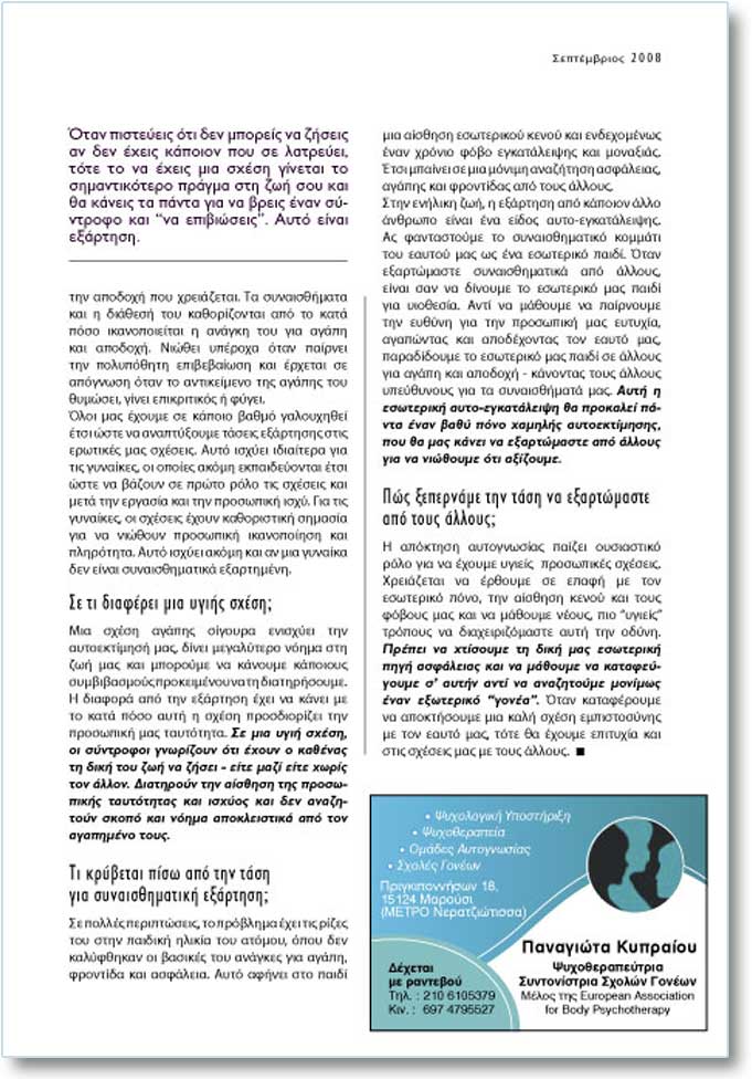 ôçí áðïäï÷Þ ðïõ ÷ñåéÜæåôáé. Ôá óõíáéóèÞìáôá êáé ç äéÜèåóÞ ôïõ êáèïñßæïíôáé áðü ôï êáôÜ ðüóï éêáíïðïéåßôáé ç áíÜãêç ôïõ ãéá áãÜðç êáé áðïäï÷Þ. Íéþèåé õðÝñï÷á üôáí ðáßñíåé ôçí ðïëõðüèçôç åðéâåâáßùóç êáé Ýñ÷åôáé óå áðüãíùóç üôáí ôï áíôéêåßìåíï ôçò áãÜðçò ôïõ èõìþóåé, ãßíåé åðéêñéôéêüò Þ öýãåé. ¼ëïé ìáò Ý÷ïõìå óå êÜðïéï âáèìü ãáëïõ÷çèåß Ýôóé þóôå íá áíáðôýîïõìå ôÜóåéò åîÜñôçóçò óôéò åñùôéêÝò ìáò ó÷Ýóåéò. Áõôü éó÷ýåé éäéáßôåñá ãéá ôéò ãõíáßêåò, ïé ïðïßåò áêüìç åêðáéäåýïíôáé Ýôóé þóôå íá âÜæïõí óå ðñþôï ñüëï ôéò ó÷Ýóåéò êáé ìåôÜ ôçí åñãáóßá êáé ôçí ðñïóùðéêÞ éó÷ý. Ãéá ôéò ãõíáßêåò, ïé ó÷Ýóåéò Ý÷ïõí êáèïñéóôéêÞ óçìáóßá ãéá íá íéþèïõí ðñïóùðéêÞ éêáíïðïßçóç êáé ðëçñüôçôá. Áõôü éó÷ýåé áêüìç êáé áí ìéá ãõíáßêá äåí åßíáé óõíáéóèçìáôéêÜ åîáñôçìÝíç. Óå ôé äéáöÝñåé ìéá õãéÞò ó÷Ýóç; Ìéá ó÷Ýóç áãÜðçò óßãïõñá åíéó÷ýåé ôçí áõôïåêôßìçóÞ ìáò, äßíåé ìåãáëýôåñï íüçìá óôç æùÞ ìáò êáé ìðïñïýìå íá êÜíïõìå êÜðïéïõò óõìâéâáóìïýò ðñïêåéìÝíïõ íá ôç äéáôçñÞóïõìå. Ç äéáöïñÜ áðü ôçí åîÜñôçóç Ý÷åé íá êÜíåé ìå ôï êáôÜ ðüóï áõôÞ ç ó÷Ýóç ðñïóäéïñßæåé ôçí ðñïóùðéêÞ ìáò ôáõôüôçôá. Óå ìéá õãéÞ ó÷Ýóç, ïé óýíôñïöïé ãíùñßæïõí üôé Ý÷ïõí ï êáèÝíáò ôç äéêÞ ôïõ æùÞ íá æÞóåé - åßôå ìáæß åßôå ÷ùñßò ôïí Üëëïí. Äéáôçñïýí ôçí áßóèçóç ôçò ðñïóùðéêÞò ôáõôüôçôáò êáé éó÷ýïò êáé äåí áíáæçôïýí óêïðü êáé íüçìá áðïêëåéóôéêÜ áðü ôïí áãáðçìÝíï ôïõò. Ôé êñýâåôáé ðßóù áðü ôçí ôÜóç ãéá óõíáéóèçìáôéêÞ åîÜñôçóç;