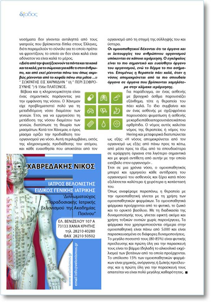 (ÔÏ ÃÊÑÉÆÏ ÊÅÉÌÅÍÏ ÅÉÍÁÉ Ç ÁÑ×Ç ÔÇÓ ÐÑÏÔÁÓÇÓ ÁÐÏ ÔÇÍ ÐÑÏÇÃÏÕÌÅÍÇ ÓÅËÉÄÁ ÔÇÓ ÅÍÔÕÐÇÓ ÅÊÄÏÓÇÓ) ÅîÜëëïõ áõôü åßíáé êáé ç áéôßá ðïõ ôá ðåñéóóüôåñá íïóÞìáôá äåí ãßíïíôáé áíôéëçðôÜ áðü ôïõò ãéáôñïýò ðïõ âñßóêïíôáé äßðëá óôïõò ¸ëëçíåò, äéüôé ðáñáìåëïýí ôï óýíïëï ãéá ôï ïðïßï ðñÝðåé íá öñïíôßæïõí, ôï ïðïßï áí äåí åßíáé êáëÜ åßíáé áäýíáôïí íá åßíáé êáëÜ ôï ìÝñïò. «Äéüôé áðü ôçí øõ÷Þ îåêéíïýí ôá ðÜíôá êáé ôá êáêÜ êáé ôá êáëÜ, ãéá ôï óþìá êáé ãéá êÜèå ôé óôïí Üíèñùðï, êáé áðü åêåß ñß÷íïíôáé ðÜíù ôïõ üðùò áêñéâþò ñß÷íïíôáé áðü ôï êåöÜëé ðÜíù óôá ìÜôéá ...» ‘‘ ÓÙÊÑÁÔÇÓ ÅÉÓ ×ÁÑÌÉÄÇÍ ’’ (Þ ‘‘ ÐÅÑÉ ÓÙÖÑÏÓÕÍÇÓ ’’) § 156e ÐËÁÔÙÍÏÓ. ÂÝâáéá êáé ç êëçñïíïìéêüôçôá åßíáé Ýíáò óçìáíôéêüò ðáñÜãïíôáò ãéá ôçí åìöÜíéóç ôçò íüóïõ. Ï ×Üíåìáí åß÷å ðñïâëçìáôéóôåß ðïëý ãéá ôç ìåôáäéäüìåíç íüóï äéáìÝóïõ ôùí ãåíåþí. ¸ôóé, ãéá íá åñìçíåýóåé ôç ìåôÜäïóç ôçò íüóïõ äéáìÝóïõ ôùí ãåíåþí, äéáôýðùóå ôç èåùñßá ôùí ìéáóìÜôùí. ÊáôÜ ôïí ×Üíåìáí, ï üñïò ìßáóìá ïñßæåé ôçí ðñïäéÜèåóç ôïõ ïñãáíéóìïý ãéá íüóï. ÁõôÞ ðåñéëáìâÜíåé, åêôüò ôçò êëçñïíïìéêÞò ðñïäéÜèåóçò ôïõ áôüìïõ, êáé êÜèå åõáéóèçóßá ðïõ áðïêôÜôáé áðü ôïí ïñãáíéóìü áðü ôç óôéãìÞ ôçò óýëëçøÞò ôïõ êáé ýóôåñá. Ïé ïìïéïðáèçôéêïß äÝ÷ïíôáé üôé ôá üñãáíá êáé ïé ëåéôïõñãßåò ôïõ áíèñþðéíïõ ïñãáíéóìïý õðüêåéíôáé óå êÜðïéá éåñÜñ÷çóç. Ï åãêÝöáëïò åßíáé ôï ðéï óçìáíôéêü êáé åõáßóèçôï üñãáíï ôïõ ïñãáíéóìïý, åíþ ôï äÝñìá ôï ðéï áóÞìáíôï. ÅðïìÝíùò ç èåñáðåßá ðÜåé êáëÜ, üôáí ç íüóïò áðïìáêñýíåôáé áðü ôá ðéï óðïõäáßá üñãáíá óå üñãáíá ðïõ âñßóêïíôáé ÷áìçëüôåñá óôçí êëßìáêá éåñÜñ÷çóçò. Ãéá ðáñÜäåéãìá, áí Ýíáò áóèåíÞò ìå âñïã÷éêü Üóèìá ðáñïõóéÜæåé åîÜíèçìá, ôüôå ç èåñáðåßá ôïõ ðÜåé êáëÜ. Ôï ßäéï óõìâáßíåé êáé áí Ýíáò áóèåíÞò ìå ó÷éæïöñÝíåéá ðáñïõóéÜóåé öõìáôßùóç Þ áóèåíÞò ìå êáñäéïðÜèåéá ðáñïõóéÜóåé êÜðïéá áñèñßôéäá. Ï íüìïò áõôüò êáëåßôáé íüìïò ôçò èåñáðåßáò Þ íüìïò ôïõ Hering êáé ìåôáöïñéêÜ äéáôõðþíåôáé ùò åîÞò: «Ç íüóïò áðïìáêñýíåôáé áðü ôïí ïñãáíéóìü ùò åîÞò: áðü ðÜíù ðñïò ôá êÜôù, áðü ìÝóá ðñïò ôá Ýîù, áðü ôá óðïõäáéüôåñá óå éåñÜñ÷çóç üñãáíá óôá ëéãüôåñï óçìáíôéêÜ êáé ìå öïñÜ áíôßèåôç áðü áõôÞí ìå ôçí ïðïßá åéóÝâáëå óôïí ïñãáíéóìü» . ¸ôóé óå ìéá ÷ñüíéá íüóï, ï ïìïéïðáèçôéêüò ìðïñåß êáé åñìçíåýåé êÜèå áíôßäñáóç ôïõ ïñãáíéóìïý ôïõ áóèåíïýò êáé îÝñåé êáôÜ ðüóï åîåëßóóåôáé êáëýôåñá Þ ÷åéñüôåñá ç êáôÜóôáóÞ ôïõ. ¼ðùò áíáöÝñáìå ðáñáðÜíù, ç èåñáðåßá ìå ôçí ïìïéïðáèçôéêÞ ãßíåôáé ìå ôç ÷ñÞóç ôùí ïìïéïðáèçôéêþí öáñìÜêùí. Ôá ïìïéïðáèçôéêÜ öÜñìáêá ðñïÝñ÷ïíôáé áðü ôï öõôéêü, ôï æùéêü êáé ôï ïñõêôü âáóßëåéï. Ìå ôç äéáäéêáóßá ôçò äõíáìïðïßçóÞò ôïõò, ãßíåôáé åöéêôÞ áêüìá êáé ÷ñÞóç ôïîéêþí ïõóéþí ÷ùñßò ðáñåíÝñãåéåò. Ôá öÜñìáêá ðïõ ÷ñçóéìïðïéïýíôáé óÞìåñá óôçí ïìïéïðáèçôéêÞ åßíáé ðÜíù áðü 5.000 êáé åßíáé ðáñáóêåõáóìÝíá óå äéÜöïñåò äõíáìïðïéÞóåéò. Ôï ìåãÜëï ðïóïóôü ôïõò (80-85%) åßíáé öõôéêÞò ðñïÝëåõóçò êáé ðñþôç ýëç ãéá ôçí ðáñáóêåõÞ ôïõò åßíáé ôï âÜììá (äçëáäÞ ôï áëêïïëéêü åê÷ýëéóìá) ôùí âïôÜíùí áðü ôá ïðïßá ðñïÝñ÷ïíôáé. Ôï õðüëïéðï 15% ôùí ïìïéïðáèçôéêþí öáñìÜêùí åßíáé ÷çìéêÞò, áíüñãáíçò Þ æùúêÞò ðñïÝëåõóçò êáé ç ðñþôç ýëç ãéá ôçí ðáñáóêåõÞ ôïõò áðáéôåßôáé íá åßíáé ðïëý ìåãÜëçò êáèáñüôçôáò.
