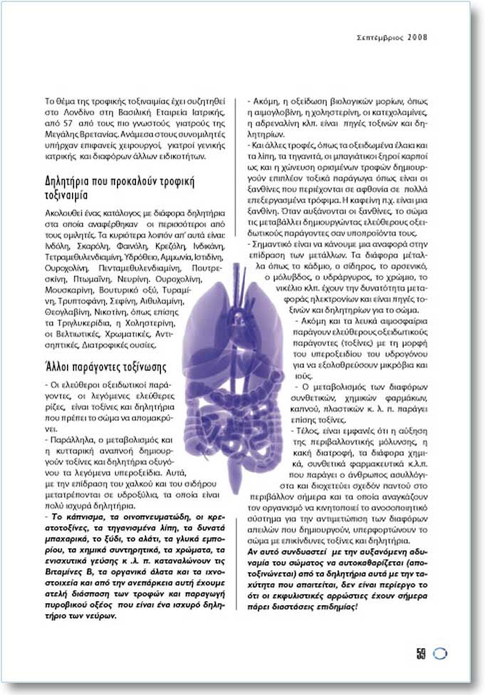 - Ïé åëåýèåñïé ïîåéäùôéêïß ðáñÜãïíôåò, ïé ëåãüìåíåò åëåýèåñåò ñßæåò, åßíáé ôïîßíåò êáé äçëçôÞñéá ðïõ ðñÝðåé ôï óþìá íá áðïìáêñýíåé. - ÐáñÜëëçëá, ï ìåôáâïëéóìüò êáé ç êõôôáñéêÞ áíáðíïÞ äçìéïõñãïýí ôïîßíåò êáé äçëçôÞñéá ïîõãüíïõ ôá ëåãüìåíá õðåñïîåßäéá. ÁõôÜ, ìå ôçí åðßäñáóç ôïõ ÷áëêïý êáé ôïõ óéäÞñïõ ìåôáôñÝðïíôáé óå õäñïîýëéá, ôá ïðïßá åßíáé ðïëý éó÷õñÜ äçëçôÞñéá. - Ôï êÜðíéóìá, ôá ïéíïðíåõìáôþäç, ïé êñåáôïôïîßíåò, ôá ôçãáíéóìÝíá ëßðç, ôá äõíáôÜ ìðá÷áñéêÜ, ôï îýäé, ôï áëÜôé, ôá ãëõêÜ åìðïñßïõ, ôá ÷çìéêÜ óõíôçñçôéêÜ, ôá ÷ñþìáôá, ôá åíéó÷õôéêÜ ãåýóçò ê .ë. ð. êáôáíáëþíïõí ôéò Âéôáìßíåò Â, ôá ïñãáíéêÜ Üëáôá êáé ôá é÷íïóôïé÷åßá êáé áðü ôçí áíåðÜñêåéá áõôÞ Ý÷ïõìå áôåëÞ äéÜóðáóç ôùí ôñïöþí êáé ðáñáãùãÞ ðõñïâéêïý ïîÝïò ðïõ åßíáé Ýíá éó÷õñü äçëçôÞñéï ôùí íåýñùí. - Áêüìç, ç ïîåßäùóç âéïëïãéêþí ìïñßùí, üðùò ç áéìïãëïâßíç, ç ÷ïëçóôåñßíç, ïé êáôå÷ïëáìßíåò, ç áäñåíáëßíç êëð. åßíáé ðçãÝò ôïîéíþí êáé äçëçôçñßùí. - Êáé Üëëåò ôñïöÝò, üðùò ôá ïîåéäùìÝíá Ýëáéá êáé ôá ëßðç, ôá ôçãáíéôÜ, ïé ìðáãéÜôéêïé îçñïß êáñðïß ùò êáé ç ÷þíåõóç ïñéóìÝíùí ôñïöþí äçìéïõñãïýí åðéðëÝïí ôïîéêÜ ðáñÜãùãá üðùò åßíáé ïé îáíèßíåò ðïõ ðåñéÝ÷ïíôáé óå áöèïíßá óå ðïëëÜ åðåîåñãáóìÝíá ôñüöéìá. Ç êáöåßíç ð.÷. åßíáé ìéá îáíèßíç. ¼ôáí áõîÜíïíôáé ïé îáíèßíåò, ôï óþìá ôéò ìåôáâÜëëåé äçìéïõñãþíôáò åëåýèåñïõò ïîåéäùôéêïýò ðáñÜãïíôåò óáí õðïðñïúüíôá ôïõò. - Óçìáíôéêü åßíáé íá êÜíïõìå ìéá áíáöïñÜ óôçí åðßäñáóç ôùí ìåôÜëëùí. Ôá äéÜöïñá ìÝôáëëá üðùò ôï êÜäìéï, ï óßäçñïò, ôï áñóåíéêü, ï ìüëõâäïò, ï õäñÜñãõñïò, ôï ÷ñþìéï, ôï íéêÝëéï êëð. Ý÷ïõí ôçí äõíáôüôçôá ìåôáöïñÜò çëåêôñïíßùí êáé åßíáé ðçãÝò ôïîéíþí êáé äçëçôçñßùí ãéá ôï óþìá. - Áêüìç êáé ôá ëåõêÜ áéìïóöáßñéá ðáñÜãïõí åëåýèåñïõò ïîåéäùôéêïýò ðáñÜãïíôåò (ôïîßíåò) ìå ôç ìïñöÞ ôïõ õðåñïîåéäßïõ ôïõ õäñïãüíïõ ãéá íá åîïëïèñåýóïõí ìéêñüâéá êáé éïýò. - Ï ìåôáâïëéóìüò ôùí äéáöüñùí óõíèåôéêþí, ÷çìéêþí öáñìÜêùí, êáðíïý, ðëáóôéêþí ê. ë. ð. ðáñÜãåé åðßóçò ôïîßíåò. - ÔÝëïò, åßíáé åìöáíÝò üôé ç áýîçóç ôçò ðåñéâáëëïíôéêÞò ìüëõíóçò, ç êáêÞ äéáôñïöÞ, ôá äéÜöïñá ÷çìéêÜ, óõíèåôéêÜ öáñìáêåõôéêÜ ê.ë.ð. ðïõ ðáñÜãåé ï Üíèñùðïò áóõëëüãéóôá êáé äéï÷åôåýåé ó÷åäüí ðáíôïý óôï ðåñéâÜëëïí óÞìåñá êáé ôá ïðïßá áíáãêÜæïõí ôïí ïñãáíéóìü íá êéíçôïðïéåß ôï áíïóïðïéçôéêü óýóôçìá ãéá ôçí áíôéìåôþðéóç ôùí äéáöüñùí áðåéëþí ðïõ äçìéïõñãïýí, õðåñöïñôþíïõí ôï óþìá ìå åðéêßíäõíåò ôïîßíåò êáé äçëçôÞñéá. Áí áõôü óõíäõáóôåß ìå ôçí áõîáíüìåíç áäõíáìßá ôïõ óþìáôïò íá áõôïêáèáñßæåôáé (áðïôïîéíþíåôáé) áðü ôá äçëçôÞñéá áõôÜ ìå ôçí ôá÷ýôçôá ðïõ áðáéôåßôáé, äåí åßíáé ðåñßåñãï ôï üôé ïé åêöõëéóôéêÝò áññþóôéåò Ý÷ïõí óÞìåñá ðÜñåé äéáóôÜóåéò åðéäçìßáò!