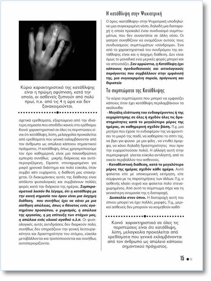 (ÔÏ ÃÊÑÉÆÏ ÊÅÉÌÅÍÏ ÅÉÍÁÉ Ç ÁÑ×Ç ÔÇÓ ÐÑÏÔÁÓÇÓ ÁÐÏ ÔÇÍ ÐÑÏÇÃÏÕÌÅÍÇ ÓÅËÉÄÁ ÔÇÓ ÅÍÔÕÐÇÓ ÅÊÄÏÓÇÓ) Áõôü âåâáßùò åßíáé Ýíá ðáñÜäåéãìá äéüôé óôçí ðñáãìáôéêüôçôá äåí õðÜñ÷ïõí áðüëõôá áëëÜ ó÷åôéêÜ åñåèßóìáôá, åîáñôþìåíá áðü ôçí éäéáßôåñç óçìáóßá ðïõ áðïäßäåé êáíåßò óôï åñÝèéóìá. Êïéíü ÷áñáêôçñéóôéêü óå üëåò ôéò ðåñéðôþóåéò åßíáé üôé êáôÜèëéøç, ëýðç, ìåëáã÷ïëßá ðñïêáëåßôáé áðü åñåèßóìáôá ðïõ ãåíéêÜ åêëáìâÜíïíôáé áðü ôïí Üíèñùðï ùò áðþëåéá êÜðïéïõ óçìáíôéêïý ðñÜãìáôïò. Ç êáôÜèëéøç, üðùò ÷ñçóéìïðïéïýìå ôïí üñï êáèçìåñéíÜ, åßíáé ìéá ðáíáíèñþðéíç åìðåéñßá óõíÞèùò ìéêñÞò äéÜñêåéáò êáé áõôü-ðåñéïñéæüìåíç. Åßìáóôå óôåíá÷ùñçìÝíïé ãéá ìéêñü ÷ñïíéêü äéÜóôçìá êáé ðïëý åýêïëá, üôáí óõìâåß êÜôé åõ÷Üñéóôï, ç äéÜèåóÞ ìáò åðáíÝñ÷åôáé. Ïé äéáêõìÜíóåéò áõôÝò ôçò äéÜèåóçò åßíáé áðüëõôá öõóéïëïãéêÝò êáé óõìâáßíïõí ðïëëÝò öïñÝò êáôÜ ôçí äéÜñêåéá ôçò çìÝñáò. ÓõìðåñáóìáôéêÜ ëïéðüí èá ëÝãáìå, üôé ç êáôÜèëéøç ìå ôçí êïéíÞ óçìáóßá ôïõ üñïõ åßíáé ìéá Üó÷çìç äéÜèåóç, ðïõ óõíÞèùò Ý÷åé íá êÜíåé ìå ìéá áßóèçóç áðþëåéáò, üðùò ï èÜíáôïò åíüò áãáðçìÝíïõ ðñïóþðïõ, ï ÷ùñéóìüò, ç áðþëåéá ôçò åñãáóßáò, ç ìç åðßôåõîç ôùí óôü÷ùí ìáò, ç áðþëåéá åíüò õëéêïý áãáèïý ê.ë.ð. Ïé öõóéïëïãéêÝò áõôÝò áíôéäñÜóåéò äåí äéáñêïýí ðïëý, óõíÞèùò äåí åðçñåÜæïõí ôçí ãåíéêÞ ëåéôïõñãéêüôçôá êáé äñáóôçñéüôçôá ôïõ áôüìïõ, åýêïëá ìåôáâÜëëïíôáé êáé ôñïðïðïéïýíôáé êáé óõíÞèùò áõôïðåñéïñßæïíôáé. H êáôÜèëéøç óôçí Øõ÷éáôñéêÞ