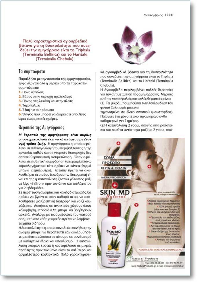 Ç èåñáðåßá ôçò áìçíüññïéáò åßíáé êõñßùò õðïóôçñéêôéêÞ êáé Ý÷åé íá êÜíåé Üìåóá ìå Ýíáí õãéÞ ôñüðï æùÞò. Ç áìçíüññïéá ç ïðïßá ïöåßëåôáé óå ðéèáíÞ áëëáãÞ ôïõ ðåñéâÜëëïíôïò Þ ôçò åñãáóßáò êáèþò êáé óå íåõñéêÝò äéáôáñá÷Ýò äåí áðáéôåß èåñáðåõôéêÞ áíôéìåôþðéóç. ¼ôáí ïöåßëåôáé óå ðáèçôéêÞ óõìöüñçóç (õðåñáéìßá) ëüãù «êñõïëïãÞìáôïò» ôüôå ðñÝðåé íá êÜíåôå èåñìÜ ìðÜíéá (áôìüëïõôñá). Êáôüðéí ðñÝðåé íá áêïëïõèåß ìéá ðåñßïäïò îåêïýñáóçò. ÅõåñãåôéêÞ åßíáé åðßóçò ç êáôáíÜëùóç æåóôïý ãÜëáêôïò ìáæß ìå ëßãï «Saffron» ðñéí ôïí ýðíï êáé ôïõëÜ÷éóôïí ãéá 2 åâäïìÜäåò. Óå ðåñßðôùóç áíáéìßáò êáé êáêÞò äéáôñïöÞò, èá ðñÝðåé íá âãáßíåôå óôïí êáèáñü áÝñá, íá áêïëïõèÞóåôå ìéá èñåðôéêÞ äéáôñïöÞ êáé íá îåêïõñÜæåóôå. ÁóêÞóåéò óå áíïéêôïýò ÷þñïõò üðùò êïëýìâçóç, éððáóßá ê.ëð. ìðïñåß íá âïçèÞóïõí áñêåôÜ. ÁíÜëïãá ìå ôéò óõìâïõëÝò ôïõ ãéáôñïý óáò, ìåôÜ áðü êÜèå ãåýìá èá ðñÝðåé íá ëáìâÜíåôå ÷Üðéá óéäÞñïõ. Ç äõóêïéëéüôçôá ç ïðïßá óõíïäåýåé óõíÞèùò ôçí áíáéìßá ìðïñåß íá èåñáðåõôåß åÜí áêïëïõèÞóåôå ìéá äßáéôá ðëïýóéá óå ðßôïõñï óå óõíäõáóìü ìå êáèáñôéêÜ Ýëáéá êáé õðïêëõóìü. Ç êáôáíÜëùóç óðüñùí spolax Þ êáóôïñÝëáéïõ óå ìéêñÝò ðïóüôçôåò ðñéí ôïí ýðíï åßíáé ôï êáëýôåñï êáé áóöáëÝóôåñï êáèáñêôéêü. Ðïëý ÷áñáêôçñéóôéêÜ áãéïõñâåäéêÜ âüôáíá ãéá ôç äõóêïéëéüôçôá ðïõ óõíåäåýåé ôçí áìçíüññïéá åßíáé ôï Triphala (Terminalia Bellirica) êáé ôï Haritaki (Terminalia Chebula). Ç ÁãéïõñâÝäá ðåñéëáìâÜíåé ðïëëÝò èåñáðåßåò ãéá ôçí áíôéìåôþðéóç ôçò áìçíüññïéáò. ÌåñéêÝò áðü ôéò ðéï áóöáëåßò êáé áðëÝò èåñáðåßåò åßíáé: (1) Ôá ìéêñÜ ìðïõìðïýêéá ôùí ëïõëïõäéþí ôïõ öõôïý Calotropis procera ôçãáíéóìÝíá óå Ýëáéï óéíáðéïý (ìïõóôÜñäáò). Ðáßñíåôå Ýíá ìüíï ôÝôïéï ôçãáíéóìÝíï áíèü êáèçìåñéíÜ ãéá 7 çìÝñåò. (2) Ç êáôáíÜëùóç 2 ãñáì., óêüíçò áðü ñáðáíÜêéá êáé êáñüôá áíôßóôïé÷á ìáæß ìå 2 ãñáì., óêüíçò ôñéãùíÝëëáò (óõíïëéêÜ Üñá 6 ãñáì., óêüíçò) åðáíáöÝñåé ôçí åììçíïññõóßá. Ôï ìßãìá ðñÝðåé íá ôï ëáìâÜíåôå ãéá ìßá ó÷åäüí åâäïìÜäá.