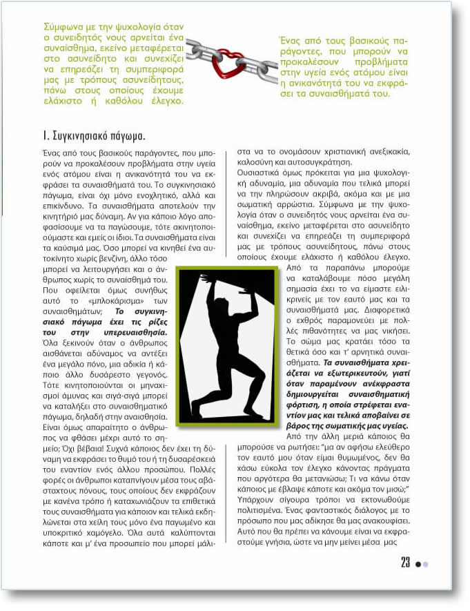 1. ¸íáò áðü ôïõò âáóéêïýò ðáñÜãïíôåò, ðïõ ìðïñïýí íá ðñïêáëÝóïõí ðñïâëÞìáôá óôçí õãåßá åíüò áôüìïõ åßíáé ç áíéêáíüôçôÜ ôïõ íá åêöñÜóåé ôá óõíáéóèÞìáôÜ ôïõ. Ôï óõãêéíçóéáêü ðÜãùìá, åßíáé ü÷é ìüíï åíï÷ëçôéêü, áëëÜ êáé åðéêßíäõíï. Ôá óõíáéóèÞìáôá áðïôåëïýí ôçí êéíçôÞñéü ìáò äýíáìç. Áí ãéá êÜðïéï ëüãï áðïöáóßóïõìå íá ôá ðáãþóïõìå, ôüôå áêéíçôïðïéïýìáóôå êáé åìåßò ïé ßäéïé. Ôá óõíáéóèÞìáôá åßíáé ôá êáýóéìÜ ìáò. ¼óï ìðïñåß íá êéíçèåß Ýíá áõôïêßíçôï xùñßò âåíæßíç, Üëëï ôüóï ìðïñåß íá ëåéôïõñãÞóåé êáé ï Üíèñùðïò xùñßò ôo óõíáßóèçìÜ ôïõ.
