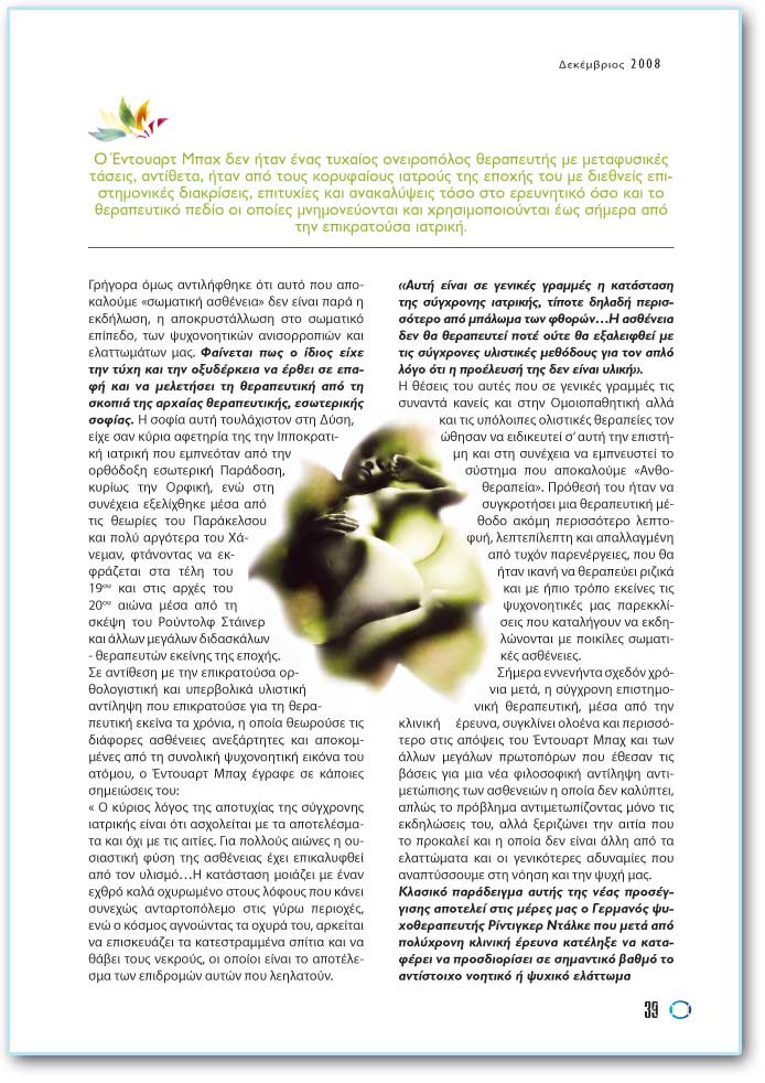 ÃñÞãïñá üìùò áíôéëÞöèçêå üôé áõôü ðïõ áðïêáëïýìå «óùìáôéêÞ áóèÝíåéá» äåí åßíáé ðáñÜ ç åêäÞëùóç, ç áðïêñõóôÜëëùóç óôï óùìáôéêü åðßðåäï, ôùí øõ÷ïíïçôéêþí áíéóïññïðéþí êáé åëáôôùìÜôùí ìáò. Öáßíåôáé ðùò ï ßäéïò åß÷å ôçí ôý÷ç êáé ôçí ïîõäÝñêåéá íá Ýñèåé óå åðáöÞ êáé íá ìåëåôÞóåé ôç èåñáðåõôéêÞ áðü ôç óêïðéÜ ôçò áñ÷áßáò èåñáðåõôéêÞò, åóùôåñéêÞò óïößáò. Ç óïößá áõôÞ ôïõëÜ÷éóôïí óôç Äýóç, åß÷å óáí êýñéá áöåôçñßá ôçò ôçí ÉððïêñáôéêÞ éáôñéêÞ ðïõ åìðíåüôáí áðü ôçí ïñèüäïîç åóùôåñéêÞ ÐáñÜäïóç, êõñßùò ôçí ÏñöéêÞ, åíþ óôç óõíÝ÷åéá åîåëß÷èçêå ìÝóá áðü ôéò èåùñßåò ôïõ ÐáñÜêåëóïõ êáé ðïëý áñãüôåñá ôïõ ×Üíåìáí, öôÜíïíôáò íá åêöñÜæåôáé óôá ôÝëç ôïõ 19ïõ êáé óôéò áñ÷Ýò ôïõ 20ïõ áéþíá ìÝóá áðü ôç óêÝøç ôïõ Ñïýíôïëö ÓôÜéíåñ êáé Üëëùí ìåãÜëùí äéäáóêÜëùí - èåñáðåõôþí åêåßíçò ôçò åðï÷Þò. Óå áíôßèåóç ìå ôçí åðéêñáôïýóá ïñèïëïãéóôéêÞ êáé õðåñâïëéêÜ õëéóôéêÞ áíôßëçøç ðïõ åðéêñáôïýóå ãéá ôç èåñáðåõôéêÞ åêåßíá ôá ÷ñüíéá, ç ïðïßá èåùñïýóå ôéò äéÜöïñåò áóèÝíåéåò áíåîÜñôçôåò êáé áðïêïììÝíåò áðü ôç óõíïëéêÞ øõ÷ïíïçôéêÞ åéêüíá ôïõ áôüìïõ, ï ¸íôïõáñô Ìðá÷ Ýãñáöå óå êÜðïéåò óçìåéþóåéò ôïõ: « Ï êýñéïò ëüãïò ôçò áðïôõ÷ßáò ôçò óýã÷ñïíçò éáôñéêÞò åßíáé üôé áó÷ïëåßôáé ìå ôá áðïôåëÝóìáôá êáé ü÷é ìå ôéò áéôßåò. Ãéá ðïëëïýò áéþíåò ç ïõóéáóôéêÞ öýóç ôçò áóèÝíåéáò Ý÷åé åðéêáëõöèåß áðü ôïí õëéóìü…Ç êáôÜóôáóç ìïéÜæåé ìå Ýíáí å÷èñü êáëÜ ï÷õñùìÝíï óôïõò ëüöïõò ðïõ êÜíåé óõíå÷þò áíôáñôïðüëåìï óôéò ãýñù ðåñéï÷Ýò, åíþ ï êüóìïò áãíïþíôáò ôá ï÷õñÜ ôïõ, áñêåßôáé íá åðéóêåõÜæåé ôá êáôåóôñáììÝíá óðßôéá êáé íá èÜâåé ôïõò íåêñïýò, ïé ïðïßïé åßíáé ôï áðïôÝëåóìá ôùí åðéäñïìþí áõôþí ðïõ ëåçëáôïýí. «ÁõôÞ åßíáé óå ãåíéêÝò ãñáììÝò ç êáôÜóôáóç ôçò óýã÷ñïíçò éáôñéêÞò, ôßðïôå äçëáäÞ ðåñéóóüôåñï áðü ìðÜëùìá ôùí öèïñþí…Ç áóèÝíåéá äåí èá èåñáðåõôåß ðïôÝ ïýôå èá åîáëåéöèåß ìå ôéò óýã÷ñïíåò õëéóôéêÝò ìåèüäïõò ãéá ôïí áðëü ëüãï üôé ç ðñïÝëåõóÞ ôçò äåí åßíáé õëéêÞ». Ç èÝóåéò ôïõ áõôÝò ðïõ óå ãåíéêÝò ãñáììÝò ôéò óõíáíôÜ êáíåßò êáé óôçí ÏìïéïðáèçôéêÞ áëëÜ êáé ôéò õðüëïéðåò ïëéóôéêÝò èåñáðåßåò ôïí þèçóáí íá åéäéêåõôåß ó’ áõôÞ ôçí åðéóôÞìç êáé óôç óõíÝ÷åéá íá åìðíåõóôåß ôï óýóôçìá ðïõ áðïêáëïýìå «Áíèïèåñáðåßá». ÐñüèåóÞ ôïõ Þôáí íá óõãêñïôÞóåé ìéá èåñáðåõôéêÞ ìÝèïäï áêüìç ðåñéóóüôåñï ëåðôïöõÞ, ëåðôåðßëåðôç êáé áðáëëáãìÝíç áðü ôõ÷üí ðáñåíÝñãåéåò, ðïõ èá Þôáí éêáíÞ íá èåñáðåýåé ñéæéêÜ êáé ìå Þðéï ôñüðï åêåßíåò ôéò øõ÷ïíïçôéêÝò ìáò ðáñåêêëßóåéò ðïõ êáôáëÞãïõí íá åêäçëþíïíôáé ìå ðïéêßëåò óùìáôéêÝò áóèÝíåéåò. ÓÞìåñá åííåíÞíôá ó÷åäüí ÷ñüíéá ìåôÜ, ç óýã÷ñïíç åðéóôçìïíéêÞ èåñáðåõôéêÞ, ìÝóá áðü ôçí êëéíéêÞ Ýñåõíá, óõãêëßíåé ïëïÝíá êáé ðåñéóóüôåñï óôéò áðüøåéò ôïõ ¸íôïõáñô Ìðá÷ êáé ôùí Üëëùí ìåãÜëùí ðñùôïðüñùí ðïõ Ýèåóáí ôéò âÜóåéò ãéá ìéá íÝá öéëïóïöéêÞ áíôßëçøç áíôéìåôþðéóçò ôùí áóèåíåéþí ç ïðïßá äåí êáëýðôåé, áðëþò ôï ðñüâëçìá áíôéìåôùðßæïíôáò ìüíï ôéò åêäçëþóåéò ôïõ, áëëÜ îåñéæþíåé ôçí áéôßá ðïõ ôï ðñïêáëåß êáé ç ïðïßá äåí åßíáé Üëëç áðü ôá åëáôôþìáôá êáé ïé ãåíéêüôåñåò áäõíáìßåò ðïõ áíáðôýóóïõìå óôç íüçóç êáé ôçí øõ÷Þ ìáò. Êëáóéêü ðáñÜäåéãìá áõôÞò ôçò íÝáò ðñïóÝããéóçò áðïôåëåß óôéò ìÝñåò ìáò ï Ãåñìáíüò øõ÷ïèåñáðåõôÞò Ñßíôéãêåñ ÍôÜëêå ðïõ ìåôÜ áðü ðïëý÷ñïíç êëéíéêÞ Ýñåõíá êáôÝëçîå íá êáôáöÝñåé íá ðñïóäéïñßóåé óå óçìáíôéêü âáèìü ôï áíôßóôïé÷ï íïçôéêü Þ øõ÷éêü åëÜôôùìá Þ ôá åëáôôþìáôá ðïõ êñýâïíôáé ðßóù áðü ôéò óùìáôéêÝò áóèÝíåéåò. Ïé ÝñåõíÝò ôïõ âñßóêïíôáé äçìïóéåõìÝíåò êáé áðïôåëïýí Ýíá óç