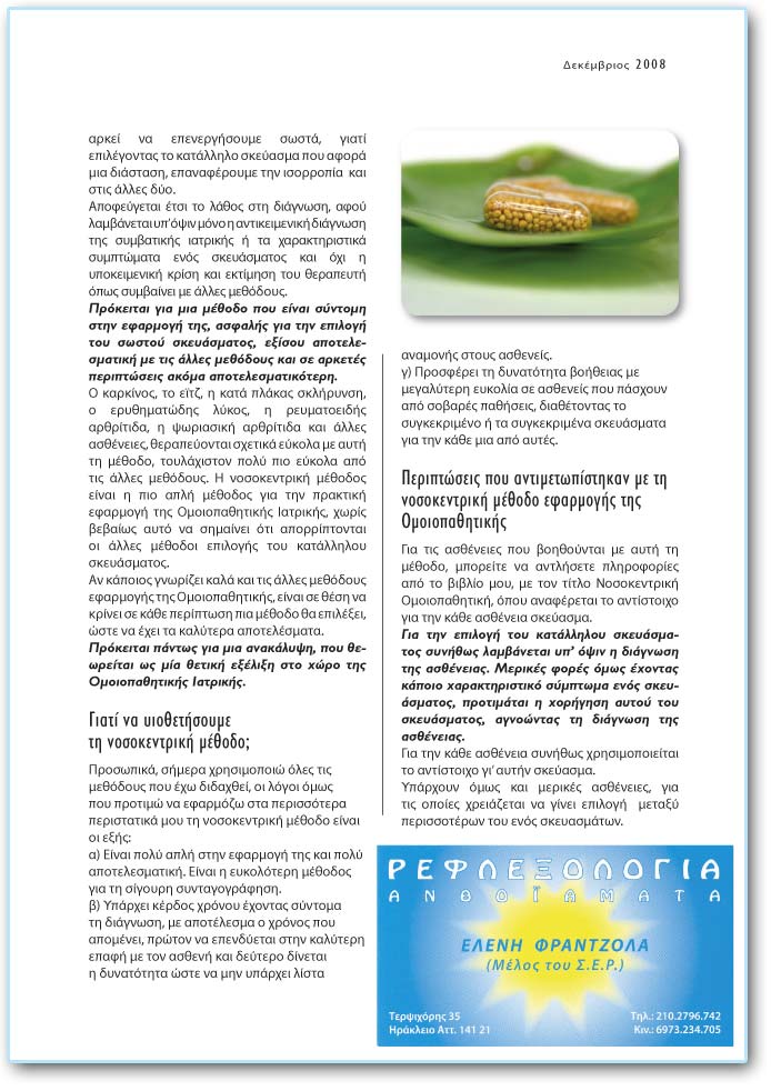 Ç äéÜãíùóç ôçò óõìâáôéêÞò éáôñéêÞò, Þ ôá ÷áñáêôçñéóôéêÜ óõìðôþìáôá óôá ïðïßá óôçñßæåôáé ç íïóïêåíôñéêÞ ìÝèïäïò, ìðïñåß íá åóôéÜæïíôáé óå ïðïéáäÞðïôå äéÜóôáóç. Äåí Ý÷åé óçìáóßá óå ðéá äéÜóôáóç ôïõ áíèñþðïõ èá åðåíåñãÞóïõìå, áñêåß íá åðåíåñãÞóïõìå óùóôÜ, ãéáôß åðéëÝãïíôáò ôï êáôÜëëçëï óêåýáóìá ðïõ áöïñÜ ìéá äéÜóôáóç, åðáíáöÝñïõìå ôçí éóïññïðßá êáé óôéò Üëëåò äýï. Áðïöåýãåôáé Ýôóé ôï ëÜèïò óôç äéÜãíùóç, áöïý ëáìâÜíåôáé õð’ üøéí ìüíï ç áíôéêåéìåíéêÞ äéÜãíùóç ôçò óõìâáôéêÞò éáôñéêÞò Þ ôá ÷áñáêôçñéóôéêÜ óõìðôþìáôá åíüò óêåõÜóìáôïò êáé ü÷é ç õðïêåéìåíéêÞ êñßóç êáé åêôßìçóç ôïõ èåñáðåõôÞ üðùò óõìâáßíåé ìå Üëëåò ìåèüäïõò. Ðñüêåéôáé ãéá ìéá ìÝèïäï ðïõ åßíáé óýíôïìç óôçí åöáñìïãÞ ôçò, áóöáëÞò ãéá ôçí åðéëïãÞ ôïõ óùóôïý óêåõÜóìáôïò, åîßóïõ áðïôåëåóìáôéêÞ ìå ôéò Üëëåò ìåèüäïõò êáé óå áñêåôÝò ðåñéðôþóåéò áêüìá áðïôåëåóìáôéêüôåñç. Ï êáñêßíïò, ôï åúôæ, ç êáôÜ ðëÜêáò óêëÞñõíóç, ï åñõèçìáôþäçò ëýêïò, ç ñåõìáôïåéäÞò áñèñßôéäá, ç øùñéáóéêÞ áñèñßôéäá êáé Üëëåò áóèÝíåéåò, èåñáðåýïíôáé ó÷åôéêÜ åýêïëá ìå áõôÞ ôç ìÝèïäï, ôïõëÜ÷éóôïí ðïëý ðéï åýêïëá áðü ôéò Üëëåò ìåèüäïõò. Ç íïóïêåíôñéêÞ ìÝèïäïò åßíáé ç ðéï áðëÞ ìÝèïäïò ãéá ôçí ðñáêôéêÞ åöáñìïãÞ ôçò ÏìïéïðáèçôéêÞò ÉáôñéêÞò, ÷ùñßò âåâáßùò áõôü íá óçìáßíåé üôé áðïññßðôïíôáé ïé Üëëåò ìÝèïäïé åðéëïãÞò ôïõ êáôÜëëçëïõ óêåõÜóìáôïò. Áí êÜðïéïò ãíùñßæåé êáëÜ êáé ôéò Üëëåò ìåèüäïõò åöáñìïãÞò ôçò ÏìïéïðáèçôéêÞò, åßíáé óå èÝóç íá êñßíåé óå êÜèå ðåñßðôùóç ðéá ìÝèïäï èá åðéëÝîåé, þóôå íá Ý÷åé ôá êáëýôåñá áðïôåëÝóìáôá. Ðñüêåéôáé ðÜíôùò ãéá ìéá áíáêÜëõøç, ðïõ èåùñåßôáé ùò ìßá èåôéêÞ åîÝëéîç óôï ÷þñï ôçò ÏìïéïðáèçôéêÞò ÉáôñéêÞò. Ãéáôß íá õéïèåôÞóïõìå ôç íïóïêåíôñéêÞ ìÝèïäï; á) Åßíáé ðïëý áðëÞ óôçí åöáñìïãÞ ôçò êáé ðïëý áðïôåëåóìáôéêÞ. Åßíáé ç åõêïëüôåñç ìÝèïäïò ãéá ôç óßãïõñç óõíôáãïãñÜöçóç. â) ÕðÜñ÷åé êÝñäïò ÷ñüíïõ Ý÷ïíôáò óýíôïìá ôç äéÜãíùóç, ìå áðïôÝëåóìá ï ÷ñüíïò ðïõ áðïìÝíåé, ðñþôïí íá åðåíäýåôáé óôçí êáëýôåñç åðáöÞ ìå ôïí áóèåíÞ êáé äåýôåñï äßíåôáé ç äõíáôüôçôá þóôå íá ìçí õðÜñ÷åé ëßóôá áíáìïíÞò óôïõò áóèåíåßò. ã) ÐñïóöÝñåé ôç äõíáôüôçôá âïÞèåéáò ìå ìåãáëýôåñç åõêïëßá óå áóèåíåßò ðïõ ðÜó÷ïõí áðü óïâáñÝò ðáèÞóåéò, äéáèÝôïíôáò ôï óõãêåêñéìÝíï Þ ôá óõãêåêñéìÝíá óêåõÜóìáôá ãéá ôçí êÜèå ìéá áðü áõôÝò. Ðåñéðôþóåéò ðïõ áíôéìåôùðßóôçêáí ìå ôç íïóïêåíôñéêÞ ìÝèïäï åöáñìïãÞò ôçò ÏìïéïðáèçôéêÞò Ãéá ôçí åðéëïãÞ ôïõ êáôÜëëçëïõ óêåõÜóìáôïò óõíÞèùò ëáìâÜíåôáé õð’ üøéí ç äéÜãíùóç ôçò áóèÝíåéáò. ÌåñéêÝò öïñÝò üìùò Ý÷ïíôáò êÜðïéï ÷áñáêôçñéóôéêü óýìðôùìá åíüò óêåõÜóìáôïò, ðñïôéìÜôáé ç ÷ïñÞãçóç áõôïý ôïõ óêåõÜóìáôïò, áãíïþíôáò ôç äéÜãíùóç ôçò áóèÝíåéáò. Ãéá ôçí êÜèå áóèÝíåéá óõíÞèùò ÷ñçóéìïðïéåßôáé ôï áíôßóôïé÷ï ãé’ áõôÞí óêåýáóìá. ÕðÜñ÷ïõí üìùò êáé ìåñéêÝò áóèÝíåéåò, ãéá ôéò ïðïßåò ÷ñåéÜæåôáé íá ãßíåé åðéëïãÞ ìåôáîý ðåñéóóïôÝñùí ôïõ åíüò óêåõáóìÜôùí. |