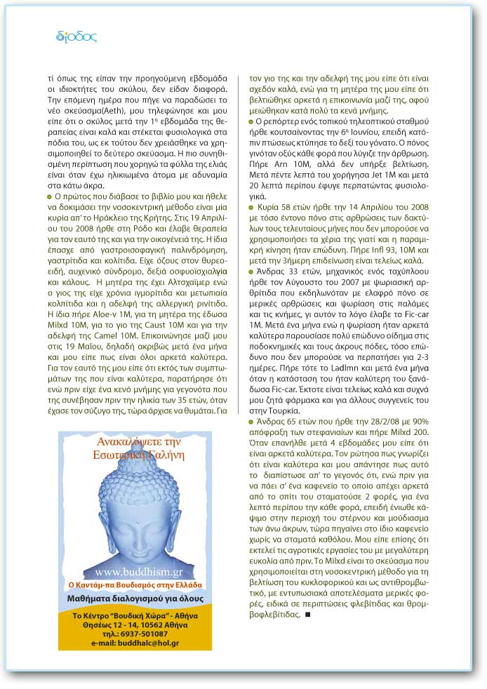 - Ìßá öéëüæùïò áóèåíÞò, æÞôçóå ôç âïÞèåéÜ ìïõ ãéá Ýíá óêýëï ðïõ äåí ìðïñïýóå íá óôáèåß óôá ðéóéíÜ ôïõ ðüäéá. Ôçò Ýäùóá Elia-f 10M êáé ôçò õðÝäåéîá ðùò èá ôï ÷ïñçãÞóåé. ÌåôÜ 2 åâäïìÜäåò ìïõ æÞôçóå Üëëï óêåýáóìá, ãéáôß üðùò ôçò åßðáí ôçí ðñïçãïýìåíç åâäïìÜäá ïé éäéïêôÞôåò ôïõ óêýëïõ, äåí åßäáí äéáöïñÜ. Ôçí åðüìåíç çìÝñá ðïõ ðÞãå íá ðáñáäþóåé ôï íÝï óêåýáóìá (Aeth), ìïõ ôçëåöþíçóå êáé ìïõ åßðå üôé ï óêýëïò ìåôÜ ôçí 1ç åâäïìÜäá ôçò èåñáðåßáò åßíáé êáëÜ êáé óôÝêåôáé öõóéïëïãéêÜ óôá ðüäéá ôïõ, ùò åê ôïýôïõ äåí ÷ñåéÜóèçêå íá ÷ñçóéìïðïéçèåß ôï äåýôåñï óêåýáóìá Ç ðéï óõíçèéóìÝíç ðåñßðôùóç ðïõ ÷ïñçãþ ôá öýëëá ôçò åëéÜò åßíáé üôáí Ý÷ù çëéêéùìÝíá Üôïìá ìå áäõíáìßá óôá êÜôù Üêñá. - Ï ðñþôïò ðïõ äéÜâáóå ôï âéâëßï ìïõ êáé Þèåëå íá äïêéìÜóåé ôçí íïóïêåíôñéêÞ ìÝèïäï åßíáé ìßá êõñßá áð’ ôï ÇñÜêëåéï ôçò ÊñÞôçò. Óôéò 19 Áðñéëßïõ ôïõ 2008 Þñèå óôç Ñüäï êáé Ýëáâå èåñáðåßá ãéá ôïí åáõôü ôçò êáé ãéá ôçí ïéêïãÝíåéÜ ôçò. Ç ßäéá Ýðáó÷å áðü ãáóôñïéóïöáãéêÞ ðáëéíäñüìçóç, ãáóôñßôéäá êáé êïëßôéäá. Åß÷å üæïõò óôïí èõñåïåéäÞ, áõ÷åíéêü óýíäñïìï, äåîéÜ oóöõïúó÷éáëãßá êáé êÜëïõò. Ç ìçôÝñá ôçò Ý÷åé Áëôó÷áúìåñ åíþ ï ãéïò ôçò åß÷å ÷ñüíéá éãìïñßôéäá êáé ìåôùðéáßá êïëðßôéäá êáé ç áäåëöÞ ôçò áëëåñãéêÞ ñéíßôéäá. Ç ßäéá ðÞñå Aloe-v 1M, ãéá ôç ìçôÝñá ôçò Ýäùóá Milxd 10Ì, ãéá ôï ãéï ôçò Caust 10Ì êáé ãéá ôçí áäåëöÞ ôçò Camel 10Ì. Åðéêïéíþíçóå ìáæß ìïõ óôéò 19 ÌáÀïõ, äçëáäÞ áêñéâþò ìåôÜ Ýíá ìÞíá êáé ìïõ åßðå ðùò åßíáé üëïé áñêåôÜ êáëýôåñá. Ãéá ôïí åáõôü ôçò ìïõ åßðå üôé åêôüò ôùí óõìðôùìÜôùí ôçò ðïõ åßíáé êáëýôåñá, ðáñáôÞñçóå üôé åíþ ðñéí åß÷å Ýíá êåíü ìíÞìçò ãéá ãåãïíüôá ðïõ ôçò óõíÝâçóáí ðñéí ôçí çëéêßá ôùí 35 åôþí, üôáí Ý÷áóå ôïí óýæõãï ôçò, ôþñá Üñ÷éóå íá èõìÜôáé. Ãéá ôïí ãéï ôçò êáé ôçí áäåëöÞ ôçò ìïõ åßðå üôé åßíáé ó÷åäüí êáëÜ, åíþ ãéá ôç ìçôÝñá ôçò ìïõ åßðå üôé âåëôéþèçêå áñêåôÜ ç åðéêïéíùíßá ìáæß ôçò, áöïý ìåéþèçêáí êáôÜ ðïëý ôá êåíÜ ìíÞìçò. - Ï ñåðüñôåñ åíüò ôïðéêïý ôçëåïðôéêïý óôáèìïý Þñèå êïõôóáßíïíôáò ôçí 6ç Éïõíßïõ, åðåéäÞ êáôüðéí ðôþóåùò êôýðçóå ôï äåîß ôïõ ãüíáôï. Ï ðüíïò ãéíüôáí ïîýò êÜèå öïñÜ ðïõ ëýãéæå ôçí Üñèñùóç. ÐÞñå Arn 10M, áëëÜ äåí õðÞñîå âåëôßùóç. ÌåôÜ ðÝíôå ëåðôÜ ôïõ ÷ïñÞãçóá Jet 1M êáé ìåôÜ 20 ëåðôÜ ðåñßðïõ Ýöõãå ðåñðáôþíôáò öõóéïëïãéêÜ. - Êõñßá 58 åôþí Þñèå ôçí 14 Áðñéëßïõ ôïõ 2008 ìå ôüóï Ýíôïíï ðüíï óôéò áñèñþóåéò ôùí äáêôýëùí ôïõò ôåëåõôáßïõò ìÞíåò ðïõ äåí ìðïñïýóå íá ÷ñçóéìïðïéÞóåé ôá ÷Ýñéá ôçò ãéáôß êáé ç ðáñáìéêñÞ êßíçóç Þôáí åðþäõíç. ÐÞñå Infl 93, 10M êáé ìåôÜ ôçí 3Þìåñç åðéäåßíùóç åßíáé ôåëåßùò êáëÜ. - ¶íäñáò 33 åôþí, ìç÷áíéêüò åíüò ôá÷ýðëïïõ Þñèå ôïí Áýãïõóôï ôïõ 2007 ìå øùñéáóéêÞ áñèñßôéäá ðïõ åêäçëùíüôáí ìå åëáöñü ðüíï óå ìåñéêÝò áñèñþóåéò êáé øùñßáóç óôéò ðáëÜìåò êáé ôéò êíÞìåò, ãé áõôüí ôï ëüãï Ýëáâå ôï Fic-car 1Ì. ÌåôÜ Ýíá ìÞíá åíþ ç øùñßáóç Þôáí áñêåôÜ êáëýôåñá ðáñïõóßáóå ðïëý åðþäõíï ïßäçìá óôéò ðïäïêíçìéêÝò êáé ôïõò Üêñïõò ðüäåò, ôüóï åðþäõíï ðïõ äåí ìðïñïýóå íá ðåñðáôÞóåé ãéá 2-3 çìÝñåò. ÐÞñå ôüôå ôï Ladlmn êáé ìåôÜ Ýíá ìÞíá üôáí ç êáôÜóôáóç ôïõ Þôáí êáëýôåñç ôïõ îáíÜäùóá Fic-car. ¸êôïôå åßíáé ôåëåßùò êáëÜ êáé óõ÷íÜ ìïõ æçôÜ öÜñìáêá êáé ãéá Üëëïõò óõããåíåßò ôïõ óôçí Ôïõñêßá. - ¶íäñáò 65 åôþí ðïõ Þñèå ôçí 28/2/08 ìå 90% áðüöñáîç ôùí óôåöáíéáßùí êáé ðÞñå Milxd 200. ¼ôáí åðáíÞëèå ìåôÜ 4 åâäïìÜäåò ìïõ åßðå üôé åßíáé áñêåôÜ êáëýôåñá. Ôïí ñþôçóá ðùò ãíùñßæåé üôé åßíáé êáëýôåñá êáé ìïõ áðÜíôçóå ðùò áõôü ôï äéáðßóôùóå áð’ ôï ãåãïíüò üôé, åíþ ðñéí ãéá íá ðÜåé ó’ Ýíá êáöåíåßï ôï ïðïßï áðÝ÷åé áñêåôÜ áðü ôï óðßôé ôïõ óôáìáôïýóå 2 öïñÝò, ãé