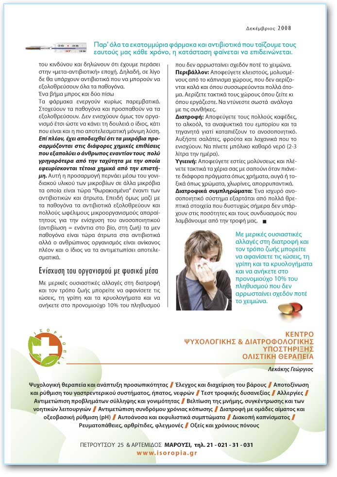 Ç áëüãéóôç ÷ñÞóç ôùí áíôéâéïôéêþí åêôüò ôïõ üôé åîáóèåíåß ôï áíïóïðïéçôéêü óýóôçìá, ðáñÜëëçëá, äçìéïõñãåß êáé «õðÝñ éïýò» ðïõ áíôéóôÝêïíôáé ìå üëï êáé ìåãáëýôåñï ðåßóìá. Ðïëëïß ãéáôñïß êñïýïõí ôïí êþäùíá ôïõ êéíäýíïõ êáé äçëþíïõí üôé Ý÷ïõìå ðåñÜóåé óôçí «ìåôá-áíôéâéïôéêÞ» åðï÷Þ. ÄçëáäÞ, óå ëßãï äå èá õðÜñ÷ïõí áíôéâéïôéêÜ ðïõ íá ìðïñïýí íá åîïëïèñåýóïõí üëá ôá ðáèïãüíá. ¸íá âÞìá ìðñïò êáé äýï ðßóù Ôá öÜñìáêá åíåñãïýí êõñßùò ðáñåìâáôéêÜ. Óôï÷åýïõí ôá ðáèïãüíá êáé ðñïóðáèïýí íá ôá åîïëïèñåýóïõí. Äåí åíéó÷ýïõí üìùò ôïí ïñãáíéóìü Ýôóé þóôå íá êÜíåé ôç äïõëåéÜ ï ßäéïò, êÜôé ðïõ åßíáé êáé ç ðéï áðïôåëåóìáôéêÞ ìüíéìç ëýóç. Åðß ðëÝïí, Ý÷åé áðïäåé÷èåß üôé ôá ìéêñüâéá ðñïóáñìüæïíôáé óôéò äéÜöïñåò ÷çìéêÝò åðéèÝóåéò ðïõ åîáðïëýåé ï Üíèñùðïò åíáíôßïí ôïõò ðïëý ãñçãïñüôåñá áðü ôçí ôá÷ýôçôá ìå ôçí ïðïßá åöåõñßóêïíôáé ôÝôïéá ÷çìéêÜ áðü ôçí åðéóôÞìç. ÁõôÞ ç ðñïóáñìïãÞ ðåñíÜåé ìÝóù ôïõ ãïíéäéáêïý õëéêïý ôùí ìéêñïâßùí óå Üëëá ìéêñüâéá ôá ïðïßá åßíáé ôþñá "èùñáêéóìÝíá" Ýíáíôé ôùí áíôéâéïôéêþí êáé Üôñùôá. ÅðåéäÞ üìùò ìáæß ìå ôá ðáèïãüíá ôá áíôéâéïôéêÜ åîïëïèñåýïõí êáé ðïëëïýò ùöÝëéìïõò ìéêñïïñãáíéóìïýò áðáñáßôçôïõò ãéá ôçí åíßó÷õóç ôïõ áíïóïðïéçôéêïý (áíôéâßùóç = åíÜíôéá óôï âßï, óôç æùÞ) ôá ìåí ðáèïãüíá åßíáé ôþñá Üôñùôá óôá áíôéâéïôéêÜ áëëÜ ï áíèñþðéíïò ïñãáíéóìüò åßíáé áíßêáíïò ðëÝïí êáé ï ßäéïò íá ôá áíôéìåôùðßóåé áðïôåëåóìáôéêÜ. Åíßó÷õóç ôïõ ïñãáíéóìïý ìå öõóéêÜ ìÝóá Ìå ìåñéêÝò ïõóéáóôéêÝò áëëáãÝò óôç äéáôñïöÞ êáé ôïí ôñüðï æùÞò ìðïñåßôå íá áöáíßóåôå ôéò éþóåéò, ôç ãñßðç êáé ôá êñõïëïãÞìáôá êáé íá áíÞêåôå óôï ðñïíïìéïý÷ï 10% ôïõ ðëçèõóìïý ðïõ äåí áññùóôáßíåé ó÷åäüí ðïôÝ ôï ÷åéìþíá. ÐåñéâÜëëïí: Áðïöåýãåôå êëåéóôïýò, ìïëõóìÝíïõò áðü ôï êÜðíéóìá ÷þñïõò, ðïõ äåí áåñßæïíôáé êáëÜ êáé üðïõ óõóóùñåýïíôáé ðïëëÜ Üôïìá. Áåñßæåôå ôáêôéêÜ ôïõò ÷þñïõò üðïõ æåßôå êé üðïõ åñãÜæåóôå. Íá íôýíåóôå óùóôÜ áíÜëïãá ìå ôéò óõíèÞêåò. ÄéáôñïöÞ: Áðïöåýãåôå ôïõò ðïëëïýò êáöÝäåò, ôï áëêïüë, ôá áíáøõêôéêÜ ôïõ åìðïñßïõ êáé ôá ôçãáíçôÜ ãéáôß êáôáðéÝæïõí ôï áíïóïðïéçôéêü. ÁõîÞóôå óáëÜôåò, öñïýôá êáé ëá÷áíéêÜ ðïõ ôï åíéó÷ýïõí. Íá ðßíåôå ìðüëéêï êáèáñü íåñü (2-3 ëßôñá ôçí çìÝñá). ÕãéåéíÞ: Áðïöåýãåôå åóôßåò ìïëýíóåùò êáé ðëÝíåôå ôáêôéêÜ ôá ÷Ýñéá óáò ìå óáðïýíé üôáí ðéÜíåôå äéÜöïñá ðñÜãìáôá üðùò ÷ñÞìáôá, áõãÜ Þ ôïîéêÜ üðùò ÷ñþìáôá, ÷ëùñßíåò, áðïññõðáíôéêÜ. ÄéáôñïöéêÜ óõìðëçñþìáôá: ¸íá éó÷õñü áíïóïðïéçôéêü óýóôçìá åîáñôÜôáé áðü ðïëëÜ èñåðôéêÜ óôïé÷åßá ðïõ äõóôõ÷þò óÞìåñá äåí õðÜñ÷ïõí óôéò ðïóüôçôåò êáé ôïõò óõíäõáóìïýò ðïõ ëáìâÜíïõìå áðü ôçí ôñïöÞ ìáò. * *ÑùôÞóôå ôïí ïñèïìïñéáêü äéáôñïöïëüãï óáò. |