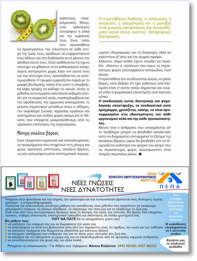 ÁõôÝò ïé ôåëåéïèçñéêÝò óõíÞèåéåò åíéó÷ýïíôáé üôáí ëáìâÜíïõí öéëïöñïíÞóåéò ãéá ôçí áðüäïóÞ ôïõò, ôçí ðéèáíüôçôá êáôÜêôçóçò ìéáò êáëýôåñçò åðáããåëìáôéêÞò èÝóçò, åíüò êáëýôåñïõ óõíôñüöïõ Þ áðëÜ ãéá ôçí åìöÜíéóÞ ôïõò. Åßíáé ôýðïé ðïõ ðñïóðáèïýí íá ðñïóåããßóïõí ôçí ôåëåéüôçôá óå êÜèå ðôõ÷Þ ôçò æùÞò ôïõò, ðñüèõìïé íá åõ÷áñéóôÞóïõí ôïõò Üëëïõò êáé óôç äéáäéêáóßá áõôÞ ÷Üíïõí ôïí áëçèéíü åáõôü ôïõò. ¼ôáí áéóèÜíïíôáé üôé Ý÷ïõí áðïôý÷åé íá öèÜóïõí óôïí êáèïñéóìÝíï óôü÷ï, óõ÷íÜ, êáôçãïñïýí ÷ùñßò ëüãï ôïí åáõôü ôïõò ãéá ôçí áðïôõ÷ßá ôïõò, ðñïóðáèþíôáò íá áõôïôéìùñçèïýí. Ç ôéìùñßá åìöáíßæåôáé óõ÷íÜ ìå ôç ìïñöÞ âïõëéìéêÞò ôÜóçò Ýôóé þóôå ç õðåñâïëéêÞ ëÞøç ôñïöÞò íá êáëýøåé ôá «êåíÜ». ÁõôÝò ïé ìÝèïäïé áõôïôéìùñßáò áðïôåëïýí óïâáñÝò áðåéëÝò ãéá ôç óùìáôéêÞ õãåßá, óõìðåñéëáìâÜíïíôáò ôçí áöõäÜôùóç, ôçí ïñìïíéêÞ áíéóïññïðßá, ôç ìåßùóç óçìáíôéêþí ìÝôáëëùí üðùò ï óßäçñïò, ôïí åêöõëéóìü æùôéêÞò óçìáóßáò ïñãÜíùí êáé óõóôçìÜôùí êáé ðïëëÝò öïñÝò áêüìç êáé ôï èÜíáôï, ðïõ åðÝñ÷åôáé ìáêñïðñüèåóìá, áðü ôéò ïñãáíéêÝò åðéðôþóåéò ôçò ðá÷õóáñêßáò. Ìüíéìç áðþëåéá âÜñïõò Åßíáé åîáéñåôéêÜ óçìáíôéêü êáé áðïôåëåóìáôéêü, ôá ðñïãñÜììáôá ðïõ óôï÷åýïõí óôç ìüíéìç êáé ÷ùñßò áñíçôéêÝò åðéðôþóåéò, áðþëåéá âÜñïõò, íá ìçí åìðåñéÝ÷ïõí ìüíï åðéóôçìïíéêÜ ôåêìçñéùìÝíåò ðëçñïöïñßåò ãéá ôç äéáôñïöÞ, áëëÜ íá êáëýðôïõí åî’ ßóïõ êáé ôçí øõ÷éêÞ óöáßñá. ¶ëëùóôå, ðÜñá ðïëëÜ Ý÷ïõí åéðùèåß ãéá äåêÜäåò «äßáéôåò» Þ «ôñüðïõò» ðïõ üìùò ôéò ðåñéóóüôåñåò öïñÝò áðïôõã÷Üíïõí ðáôáãùäþò. Ãéáôß Üñáãå; Ç ðñïóðÜèåéá ôïõ íá áäõíáôßóåé êáíåßò, íá ÷Üóåé âÜñïò, åßíáé âÝâáéï üôé Ý÷åé êáëýôåñá áðïôåëÝóìáôá üôáí ó’ áõôÞí ðáßæåé óçìáíôéêü êáé åíåñãü ñüëï ç øõ÷ïëïãéêÞ õðïóôÞñéîç áðü êÜðïéïí åéäéêü. Ï óõíäõáóìüò áõôüò äéáéôçôéêÞò êáé øõ÷ïëïãéêÞò õðïóôÞñéîçò, ôï óõíäõáóôéêü áõôü ðñüãñáììá, ÷ñåéÜæåôáé, åðßóçò, íá åßíáé ðñïóáñìïóìÝíï óôéò éäéáéôåñüôçôåò ôïõ êÜèå ïñãáíéóìïý áëëÜ êáé ôçò êÜèå ðñïóùðéêüôçôáò. Ìüíïí Ýôóé ï Üíèñùðïò ðïõ áðáó÷ïëåßôáé áð’ ôï ðñüâëçìá ìðïñåß íá âïçèçèåß êáôáëõôéêÜ, þóôå íá äéá÷åéñéóôåß åðéôõ÷çìÝíá ôï æÞôçìá ôçò áðþëåéáò âÜñïõò, áöïý èá âïçèçèåß óôï íá äéá÷åéñßæåôáé êáëýôåñá ôïí øõ÷éêü ôïõ êüóìï ðïõ ôéò ðåñéóóüôåñåò öïñÝò ðñùôáãùíéóôåß óôçí ýðáñîç ðáñáðÜíù êéëþí. |