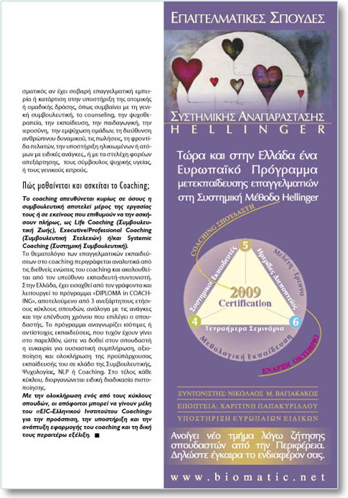 Ôï coaching áðåõèýíåôáé êõñßùò óå üóïõò ç óõìâïõëåõôéêÞ áðïôåëåß ìÝñïò ôçò åñãáóßáò ôïõò Þ óå åêåßíïõò ðïõ åðéèõìïýí íá ôçí áóêÞóïõí ðëÞñùò, ùò Life Coaching (ÓõìâïõëåõôéêÞ ÆùÞò), Executive/Professional Coaching (ÓõìâïõëåõôéêÞ Óôåëå÷þí) Þ/êáé Systemic Coaching (ÓõóôçìéêÞ ÓõìâïõëåõôéêÞ). Ôï èåìáôïëüãéï ôùí åðáããåëìáôéêþí åêðáéäåýóåùí óôï coaching ðåñéãñÜöåôáé áíáëõôéêÜ áðü ôéò äéåèíåßò åíþóåéò ôïõ coaching êáé áêïëïõèåßôáé áðü ôïí õðåýèõíï åêðáéäåõôÞ-óõíôïíéóôÞ. Óôçí ÅëëÜäá, Ý÷åé åéóá÷èåß áðü ôïí ãñÜöïíôá êáé ëåéôïõñãåß ôï ðñüãñáììá «DIPLOMA in COACHING», áðïôåëïýìåíï áðü 3 áíåîÜñôçôïõò åôÞóéïõò êýêëïõò óðïõäþí, áíÜëïãá ìå ôéò áíÜãêåò êáé ôçí åðÝíäõóç ÷ñüíïõ ðïõ åðéëÝãåé ï óðïõäáóôÞò. Ôï ðñüãñáììá áíáãíùñßæåé éóüôéìåò Þ áíôßóôïé÷åò åêðáéäåýóåéò, ðïõ ôõ÷üí Ý÷ïõí ãßíåé óôï ðáñåëèüí, þóôå íá äïèåß óôïí óðïõäáóôÞ ç åõêáéñßá ãéá ïõóéáóôéêÞ óõìðëÞñùóç, áîéïðïßçóç êáé ïëïêëÞñùóç ôçò ðñïûðÜñ÷ïõóáò åêðáßäåõóÞò ôïõ óå êëÜäï ôçò ÓõìâïõëåõôéêÞò, Øõ÷ïëïãßáò, NLP Þ Coaching. Óôï ôÝëïò êÜèå êýêëïõ, äéïñãáíþíåôáé åéäéêÞ äéáäéêáóßá ðéóôïðïßçóçò. Ìå ôçí ïëïêëÞñùóç åíüò áðü ôïõò êýêëïõò óðïõäþí, ïé áðüöïéôïé ìðïñåß íá ãßíïõí ìÝëç ôïõ «EIC-Åëëçíéêïý Éíóôéôïýôïõ Coaching» ãéá ôçí ðñïÜóðéóç, ôçí õðïóôÞñéîç êáé ôçí áíÜðôõîç åöáñìïãÞò ôïõ coaching êáé ôç äéêÞ ôïõò ðåñáéôÝñù åîÝëéîç.