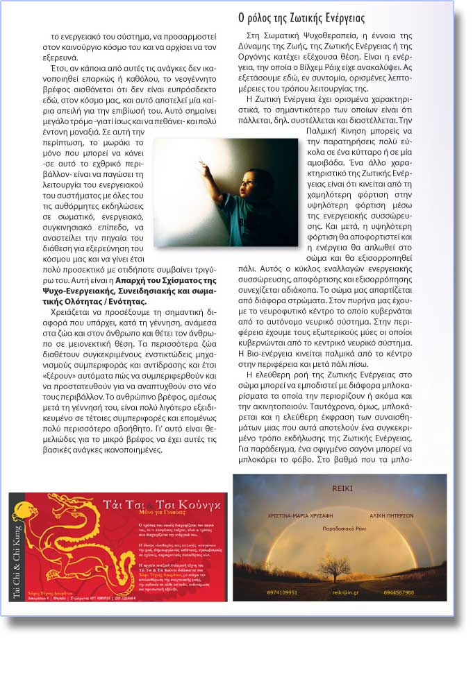 ÌåôÜ áðü ôï óïê ôïõ ÷ùñéóìïý áðü ôçí ùêåÜíåéá åõäáéìïíßá ôçò ìÞôñáò êáé ôçí õðåñÝíôáóç ðïõ âßùóå êáôÜ ôç äéÜñêåéá ôçò ãÝííçóçò åßíáé áðáñáßôçôç áõôÞ ç ðåñßïäïò ãéá íá åðáíáäéïñãáíùèåß ôï åíåñãåéáêü ôïõ óýóôçìá, íá ðñïóáñìïóôåß óôïí êáéíïýñãéï êüóìï ôïõ êáé íá áñ÷ßóåé íá ôïí åîåñåõíÜ. ¸ôóé, áí êÜðïéá áðü áõôÝò ôéò áíÜãêåò äåí éêáíïðïéçèåß åðáñêþò Þ êáèüëïõ, ôï íåïãÝííçôï âñÝöïò áéóèÜíåôáé üôé äåí åßíáé åõðñüóäåêôï åäþ, óôïí êüóìï ìáò, êáé áõôü áðïôåëåß ìßá êáßñéá áðåéëÞ ãéá ôçí åðéâßùóÞ ôïõ. Áõôü óçìáßíåé ìåãÜëï ôñüìï -ãéáôß ßóùò êáé íá ðåèÜíåé- êáé ðïëý Ýíôïíç ìïíáîéÜ. Óå áõôÞ ôçí ðåñßðôùóç, ôï ìùñÜêé ôï ìüíï ðïõ ìðïñåß íá êÜíåé -óå áõôü ôï å÷èñéêü ðåñéâÜëëïí- åßíáé íá ðáãþóåé ôç ëåéôïõñãßá ôïõ åíåñãåéáêïý ôïõ óõóôÞìáôïò ìå üëåò ôïõ ôéò áõèüñìçôåò åêäçëþóåéò óå óùìáôéêü, åíåñãåéáêü, óõãêéíçóéáêü åðßðåäï, íá áíáóôåßëåé ôçí ðçãáßá ôïõ äéÜèåóç ãéá åîåñåýíçóç ôïõ êüóìïõ ìáò êáé íá ãßíåé Ýôóé ðïëý ðñïóåêôéêü ìå ïôéäÞðïôå óõìâáßíåé ôñéãýñù ôïõ. ÁõôÞ åßíáé ç Áðáñ÷Þ ôïõ Ó÷ßóìáôïò ôçò Øõ÷ï-ÅíåñãåéáêÞò, ÓõíåéäçóéáêÞò êáé óùìáôéêÞò Ïëüôçôáò / Åíüôçôáò. ×ñåéÜæåôáé íá ðñïóÝîïõìå ôç óçìáíôéêÞ äéáöïñÜ ðïõ õðÜñ÷åé, êáôÜ ôç ãÝííçóç, áíÜìåóá óôá æþá êáé óôïí Üíèñùðï êáé èÝôåé ôïí Üíèñùðï óå ìåéïíåêôéêÞ èÝóç. Ôá ðåñéóóüôåñá æþá äéáèÝôïõí óõãêåêñéìÝíïõò åíóôéêôþäåéò ìç÷áíéóìïýò óõìðåñéöïñÜò êáé áíôßäñáóçò êáé Ýôóé «îÝñïõí» áõôüìáôá ðþò íá óõìðåñéöåñèïýí êáé íá ðñïóôáôåõèïýí ãéá íá áíáðôõ÷èïýí óôï íÝï ôïõò ðåñéâÜëëïí. Ôï áíèñþðéíï âñÝöïò, áìÝóùò ìåôÜ ôç ãÝííçóÞ ôïõ, åßíáé ðïëý ëéãüôåñï åîåéäéêåõìÝíï óå ôÝôïéåò óõìðåñéöïñÝò êáé åðïìÝíùò ðïëý ðåñéóóüôåñï áâïÞèçôï. Ãé’ áõôü åßíáé èåìåëéþäåò ãéá ôï ìéêñü âñÝöïò íá Ý÷åé áõôÝò ôéò âáóéêÝò áíÜãêåò éêáíïðïéçìÝíåò. Ï ñüëïò ôçò ÆùôéêÞò ÅíÝñãåéáò Óôç ÓùìáôéêÞ Øõ÷ïèåñáðåßá, ç Ýííïéá ôçò Äýíáìçò ôçò ÆùÞò, ôçò ÆùôéêÞò ÅíÝñãåéáò Þ ôçò Ïñãüíçò êáôÝ÷åé åîÝ÷ïõóá èÝóç. Åßíáé ç åíÝñãåéá, ôçí ïðïßá ï Âßë÷åì ÑÜé÷ åß÷å áíáêáëýøåé. Áò åîåôÜóïõìå åäþ, åí óõíôïìßá, ïñéóìÝíåò ëåðôïìÝñåéåò ôïõ ôñüðïõ ëåéôïõñãßáò ôçò.