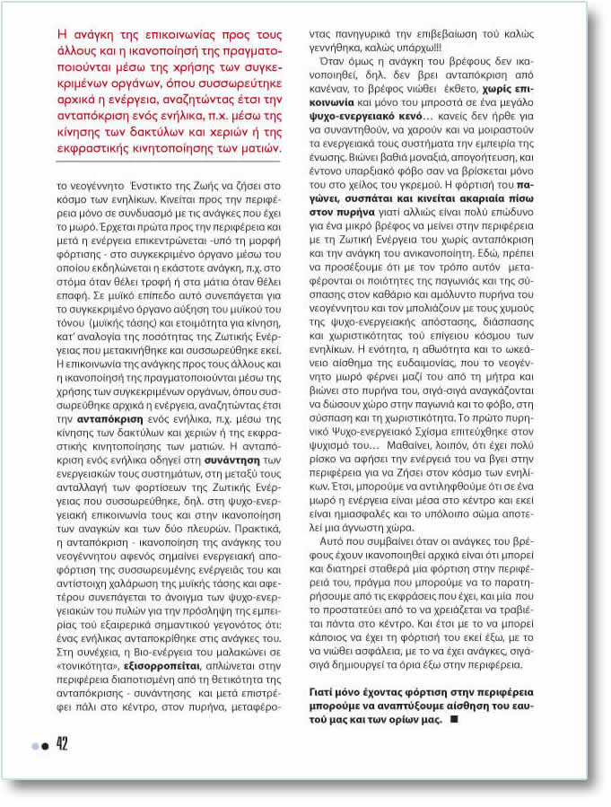 ¼ôáí üìùò ç áíÜãêç ôïõ âñÝöïõò äåí éêáíïðïéçèåß, äçë. äåí âñåé áíôáðüêñéóç áðü êáíÝíáí, ôï âñÝöïò íéþèåé  Ýêèåôï, ÷ùñßò åðéêïéíùíßá êáé ìüíï ôïõ ìðñïóôÜ óå Ýíá ìåãÜëï øõ÷ï-åíåñãåéáêü êåíü… êáíåßò äåí Þñèå ãéá íá óõíáíôçèïýí, íá ÷áñïýí êáé íá ìïéñáóôïýí ôá åíåñãåéáêÜ ôïõò óõóôÞìáôá ôçí åìðåéñßá ôçò Ýíùóçò. Âéþíåé âáèéÜ ìïíáîéÜ, áðïãïÞôåõóç, êáé Ýíôïíï õðáñîéáêü öüâï óáí íá âñßóêåôáé ìüíï ôïõ óôï ÷åßëïò ôïõ ãêñåìïý. Ç öüñôéóÞ ôïõ ðáãþíåé, óõóðÜôáé êáé êéíåßôáé áêáñéáßá ðßóù óôïí ðõñÞíá ãéáôß áëëéþò åßíáé ðïëý åðþäõíï ãéá Ýíá ìéêñü âñÝöïò íá ìåßíåé óôçí ðåñéöÝñåéá ìå ôç ÆùôéêÞ ÅíÝñãåéá ôïõ ÷ùñßò áíôáðüêñéóç êáé ôçí áíÜãêç ôïõ áíéêáíïðïßçôç. Åäþ, ðñÝðåé íá ðñïóÝîïõìå üôé ìå ôïí ôñüðï áõôüí  ìåôáöÝñïíôáé ïé ðïéüôçôåò ôçò ðáãùíéÜò êáé ôçò óýóðáóçò óôïí êáèÜñéï êáé áìüëõíôï ðõñÞíá ôïõ íåïãÝííçôïõ êáé ôïí ìðïëéÜæïõí ìå ôïõò ÷õìïýò ôçò øõ÷ï-åíåñãåéáêÞò áðüóôáóçò, äéÜóðáóçò êáé ÷ùñéóôéêüôçôáò ôïý åðßãåéïõ êüóìïõ ôùí åíçëßêùí. Ç åíüôçôá, ç áèùüôçôá êáé ôï ùêåÜíåéï áßóèçìá ôçò åõäáéìïíßáò, ðïõ ôï íåïãÝííçôï ìùñü öÝñíåé ìáæß ôïõ áðü ôç ìÞôñá êáé âéþíåé óôï ðõñÞíá ôïõ, óéãÜ-óéãÜ áíáãêÜæïíôáé íá äþóïõí ÷þñï óôçí ðáãùíéÜ êáé ôï öüâï, óôç óýóðáóç êáé ôç ÷ùñéóôéêüôçôá. Ôï ðñþôï ðõñçíéêü Øõ÷ï-åíåñãåéáêü Ó÷ßóìá åðéôåý÷èçêå óôïí øõ÷éóìü ôïõ…  Ìáèáßíåé, ëïéðüí, üôé Ý÷åé ðïëý ñßóêï íá áöÞóåé ôçí åíÝñãåéÜ ôïõ íá âãåé óôçí ðåñéöÝñåéá ãéá íá ÆÞóåé óôïí êüóìï ôùí åíçëßêùí. ¸ôóé, ìðïñïýìå íá áíôéëçöèïýìå üôé óå Ýíá ìùñü ç åíÝñãåéá åßíáé ìÝóá óôï êÝíôñï êáé åêåß åßíáé çìéáóöáëÝò êáé ôï õðüëïéðï óþìá áðïôåëåß ìéá Üãíùóôç ÷þñá.