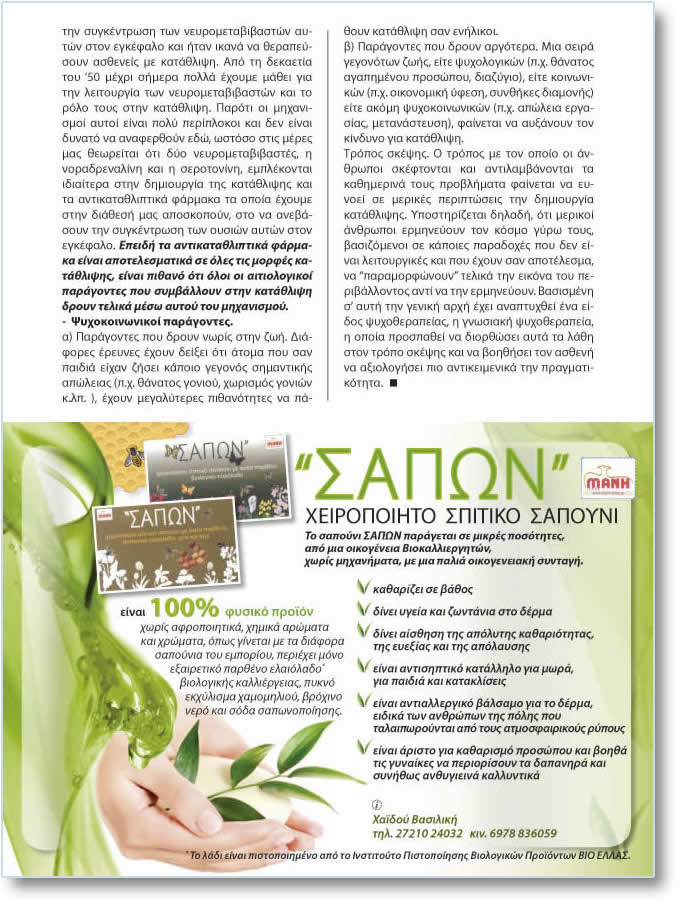 Ôï åðüìåíï âÞìá Þôáí íá ðáñáóêåõáóôïýí öÜñìáêá, ðïõ áýîáíáí ôçí óõãêÝíôñùóç ôùí íåõñïìåôáâéâáóôþí áõôþí óôïí åãêÝöáëï êáé Þôáí éêáíÜ íá èåñáðåýóïõí áóèåíåßò ìå êáôÜèëéøç. Áðü ôç äåêáåôßá ôïõ '50 ìÝ÷ñé óÞìåñá ðïëëÜ Ý÷ïõìå ìÜèåé ãéá ôçí ëåéôïõñãßá ôùí íåõñïìåôáâéâáóôþí êáé ôï ñüëï ôïõò óôçí êáôÜèëéøç. Ðáñüôé ïé ìç÷áíéóìïß áõôïß åßíáé ðïëý ðåñßðëïêïé êáé äåí åßíáé äõíáôü íá áíáöåñèïýí åäþ, ùóôüóï óôéò ìÝñåò ìáò èåùñåßôáé üôé äýï íåõñïìåôáâéâáóôÝò, ç íïñáäñåíáëßíç êáé ç óåñïôïíßíç, åìðëÝêïíôáé éäéáßôåñá óôçí äçìéïõñãßá ôçò êáôÜèëéøçò êáé ôá áíôéêáôáèëéðôéêÜ öÜñìáêá ôá ïðïßá Ý÷ïõìå óôçí äéÜèåóÞ ìáò áðïóêïðïýí, óôï íá áíåâÜóïõí ôçí óõãêÝíôñùóç ôùí ïõóéþí áõôþí óôïí åãêÝöáëï. ÅðåéäÞ ôá áíôéêáôáèëéðôéêÜ öÜñìáêá åßíáé áðïôåëåóìáôéêÜ óå üëåò ôéò ìïñöÝò êáôÜèëéøçò, åßíáé ðéèáíü üôé üëïé ïé áéôéïëïãéêïß ðáñÜãïíôåò ðïõ óõìâÜëëïõí óôçí êáôÜèëéøç äñïõí ôåëéêÜ ìÝóù áõôïý ôïõ ìç÷áíéóìïý.