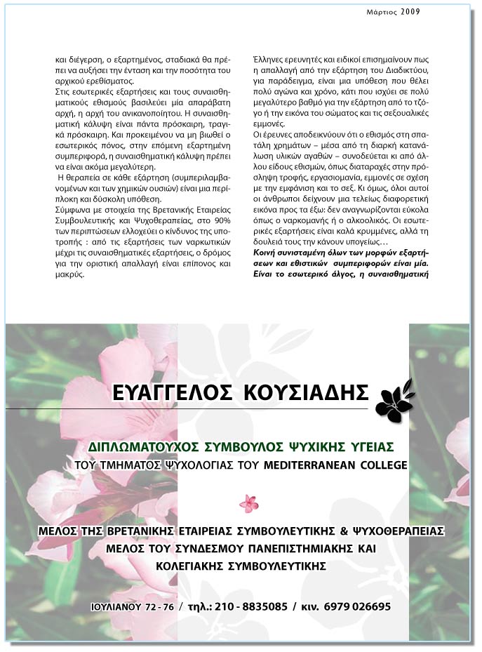 Óôéò åóùôåñéêÝò åîáñôÞóåéò êáé ôïõò óõíáéóèçìáôéêïýò åèéóìïýò âáóéëåýåé ìßá áðáñÜâáôç áñ÷Þ, ç áñ÷Þ ôïõ áíéêáíïðïßçôïõ. Ç óõíáéóèçìáôéêÞ êÜëõøç åßíáé ðÜíôá ðñüóêáéñç, ôñáãéêÜ ðñüóêáéñç. Êáé ðñïêåéìÝíïõ íá ìç âéùèåß ï åóùôåñéêüò ðüíïò, óôçí åðüìåíç åîáñôçìÝíç óõìðåñéöïñÜ, ç óõíáéóèçìáôéêÞ êÜëõøç ðñÝðåé íá åßíáé áêüìá ìåãáëýôåñç. Ç èåñáðåßá óå êÜèå åîÜñôçóç (óõìðåñéëáìâáíïìÝíùí êáé ôùí ÷çìéêþí ïõóéþí) åßíáé ìéá ðåñßðëïêç êáé äýóêïëç õðüèåóç. Óýìöùíá ìå óôïé÷åßá ôçò ÂñåôáíéêÞò Åôáéñåßáò ÓõìâïõëåõôéêÞò êáé Øõ÷ïèåñáðåßáò, óôï 90% ôùí ðåñéðôþóåùí åëëï÷åýåé ï êßíäõíïò ôçò õðïôñïðÞò : áðü ôéò åîáñôÞóåéò ôùí íáñêùôéêþí ìÝ÷ñé ôéò óõíáéóèçìáôéêÝò åîáñôÞóåéò, ï äñüìïò ãéá ôçí ïñéóôéêÞ áðáëëáãÞ åßíáé åðßðïíïò êáé ìáêñýò. ¸ëëçíåò åñåõíçôÝò êáé åéäéêïß åðéóçìáßíïõí ðùò ç áðáëëáãÞ áðü ôçí åîÜñôçóç ôïõ Äéáäéêôýïõ, ãéá ðáñÜäåéãìá, åßíáé ìéá õðüèåóç ðïõ èÝëåé ðïëý áãþíá êáé ÷ñüíï, êÜôé ðïõ éó÷ýåé óå ðïëý ìåãáëýôåñï âáèìü ãéá ôçí åîÜñôçóç áðü ôï ôæüãï Þ ôçí åéêüíá ôïõ óþìáôïò êáé ôéò óåîïõáëéêÝò åììïíÝò. Ïé Ýñåõíåò áðïäåéêíýïõí üôé ï åèéóìüò óôç óðáôÜëç ÷ñçìÜôùí – ìÝóá áðü ôç äéáñêÞ êáôáíÜëùóç õëéêþí áãáèþí – óõíïäåýåôáé êé áðü Üëëïõ åßäïõò åèéóìþí, üðùò äéáôáñá÷Ýò óôçí ðñüóëçøç ôñïöÞò, åñãáóéïìáíßá, åììïíÝò óå ó÷Ýóç ìå ôçí åìöÜíéóç êáé ôï óåî. Êé üìùò, üëïé áõôïß ïé Üíèñùðïé äåß÷íïõí ìéá ôåëåßùò äéáöïñåôéêÞ åéêüíá ðñïò ôá Ýîù: äåí áíáãíùñßæïíôáé åýêïëá üðùò ï íáñêïìáíÞò Þ ï áëêïïëéêüò. Ïé åóùôåñéêÝò åîáñôÞóåéò åßíáé êáëÜ êñõììÝíåò, áëëÜ ôç äïõëåéÜ ôïõò ôçí êÜíïõí õðïãåßùò… ÊïéíÞ óõíéóôáìÝíç üëùí ôùí ìïñöþí åîáñôÞóåùí êáé åèéóôéêþí óõìðåñéöïñþí åßíáé ìßá. Åßíáé ôï åóùôåñéêü Üëãïò, ç óõíáéóèçìáôéêÞ Ýíäåéá, ðïõ áðåéëþíôáò õðïãåßùò ôçí øõ÷éêÞ õãåßá ôùí áíèñþðùí, ãßíïíôáé ìéá ìç÷áíéêÞ, áóõíåßäçôá áõôïêáôáóôñïöéêÞ óõìðåñéöïñÜ, ðïõ óôç âÜóç ôçò êñýâåé ôï øÜîéìï áõôïý ðïõ ðñáãìáôéêÜ ëåßðåé : íüçìá, åëåõèåñßá êáé âáèéÜ åðáöÞ ìå ôïí áëçèéíü áí êáé ðáñáìåëçìÝíï Åáõôü. |