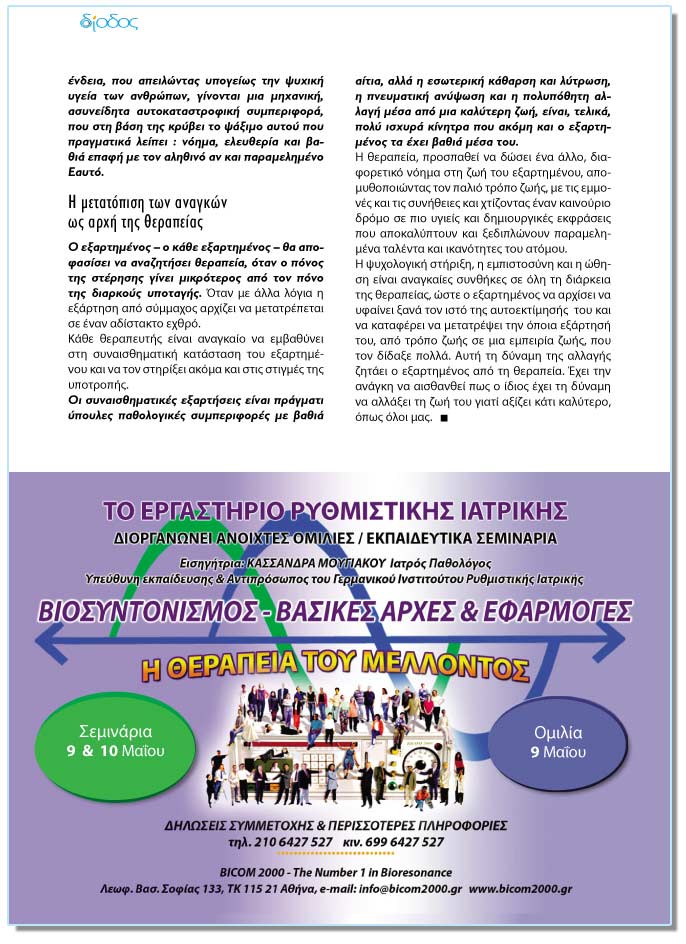 Ïé óõíáéóèçìáôéêÝò åîáñôÞóåéò åßíáé ðñÜãìáôé ýðïõëåò ðáèïëïãéêÝò óõìðåñéöïñÝò ìå âáèéÜ áßôéá, áëëÜ ç åóùôåñéêÞ êÜèáñóç êáé ëýôñùóç, ç ðíåõìáôéêÞ áíýøùóç êáé ç ðïëõðüèçôç áëëáãÞ ìÝóá áðü ìéá êáëýôåñç æùÞ, åßíáé, ôåëéêÜ, ðïëý éó÷õñÜ êßíçôñá ðïõ áêüìç êáé ï åîáñôçìÝíïò ôá Ý÷åé âáèéÜ ìÝóá ôïõ.