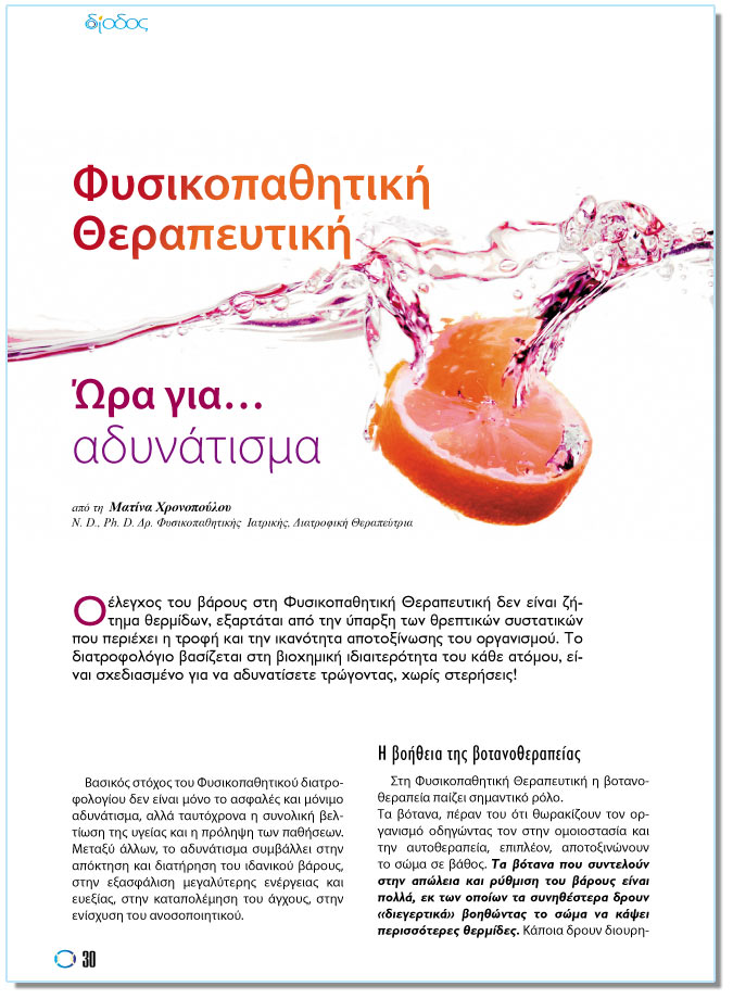 ÖõóéêïðáèçôéêÞ ÈåñáðåõôéêÞ ¿ñá ãéá… áäõíÜôéóìá Áðü ôç Ìáôßíá ×ñïíïðïýëïõ N. D., Ph. D. Äñ. ÖõóéêïðáèçôéêÞò ÉáôñéêÞò ÄéáôñïöéêÞ Èåñáðåýôñéá Ï Ýëåã÷ïò ôïõ âÜñïõò óôç ÖõóéêïðáèçôéêÞ ÈåñáðåõôéêÞ äåí åßíáé æÞôçìá èåñìßäùí, åîáñôÜôáé áðü ôçí ýðáñîç ôùí èñåðôéêþí óõóôáôéêþí ðïõ ðåñéÝ÷åé ç ôñïöÞ êáé ôçí éêáíüôçôá áðïôïîßíùóçò ôïõ ïñãáíéóìïý. Ôï äéáôñïöïëüãéï âáóßæåôáé óôç âéï÷çìéêÞ éäéáéôåñüôçôá ôïõ êÜèå áôüìïõ, åßíáé ó÷åäéáóìÝíï ãéá íá áäõíáôßóåôå ôñþãïíôáò, ÷ùñßò óôåñÞóåéò! Âáóéêüò óôü÷ïò ôïõ Öõóéêïðáèçôéêïý äéáôñïöïëïãßïõ äåí åßíáé ìüíï ôï áóöáëÝò êáé ìüíéìï áäõíÜôéóìá, áëëÜ ôáõôü÷ñïíá ç óõíïëéêÞ âåëôßùóç ôçò õãåßáò êáé ç ðñüëçøç ôùí ðáèÞóåùí. Ìåôáîý Üëëùí, ôï áäõíÜôéóìá óõìâÜëëåé óôçí áðüêôçóç êáé äéáôÞñçóç ôïõ éäáíéêïý âÜñïõò, óôçí åîáóöÜëéóç ìåãáëýôåñçò åíÝñãåéáò êáé åõåîßáò, óôçí êáôáðïëÝìçóç ôïõ Üã÷ïõò, óôçí åíßó÷õóç ôïõ áíïóïðïéçôéêïý.