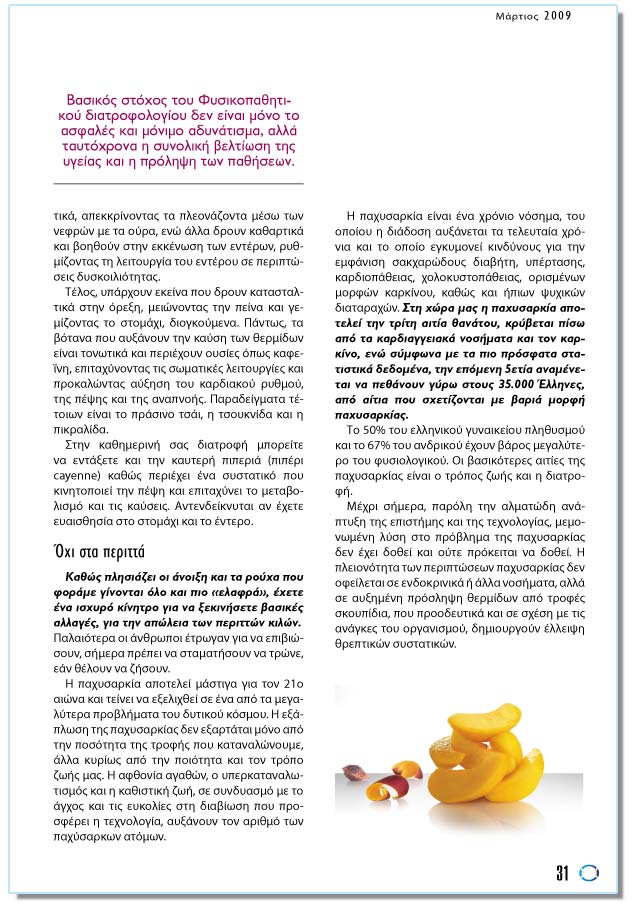 ÔÝëïò, õðÜñ÷ïõí åêåßíá ðïõ äñïõí êáôáóôáëôéêÜ óôçí üñåîç, ìåéþíïíôáò ôçí ðåßíá êáé ãåìßæïíôáò ôï óôïìÜ÷é, äéïãêïýìåíá. ÐÜíôùò, ôá âüôáíá ðïõ áõîÜíïõí ôçí êáýóç ôùí èåñìßäùí åßíáé ôïíùôéêÜ êáé ðåñéÝ÷ïõí ïõóßåò üðùò êáöåÀíç, åðéôá÷ýíïíôáò ôéò óùìáôéêÝò ëåéôïõñãßåò êáé ðñïêáëþíôáò áýîçóç ôïõ êáñäéáêïý ñõèìïý, ôçò ðÝøçò êáé ôçò áíáðíïÞò. Ðáñáäåßãìáôá ôÝôïéùí åßíáé ôï ðñÜóéíï ôóÜé, ç ôóïõêíßäá êáé ç ðéêñáëßäá. Óôçí êáèçìåñéíÞ óáò äéáôñïöÞ ìðïñåßôå íá åíôÜîåôå êáé ôçí êáõôåñÞ ðéðåñéÜ (ðéðÝñé cayenne) êáèþò ðåñéÝ÷åé Ýíá óõóôáôéêü ðïõ êéíçôïðïéåß ôçí ðÝøç êáé åðéôá÷ýíåé ôï ìåôáâïëéóìü êáé ôéò êáýóåéò. Áíôåíäåßêíõôáé áí Ý÷åôå åõáéóèçóßá óôï óôïìÜ÷é êáé ôï Ýíôåñï. ¼÷é óôá ðåñéôôÜ Êáèþò ðëçóéÜæåé ïé Üíïéîç êáé ôá ñïý÷á ðïõ öïñÜìå ãßíïíôáé üëï êáé ðéï «åëáöñÜ», Ý÷åôå Ýíá éó÷õñü êßíçôñï ãéá íá îåêéíÞóåôå âáóéêÝò áëëáãÝò, ãéá ôçí áðþëåéá ôùí ðåñéôôþí êéëþí. Ðáëáéüôåñá ïé Üíèñùðïé Ýôñùãáí ãéá íá åðéâéþóïõí, óÞìåñá ðñÝðåé íá óôáìáôÞóïõí íá ôñþíå, åÜí èÝëïõí íá æÞóïõí. Ç ðá÷õóáñêßá áðïôåëåß ìÜóôéãá ãéá ôïí 21ï áéþíá êáé ôåßíåé íá åîåëé÷èåß óå Ýíá áðü ôá ìåãáëýôåñá ðñïâëÞìáôá ôïõ äõôéêïý êüóìïõ. Ç åîÜðëùóç ôçò ðá÷õóáñêßáò äåí åîáñôÜôáé ìüíï áðü ôçí ðïóüôçôá ôçò ôñïöÞò ðïõ êáôáíáëþíïõìå, Üëëá êõñßùò áðü ôçí ðïéüôçôá êáé ôïí ôñüðï æùÞò ìáò. Ç áöèïíßá áãáèþí, ï õðåñêáôáíáëùôéóìüò êáé ç êáèéóôéêÞ æùÞ, óå óõíäõáóìü ìå ôï Üã÷ïò êáé ôéò åõêïëßåò óôç äéáâßùóç ðïõ ðñïóöÝñåé ç ôå÷íïëïãßá, áõîÜíïõí ôïí áñéèìü ôùí ðá÷ýóáñêùí áôüìùí. Ç ðá÷õóáñêßá åßíáé Ýíá ÷ñüíéï íüóçìá, ôïõ ïðïßïõ ç äéÜäïóç áõîÜíåôáé ôá ôåëåõôáßá ÷ñüíéá êáé ôï ïðïßï åãêõìïíåß êéíäýíïõò ãéá ôçí åìöÜíéóç óáê÷áñþäïõò äéáâÞôç, õðÝñôáóçò, êáñäéïðÜèåéáò, ÷ïëïêõóôïðÜèåéáò, ïñéóìÝíùí ìïñöþí êáñêßíïõ, êáèþò êáé Þðéùí øõ÷éêþí äéáôáñá÷þí. Óôç ÷þñá ìáò ç ðá÷õóáñêßá áðïôåëåß ôçí ôñßôç áéôßá èáíÜôïõ, êñýâåôáé ðßóù áðü ôá êáñäéáããåéáêÜ íïóÞìáôá êáé ôïí êáñêßíï, åíþ óýìöùíá ìå ôá ðéï ðñüóöáôá óôáôéóôéêÜ äåäïìÝíá, ôçí åðüìåíç 5åôßá áíáìÝíåôáé íá ðåèÜíïõí ãýñù óôïõò 35.000 ¸ëëçíåò, áðü áßôéá ðïõ ó÷åôßæïíôáé ìå âáñéÜ ìïñöÞ ðá÷õóáñêßáò. Ôï 50% ôïõ åëëçíéêïý ãõíáéêåßïõ ðëçèõóìïý êáé ôï 67% ôïõ áíäñéêïý Ý÷ïõí âÜñïò ìåãáëýôåñï ôïõ öõóéïëïãéêïý. Ïé âáóéêüôåñåò áéôßåò ôçò ðá÷õóáñêßáò åßíáé ï ôñüðïò æùÞò êáé ç äéáôñïöÞ. ÌÝ÷ñé óÞìåñá, ðáñüëç ôçí áëìáôþäç áíÜðôõîç ôçò åðéóôÞìçò êáé ôçò ôå÷íïëïãßáò, ìåìïíùìÝíç ëýóç óôï ðñüâëçìá ôçò ðá÷õóáñêßáò äåí Ý÷åé äïèåß êáé ïýôå ðñüêåéôáé íá äïèåß. Ç ðëåéïíüôçôá ôùí ðåñéðôþóåùí ðá÷õóáñêßáò äåí ïöåßëåôáé óå åíäïêñéíéêÜ Þ Üëëá íïóÞìáôá, áëëÜ óå áõîçìÝíç ðñüóëçøç èåñìßäùí áðü ôñïöÝò óêïõðßäéá, ðïõ ðñïïäåõôéêÜ êáé óå ó÷Ýóç ìå ôéò áíÜãêåò ôïõ ïñãáíéóìïý, äçìéïõñãïýí Ýëëåéøç èñåðôéêþí óõóôáôéêþí. |