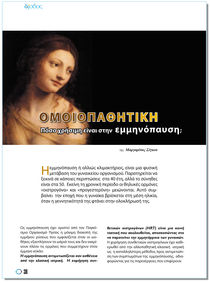 ÏÌÏÉÏÐÁÈÇÔÉÊÇ Ðüóï ÷ñÞóéìç åßíáé óôçí åììçíüðáõóç; Ôçò Ìáñãáñßôáò ÓÝãêïõ Ç åììçíüðáõóç Þ áëëéþò êëéìáêôÞñéïò, åßíáé ìéá öõóéêÞ ìåôÜâáóç ôïõ ãõíáéêåßïõ ïñãáíéóìïý. Ðáñáôçñåßôáé íá îåêéíÜ óå êÜðïéåò ðåñéðôþóåéò óôá 40 Ýôç, áëëÜ ôï óýíçèåò åßíáé óôá 50. Åêåßíç ôç ÷ñïíéêÞ ðåñßïäï ïé èçëõêÝò ïñìüíåò «ïéóôñïãüíá» êáé «ðñïãåóôåñüíç» ìåéþíïíôáé. Áõôü óõìâáßíåé ôçí åðï÷Þ ðïõ ç ãõíáßêá âñßóêåôáé óôç ìÝóç çëéêßá, üôáí ç ãåííçôéêüôçôÜ ôçò öôÜíåé óôçí ïëïêëÞñùóÞ ôçò. Ùò åììçíüðáõóç Ý÷åé ïñéóôåß áðü ôïí Ðáãêüóìéï Ïñãáíéóìü Õãåßáò ç ìüíéìç äéáêïðÞ ôçò åììÞíïõ ñýóåùò ðïõ åìöáíßæåôáé üôáí ïé ùïèÞêåò åîáíôëÞóïõí ôá ùÜñéÜ ôïõò êáé äåí åêêñßíïõí ðëÝïí ôéò ïñìüíåò ðïõ óõììåôÝ÷ïõí óôïí Ýììçíï êýêëï. Ç åììçíüðáõóç áíôéìåôùðßæåôáé óáí áóèÝíåéá áðü ôçí êëáóéêÞ éáôñéêÞ. Ç ÷ïñÞãçóç óõíèåôéêþí ïéóôñïãüíùí (HRT) åßíáé ìéá êïéíÞ ôáêôéêÞ ðïõ áêïëïõèåßôáé, áðïóêïðþíôáò óôï íá ðáñáôåßíåé ôçí åììçíüññïéá ôùí ãõíáéêþí. Ç ÷ïñÞãçóç óõíèåôéêþí ïéóôñïãüíùí Ý÷åé êáèéåñùèåß áðü ôçí áëëïðáèçôéêÞ êëáóéêÞ éáôñéêÞ ùò ç êáôáëëçëüôåñç ìÝèïäïò ðñïò áíôéìåôþðéóç ôùí óõìðôùìÜôùí ôçò åììçíüðáõóçò, áäéáöïñþíôáò ãéá ôéò ðáñåíÝñãåéåò ðïõ åðéöÝñïõí. |