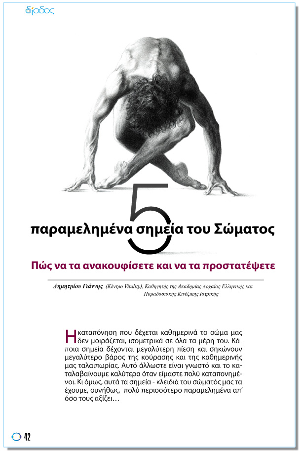 ÐÝíôå ðáñáìåëçìÝíá óçìåßá ôïõ Óþìáôïò Ðþò íá ôá áíáêïõößóåôå êáé íá ôá ðñïóôáôÝøåôå. Äçìçôñßïõ ÃéÜííçò (ÊÝíôñï Vitality) ÊáèçãçôÞò ôçò Áêáäçìßáò Áñ÷áßáò ÅëëçíéêÞò êáé ÐáñáäïóéáêÞò ÊéíÝæéêçò ÉáôñéêÞò Ç êáôáðüíçóç ðïõ äÝ÷åôáé êáèçìåñéíÜ ôï óþìá ìáò äåí ìïéñÜæåôáé, éóïìåôñéêÜ óå üëá ôá ìÝñç ôïõ. ÊÜðïéá óçìåßá äÝ÷ïíôáé ìåãáëýôåñç ðßåóç êáé óçêþíïõí ìåãáëýôåñï âÜñïò ôçò êïýñáóçò êáé ôçò êáèçìåñéíÞò ìáò ôáëáéðùñßáò. Áõôü Üëëùóôå åßíáé ãíùóôü êáé ôï êáôáëáâáßíïõìå êáëýôåñá üôáí åßìáóôå ðïëý êáôáðïíçìÝíïé. Êé üìùò, áõôÜ ôá óçìåßá – êëåéäéÜ ôïõ óþìáôüò ìáò ôá Ý÷ïõìå, óõíÞèùò, ðïëý ðåñéóóüôåñï ðáñáìåëçìÝíá áð’ üóï ôïõò áîßæåé… |
