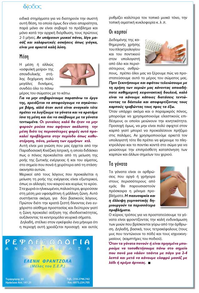 ÌÝóç Ç ìÝóç Þ áëëéþò «ïóöõúêÞ ìïßñá» ôçò óðïíäõëéêÞò óôÞëçò äå÷üìåíç ðïëý ìåãÜëåò äõíÜìåéò, óõíäÝåé üëï ôï ðÜíù ìÝñïò ôïõ óþìáôïò ìå ôï êÜôù. Ãéá íá ìçí åðéâáñýíïõìå ðáñáðÜíù ôï Ýñãï ôçò, ÷ñåéÜæåôáé íá áðïöåýãïõìå íá óçêþíïõìå âÜñç, áëëÜ üôáí áõôü åßíáé áíáãêáßï ôüôå ðñÝðåé íá ëõãßæïõìå ôá ãüíáôá êáé íá êñáôÜìå ßóéá ôç ìÝóç êáé ü÷é íá óêýâïõìå ìå ôá ãüíáôá ôåíôùìÝíá. Ïé ãõíáßêåò êáëü èá Þôáí íá ìçí öïñïýí ñïý÷á ðïõ áöÞíïõí áêÜëõðôç ôçí ìÝóç äéüôé ôéò ðåñéóóüôåñåò öïñÝò áõôü ðñïêáëåß ðñïâëÞìáôá óôçí ðåñßïäï üðùò êáèõóôÝñçóç, ðüíï, ìåßùóç ôùí åììÞíùí êôë. ÁõôÞ åßíáé ìéá ãíþóç ðïõ ìáò Ýñ÷åôáé áðü ôçí ÐáñáäïóéáêÞ ÊéíÝæéêç ÉáôñéêÞ, ç ïðïßá äéäÜóêåé ðùò ï ðüíïò ðñïêáëåßôáé áðü ôç ìåßùóç ôçò ñïÞò ôçò æùôéêÞò åíÝñãåéáò Þ êáé ôïõ áßìáôïò, óôï óçìåßï ðïõ ðïíÜ Þ ÷åéñüôåñá áðü ôç óôÜóç-áêéíçóßá áõôþí. Ìåñéêïß áðü ôïõò ëüãïõò ðïõ ðñïêáëåßôáé ç ìåßùóç ôç ñïÞò ôçò åíÝñãåéáò åßíáé åîùôåñéêïß, üðùò ïé áëëáãÝò ôïõ êáéñïý êáé êõñßùò ôï êñýï. Óôá ÷ùñéÜ ïé çëéêéùìÝíïé, ðáëáéüôåñá, öïñïýóáí óôç ìÝóç ìéá õöáóìÜôéíç Þ ìÜëëéíç æþíç. Áõôü óõóôÞíåôáé áêüìá, ãéá äýï âáóéêïýò ëüãïõò. Ðñþôïí äéüôé ôçí êñáôÜ æåóôÞ äßíïíôáò Ýíá åõ÷Üñéóôï áßóèçìá ðñïóôáóßáò êáé äåýôåñïí ãéáôß ç æþíç ðñïêáëåß áýîçóç ôçò éäéïäåêôéêüôçôáò, áõîÜíïíôáò ôá êåíôñïìüëá íåõñéêÜ óÞìáôá. ÄçëáäÞ, óôÝëíåé óôïí åãêÝöáëï Ýíá ìÞíõìá üôé ç ðåñéï÷Þ áõôÞ ÷ñåéÜæåôáé ðñïóï÷Þ êáé áõôüò ñõèìßæåé êáëýôåñá ôïí ôïðéêü ìõéêü ôüíï, ôçí ôïðéêÞ áéìáôéêÞ êõêëïöïñßá ê. ë .ð. Ïé êáñðïß ÄåäïìÝíçò ôçò êáèçìåñéíÞò ÷ñÞóçò ôïõ ðëçêôñïëïãßïõ êáé ôïõ ðïíôéêéïý óôïí õðïëïãéóôÞ áðü üëï êáé ðåñéóóüôåñïõò áíèñþðïõò, ðñÝðåé üëïé ìáò íá îÝñïõìå ðþò íá ðñïóôáôåýóïõìå áõôü ôï ìÝñïò ôïõ óþìáôïò ìáò. Ðñéí îåêéíÞóïõìå êáé áöüôïõ ôåëåéþóïõìå ìå ôç ÷ñÞóç ôùí ÷åñéþí ìáò êÜíïíôáò ïðïéáäÞðïôå êáèçìåñéíÞ ÷åéñïíáêôéêÞ äïõëåéÜ, êáëü åßíáé íá êÜíïõìå êÜðïéåò äéáôÜóåéò ôåíôþíïíôáò ôá äÜ÷ôõëá êáé áðïöïñôßæïíôáò ôïõò êáñðïýò ôñáâþíôáò ôïõò ðñïò ôá Ýîù. ¼ôáí õðÜñ÷åé áêüìá êáé ï ðáñáìéêñüò ðüíïò, ìðïñïýìå íá ÷ñçóéìïðïéïýìå åëáóôéêïýò åðéäÝóìïõò ïé ïðïßïé ìåéþíïõí ôçí êéíçôéêüôçôá. Ðñïóï÷Þ üìùò, íá ìçí åßíáé ðïëý óöé÷ôïß óôïí êáñðü ãéáôß ìðïñåß íá ðñïêáëÝóïõí ðñÞîéìï óôéò ðáëÜìåò. Áí ÷ñçóéìïðïéïýìå áñêåôÜ ôïí õðïëïãéóôÞ ôüôå èá ðñÝðåé íá öÝñïõìå ôï ðëçêôñïëüãéï êáé ôï ðïíôßêé êïíôÜ óôï óþìá ãéá íá ìåéþóïõìå ôçí åðéðñüóèåôç êáôáðüíçóç ôùí êáñðþí êáé Üëëùí óçìåßùí ôïõ ÷åñéïý. Ôá ãüíáôá Ôá ãüíáôá åßíáé ïé áñèñþóåéò ðïõ áñãÜ Þ ãñÞãïñá óôïõò ðåñéóóüôåñïõò áðü åìÜò èá ðáñïõóéáóôïýí ðñüóêáéñá ç ìüíéìá ðñïâëÞìáôá. Ç ðá÷õóáñêßá êáé ç Ýëëåéøç ãõìíáóôéêÞò äçìéïõñãïýí ôá ðåñéóóüôåñá ðñïâëÞìáôá. Ï êýñéïò ôñüðïò ãéá íá ðñïóôáôåýóïõìå ôá ãüíáôá åßíáé öñïíôßæïíôáò ôçí êáëÞ åíäõíÜìùóç ôùí ìõþí ðïõ âñßóêïíôáé ãýñù áðü ôçí Üñèñùóç. ÄçëáäÞ, âáóéêÜ, ôïõò ôåôñáêÝöáëïõò (ôïõò ìõò ðïõ ôåíôþíïõí ôï ðüäé) êáé ôïõò éó÷õïêíçìéáßïõò (êáìðôÞñåò ôïõ ðïäéïý). ¼ôáí ôá ãüíáôá ðïíïýí Þ åßíáé ðñçóìÝíá ìðïñïýìå íá ôïðïèåôÞóïõìå ðÜíù óôï óçìåßï ðïõ ðïíÜ ìéá íÜéëïí ôóÜíôá ìå ðÜãï ãéá 2-4 ëåðôÜ êáé ìåôÜ íá êÜíïõìå åëáöñý ìáóÜæ ìå ëÜäé Þ êñÝìá Üñíéêáò. |