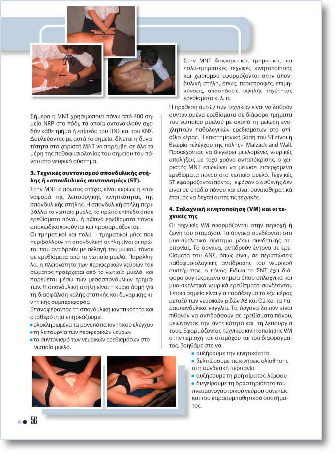 ÓÞìåñá ç MNT ÷ñçóéìïðïéåß ðÜíù áðü 400 óçìåßá NRP óôï ðüäé, ôá ïðïßá áíôáíáêëïýí ó÷åäüí êÜèå ôìÞìá Þ åðßðåäï ôïõ ÐÍÓ êáé ôïõ ÊÍÓ. Äïõëåýïíôáò ìå áõôÜ ôá óçìåßá, äßíåôáé ç äõíáôüôçôá óôï ÷åéñéóôÞ MNT íá ðáñÝìâåé óå üëá ôá ìÝñç ôçò ðáèïöõóéïëïãßáò ôïõ óçìåßïõ ôïõ ðüíïõ óôï íåõñéêü óýóôçìá. 3. Ôå÷íéêÝò óõíôïíéóìïý óðïíäõëéêÞò óôÞëçò Þ «óðïíäõëéêüò óõíôïíéóìüò» (ST). Óôçí MNT ï ðñþôïò óôü÷ïò åßíáé êõñßùò ç åðáíáöïñÜ ôçò ëåéôïõñãéêÞò êéíçôéêüôçôáò ôçò óðïíäõëéêÞò óôÞëçò. Ç óðïíäõëéêÞ óôÞëç ðåñéâÜëëåé ôï íùôéáßï ìõåëü, ôï ðñþôï åðßðåäï üðïõ åñåèßóìáôá ðüíïõ Þ ðéèáíÜ åñåèßóìáôá ðüíïõ áðïêùäéêïðïéïýíôáé êáé ðñïóáñìüæïíôáé. Ïé ôìçìáôéêïß êáé ðïëý - ôìçìáôéêïß ìýåò ðïõ ðåñéâÜëëïõí ôç óðïíäõëéêÞ óôÞëç åßíáé ïé ðñþôïé ðïõ áíôéäñïýí ìå áëëáãÞ ôïõ ìõéêïý ôüíïõ óå åñåèßóìáôá áðü ôï íùôéáßï ìõåëü. ÐáñÜëëçëá, ç ðëåéïíüôçôá ôùí ðåñéöåñéêþí íåýñùí ôïõ óþìáôïò ðñïÝñ÷åôáé áðü ôï íùôéáßï ìõåëü êáé ðïñåýåôáé ìÝóù ôùí ìåóïóðïíäõëßùí ôñçìÜôùí. Ç óðïíäõëéêÞ óôÞëç åßíáé ç êýñéá äïìÞ ãéá ôç äéáóöÜëéóç êáëÞò óôáôéêÞò êáé äõíáìéêÞò êéíçôéêÞò óõìðåñéöïñÜò. ÅðáíáöÝñïíôáò ôç óðïíäõëéêÞ êéíçôéêüôçôá êáé óôáèåñüôçôá åðçñåÜæïõìå: Óôçí MNT äéáöïñåôéêÝò ôìçìáôéêÝò êáé ðïëý-ôìçìáôéêÝò ôå÷íéêÝò êéíçôïðïßçóçò êáé ÷åéñéóìïý åöáñìüæïíôáé óôçí óðïíäõëéêÞ óôÞëç, üðùò, ðåñéóôñïöÝò, åðéìçêýíóåéò, áðïóðÜóåéò, õøçëÞò ôá÷ýôçôáò åñåèßóìáôá ê. ë. ð.
