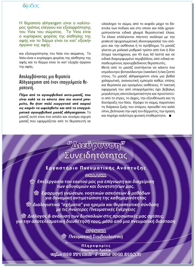 Ç èåñáðåßá abhyangam åßíáé ï êáëýôåñïò ôñüðïò åëÝã÷ïõ êáé åîéóïññüðçóçò ôïõ Vata ôïõ óþìáôïò. Ôï Vata åßíáé ï êõñßáñ÷ïò öïñÝáò ôçò áßóèçóçò ôçò áöÞò êáé ôï äÝñìá åßíáé ôï êáô’ åîï÷Þí üñãáíï ôçò áöÞò. ÁðïëáìâÜíïíôáò ìéá èåñáðåßá Abhyangamm áðü Ýíáí åðáããåëìáôßá èåñáðåõôÞ. ÐÝñá áðü ôï áãéïõñâåäéêü áõôï-ìáóÜæ, ðïõ åßíáé êáëü íá ôï êÜíåôå üóï ðéï óõ÷íÜ ìðïñåßôå, èá Þôáí ðïëý åõåñãåôéêü áðü êáéñïý åéò êáéñüí íá ùöåëçèåßôå êáé áðü ôï åðáããåëìáôéêü áãéïõñâåäéêü ìáóÜæ abhyangamm. Ôï ìáóÜæ áõôü åßíáé Ýíá áðáëü êáé óõíÜìá éó÷õñü ìáóÜæ ðïõ åöáñìüæåôáé áðü ôï èåñáðåõôÞ óå ïëüêëçñï ôï óþìá, áðü ôï êåöÜëé ìÝ÷ñé ôá äÜêôõëá ôùí ðïäéþí êáé óôï ïðïßï êáé ðÜëé ÷ñçóéìïðïéïýíôáé åéäéêÜ ÷ëéáñÜ èåñáðåõôéêÜ Ýëáéá. Ôá Ýëáéá åðéëÝãïíôáé ðÜíôïôå áíÜëïãá ìå ôçí prakruti (øõ÷ïóùìáôéêÞ éäéïóõãêñáóßá) ôïõ áôüìïõ êáé ôçí áóèÝíåéá Þ ôï ðñüâëçìá. Ôï ìáóÜæ ãßíåôáé ìå ìáëáêü ñõèìéêü ôñüðï áðü Ýíá Þ äýï Üôïìá ôáõôü÷ñïíá, ãéá 45 Ýùò 60 ëåðôÜ êáé óå åéäéêÜ äéáìïñöùìÝíï ðåñéâÜëëïí, áðü åéäéêÜ åêðáéäåõìÝíïõò áãéïõñâåäéêïýò èåñáðåõôÝò. ÌåôÜ áðü ôï ìáóÜæ óõóôÞíåôáé íá êÜíåôå Ýíá áôìüëïõôñï-âïôáíüëïõôñï (swedan) Þ Ýíá æåóôü íôïõò. Ôï ìáóÜæ abhyangamm åßíáé ìéá âáèéÜ ÷áëáñùôéêÞ, áíáíåùôéêÞ åìðåéñßá êáèþò åðßóçò êáé èåñáðåßá ãéá ïñéóìÝíåò áóèÝíåéåò. Ç ôáêôéêÞ åöáñìïãÞ ôïõ áðü åðáããåëìáôßåò Ý÷åé âåâáßùò ìåãáëýôåñç áðïôåëåóìáôéêüôçôá êáé ðñïóôáôåýåé áðü ôï óôñåò, ôï Üã÷ïò, ôçí åîïõèÝíùóç êáé ôç äéáôÜñáîç ôïõ Vata.ÈñÝöåé ôï óþìá, ðáñáôåßíåé ôç äéÜñêåéá æùÞò ôïõ áôüìïõ, ðñïùèåß ôïí êáëü ýðíï, âåëôéþíåé ôçí õöÞ ôïõ äÝñìáôïò, ôçí üñáóç êáé ðáñÝ÷åé êáëýôåñç öõóéêÞ óôáèåñüôçôá. |