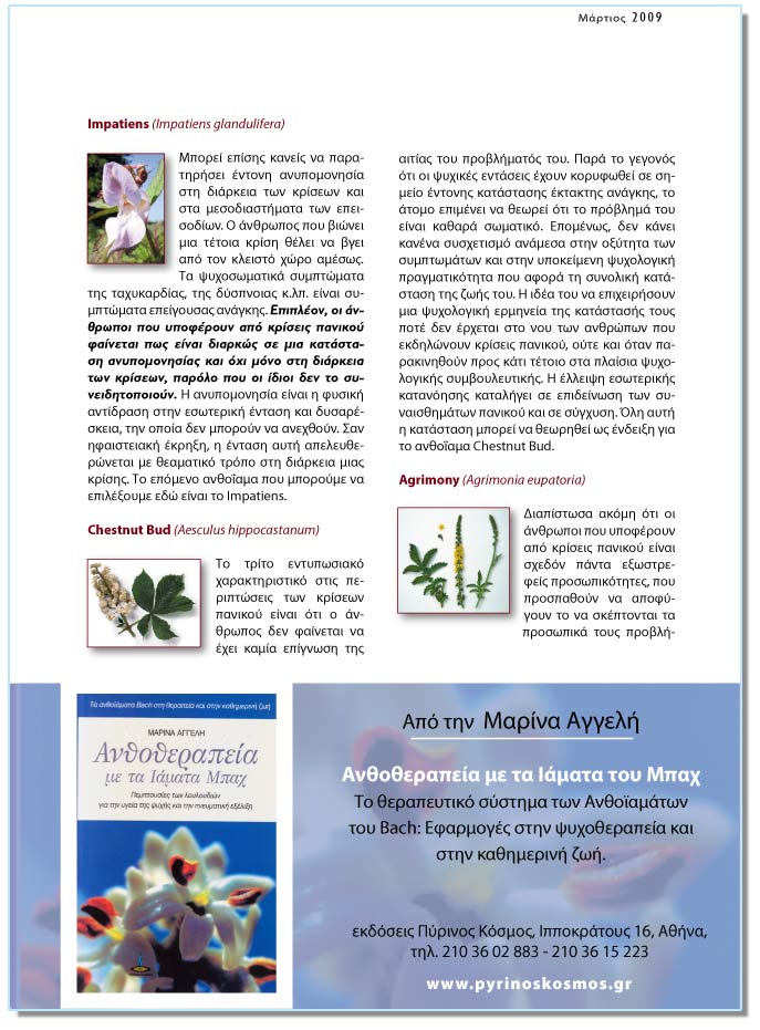 Impatiens (Impatiens glandulifera) Ìðïñåß åðßóçò êáíåßò íá ðáñáôçñÞóåé Ýíôïíç áíõðïìïíçóßá óôç äéÜñêåéá ôùí êñßóåùí êáé óôá ìåóïäéáóôÞìáôá ôùí åðåéóïäßùí. Ï Üíèñùðïò ðïõ âéþíåé ìéá ôÝôïéá êñßóç èÝëåé íá âãåé áðü ôïí êëåéóôü ÷þñï áìÝóùò. Ôá øõ÷ïóùìáôéêÜ óõìðôþìáôá ôçò ôá÷õêáñäßáò, ôçò äýóðíïéáò ê.ëð. åßíáé óõìðôþìáôá åðåßãïõóáò áíÜãêçò. ÅðéðëÝïí, ïé Üíèñùðïé ðïõ õðïöÝñïõí áðü êñßóåéò ðáíéêïý öáßíåôáé ðùò åßíáé äéáñêþò óå ìéá êáôÜóôáóç áíõðïìïíçóßáò êáé ü÷é ìüíï óôç äéÜñêåéá ôùí êñßóåùí, ðáñüëï ðïõ ïé ßäéïé äåí ôï óõíåéäçôïðïéïýí. Ç áíõðïìïíçóßá åßíáé ç öõóéêÞ áíôßäñáóç óôçí åóùôåñéêÞ Ýíôáóç êáé äõóáñÝóêåéá, ôçí ïðïßá äåí ìðïñïýí íá áíå÷èïýí. Óáí çöáéóôåéáêÞ Ýêñçîç, ç Ýíôáóç áõôÞ áðåëåõèåñþíåôáé ìå èåáìáôéêü ôñüðï óôç äéÜñêåéá ìéáò êñßóçò. Ôï åðüìåíï áíèïÀáìá ðïõ ìðïñïýìå íá åðéëÝîïõìå åäþ åßíáé ôï Impatiens. Chestnut Bud (Aesculus hippocastanum) Ôï ôñßôï åíôõðùóéáêü ÷áñáêôçñéóôéêü óôéò ðåñéðôþóåéò ôùí êñßóåùí ðáíéêïý åßíáé üôé ï Üíèñùðïò äåí öáßíåôáé íá Ý÷åé êáìßá åðßãíùóç ôçò áéôßáò ôïõ ðñïâëÞìáôüò ôïõ. ÐáñÜ ôï ãåãïíüò üôé ïé øõ÷éêÝò åíôÜóåéò Ý÷ïõí êïñõöùèåß óå óçìåßï Ýíôïíçò êáôÜóôáóçò Ýêôáêôçò áíÜãêçò, ôï Üôïìï åðéìÝíåé íá èåùñåß üôé ôï ðñüâëçìÜ ôïõ åßíáé êáèáñÜ óùìáôéêü. ÅðïìÝíùò, äåí êÜíåé êáíÝíá óõó÷åôéóìü áíÜìåóá óôçí ïîýôçôá ôùí óõìðôùìÜôùí êáé óôçí õðïêåßìåíç øõ÷ïëïãéêÞ ðñáãìáôéêüôçôá ðïõ áöïñÜ ôç óõíïëéêÞ êáôÜóôáóç ôçò æùÞò ôïõ. Ç éäÝá ôïõ íá åðé÷åéñÞóïõí ìéá øõ÷ïëïãéêÞ åñìçíåßá ôçò êáôÜóôáóÞò ôïõò ðïôÝ äåí Ýñ÷åôáé óôï íïõ ôùí áíèñþðùí ðïõ åêäçëþíïõí êñßóåéò ðáíéêïý, ïýôå êáé üôáí ðáñáêéíçèïýí ðñïò êÜôé ôÝôïéï óôá ðëáßóéá øõ÷ïëïãéêÞò óõìâïõëåõôéêÞò. Ç Ýëëåéøç åóùôåñéêÞò êáôáíüçóçò êáôáëÞãåé óå åðéäåßíùóç ôùí óõíáéóèçìÜôùí ðáíéêïý êáé óå óýã÷õóç. ¼ëç áõôÞ ç êáôÜóôáóç ìðïñåß íá èåùñçèåß ùò Ýíäåéîç ãéá ôï áíèïÀáìá Chestnut Bud. Agrimony (Agrimonia eupatoria) Äéáðßóôùóá áêüìç üôé ïé Üíèñùðïé ðïõ õðïöÝñïõí áðü êñßóåéò ðáíéêïý åßíáé ó÷åäüí ðÜíôá åîùóôñåöåßò ðñïóùðéêüôçôåò, ðïõ ðñïóðáèïýí íá áðïöýãïõí ôï íá óêÝðôïíôáé ôá ðñïóùðéêÜ ôïõò ðñïâëÞìáôá êáé óôñÝöïõí ôçí ðñïóï÷Þ ôïõò óå åõ÷Üñéóôåò áó÷ïëßåò ãéá üóï ðåñéóóüôåñï äéÜóôçìá ãßíåôáé. ¼ôáí áñ÷ßóïõí íá îåóðïýí ïé êñßóåéò ðáíéêïý, êñáôïýí ôï ãåãïíüò ãéá ôïí åáõôü ôïõò Þ ôï ðïëý ãéá ôïõò ïéêåßïõò ôïõò. ÊáôáâÜëëïõí ìåãÜëç ðñïóðÜèåéá ãéá íá öáßíïíôáé öõóéïëïãéêïß, áêüìç êáé ÷áñïýìåíïé ðñïò ôá Ýîù. Ï öüâïò ìÞðùò åêäçëþóïõí ôá óõìðôþìáôá ôçò êñßóçò ðáíéêïý ìðñïóôÜ óôïõò Üëëïõò öáßíåôáé íá ðáßæåé óçìáíôéêü ñüëï óôçí åêäÞëùóç áãïñáöïâßáò. Ãéá ôï ëüãï áõôüí, óõìðåñéëáìâÜíù ôï Agrimony óôï óõíäõáóìü ãéá ôéò êñßóåéò ðáíéêïý. |