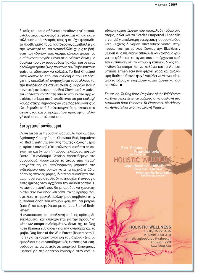 ¸ôóé, ôï Üôïìï ðïõ ðÜó÷åé áðü êñßóåéò ðáíéêïý åíäéáöÝñåôáé õðåñâïëéêÜ ãéá êÜðïéïõò äéêïýò ôïõ êáé áéóèÜíåôáé õðåýèõíïò ãé’ áõôïýò, íéþèïíôáò óõã÷ñüíùò üôé õößóôáôáé êÜðïéá åêìåôÜëëåõóç áðü ðëåõñÜò ôïõò Þ üôé Ý÷åé öïñôùèåß ôá ðñïâëÞìáôÜ ôïõò. Ôáõôü÷ñïíá, áìöéâÜëëåé ãéá ôçí éêáíüôçôÜ ôïõ íá áíôáðåîÝëèåé ÷ùñßò ôç âïÞèåéá ôùí «äéêþí» ôïõ. Áêüìá, êÜðïéïé ìðïñåß íá áéóèÜíïíôáé ðáãéäåõìÝíïé óå óõíèÞêåò üðùò ìéá äïõëåéÜ ðïõ äåí ôïõò áñÝóåé Þ áêüìç êáé óå Ýíáí ïëüêëçñï ôñüðï æùÞò ðïõ ôïõò óõíèëßâåé êáé ôïõò öáßíåôáé áäýíáôïí íá áëëÜîåé. Ôï Red Chestnut åßíáé ëïéðüí ôï åðüìåíï áíèïÀáìá ðïõ åðéëÝãù ãéá ôçí õðåñâïëéêÞ áíçóõ÷ßá ãéá ôïõò Üëëïõò êáé ôçí ðáãßäåõóç óå óôåíÝò ó÷Ýóåéò. Ðáñüëï ðïõ ç áñíçôéêÞ êáôÜóôáóç ôïõ Red Chestnut äåí öáßíåôáé íá ãßíåôáé áíôéëçðôÞ áðü ôï Üôïìï óôá áñ÷éêÜ óôÜäéá, ôï ßáìá áõôü áðïäåéêíýåôáé ìéá åðéëïãÞ êáèïñéóôéêÞò óçìáóßáò ãéá íá ìðïñÝóåé êáíåßò íá åëåõèåñùèåß áðü äõóëåéôïõñãéêÝò åìðëïêÝò óôéò ó÷Ýóåéò ôïõ êáé íá ðñï÷ùñÞóåé ðñïò ôçí áðáëëáãÞ áðü ôá óõìðôþìáôÜ ôïõ. Åõåñãåôéêïß óõíäõáóìïß Öáßíåôáé üôé ìå ôç âáóéêÞ öüñìïõëá ôùí éáìÜôùí Agrimony, Cherry Plum, Chestnut Bud, Impatiens êáé Red Chestnut ìÝóá óôéò ðñþôåò êéüëáò çìÝñåò ïé êñßóåéò ðáíéêïý åßôå ìåéþíïíôáé áéóèçôÜ óå óõ÷íüôçôá êáé Ýíôáóç Þ ðáýïõí ôåëåßùò íá åìöáíßæïíôáé. Ôï áíèïúáìá Gentian, ðñïóôéèÝìåíï óôï óõíäõáóìü, ðñïóôáôåýåé ôï Üôïìï áðü ðéèáíÞ áðïãïÞôåõóç êáé áðïèÜññõíóç ìðñïóôÜ óôï åíäå÷üìåíï õðïôñïðþí êáôÜ ôá áñ÷éêÜ óôÜäéá. ÊÜðïéåò óðÜíéåò öïñÝò, éäéáßôåñá åõáßóèçôá Üôïìá ìðïñåß íá áéóèáíèïýí «áíçóõ÷ßá» Þ Üã÷ïò ãéá ëßãåò çìÝñåò üôáí áñ÷ßæïõí ôçí áíèïèåñáðåßá. Ç êáôÜóôáóç áõôÞ, ðïõ èá ìðïñïýóå íá ÷áñáêôçñéóôåß óáí Ýíá åßäïò «èåñáðåõôéêÞò êñßóçò» ðïõ ïöåßëåôáé óôç ìåãÜëç áëëáãÞ ðïõ óõìâáßíåé óôçí áõôïóõíåßäçóç ôïõ áôüìïõ, öáßíåôáé üôé ìåôñéÜæåôáé Þ êáé áðïöåýãåôáé ìå ôï ßáìá Star of Bethlehem. Ç áíáêïýöéóç êáé áðáëëáãÞ áðü ôéò êñßóåéò äéåõêïëýíåôáé êáé åðéôá÷ýíåôáé ìå ôçí ðñïóèÞêç êÜðïéùí áêüìá áíèïúáìÜôùí, üðùò ð÷. ôá Dog Rose (Bauera rubioides) ãéá ôçí áíçóõ÷ßá êáé ôï öüâï, Dog Rose of the Wild Forces (Bauera sessiliflora) ãéá ôç «óùìáôïðïßçóç ôïõ Üã÷ïõò» (ãéá íá åìðïäßóåé ôéò óõíáéóèçìáôéêÝò åíôÜóåéò íá åðçñåÜóïõí ôéò óùìáôéêÝò ëåéôïõñãßåò), Emergency Essence ãéá ðåñéóóüôåñï êïõñÜãéï óôçí áíôéìåôþðéóç êáôáóôÜóåùí ðïõ ðñïêáëïýí ôñüìï óôï Üôïìï, áëëÜ êáé ôá Scarlet Pimpernel (Anagallis arvensis) ãéá êáëýôåñç åíåñãåéáêÞ éóïññïðßá üóï íÝåò øõ÷éêÝò äõíÜìåéò áðåëåõèåñþíïíôáé óôçí ðñïóùðéêüôçôá åìðëïõôßæïíôáò ôçí, Blackberry (Rubus villosus) ãéá íá áðáëýíåé êáé íá áðïìáêñýíåé ôï öüâï êáé ôï Üã÷ïò ðïõ ðñïÝñ÷ïíôáé áðü ôçí åíôýðùóç üôé ôï Üôïìï Þ êÜðïéïò äéêüò ôïõ êéíäõíåýåé áêüìá êáé íá ðåèÜíåé êáé ôï Apricot (Prunus armeniaca) ðïõ öÝñíåé ÷áñÜ êáé áíÜëáöñç äéÜèåóç üôáí ç øõ÷Þ íïéþèåé íá ãÝñíåé êÜôù áðü ôï âÜñïò óôåíü÷ùñùí êáôáóôÜóåùí êáé äõóêïëéþí. __ __ Óçìåßùóç: Ôá Dog Rose, Dog Rose of the Wild Forces êáé Emergency Essence áíÞêïõí óôçí óõëëïãÞ ôùí Australian Bush Essences. Ôá Pimpernel, Blackberry êáé Apricot åßíáé áðü ôç óõëëïãÞ Pegasus. |