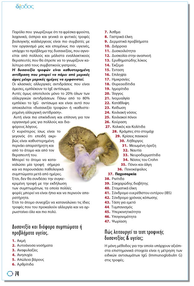 Ðáñüëï ðïõ ãíùñßæïõìå üôé ôá öñÝóêá öñïýôá, ëá÷áíéêÜ, üóðñéá êáé ãåíéêÜ ïé öõôéêÝò ôñïöÝò âéïëïãéêÞò êáëëéÝñãåéáò åßíáé ðéï óõìâáôÝò ìå ôïí ïñãáíéóìü ìáò êáé åðïìÝíùò ðéï õãéåéíÝò, õðÜñ÷åé ôï ðñüâëçìá ôçò äõóáíåîßáò, ðïõ áãíïåßôáé áðü ðïëëïýò êáé ìÜëéóôá åíáëëáêôéêïýò èåñáðåõôÝò ðïõ èá Ýðñåðå íá ôï ãíùñßæïõí êáëýôåñá áðü ôïõò óõìâáôéêïýò ãéáôñïýò. Ç äõóáíåîßá ôñïöþí åßíáé êáèõóôåñçìÝíç áíôßäñáóç ðïõ ìðïñåß íá ðÜñåé áðü ìåñéêÝò þñåò ìÝ÷ñé ìåñéêÝò çìÝñåò íá åìöáíéóôåß. Ïé êëáóéêÝò áëëåñãéêÝò áíôéäñÜóåéò ðïõ åßíáé Üìåóåò, åìðëÝêïõí ôï IgE áíôßóùìá. ÁõôÝò üìùò áðïôåëïýí ìüíï ôï 20% üëùí ôùí áëëåñãéêþí áíôéäñÜóåùí. ÐÜíù áðü ôï 80% åìðëÝêåé ôï IgG áíôßóùìá êáé åßíáé áõôü ðïõ áðïêáëåßôáé «äõóáíåîßá ôñïöþí» Þ «êáèõóôåñçìÝíç áëëåñãéêÞ áíôßäñáóç». ÁõôÞ åßíáé ðéï åðéêßíäõíç êáé åðßðïíç ãéá ôïí ïñãáíéóìü ìáò ãéá ðïëëïýò êáé äéáöüñïõò ëüãïõò. Ï êõñéüôåñïò ßóùò åßíáé ôï ãåãïíüò üôé åðåéäÞ áêñéâþò åßíáé êáèõóôåñçìÝíç ðåñíÜåé áðáñáôÞñçôç êáé áðü ôï Üôïìï êáé áðü ôïí èåñáðåõôÞ ôïõ. Ìðïñåß ôï Üôïìï íá êáôáíáëþóåé ìßá ôñïöÞ óÞìåñá êáé íá ðáñïõóéÜóåé ðáèïëïãéêÜ óõìðôþìáôá ìåôÜ áðü çìÝñåò. ¸ôóé, äåí èá óõíäÝóåé ôçí óõãêåêñéìÝíç ôñïöÞ ìå ôçí åêäÞëùóç ôùí óõìðôùìÜôùí, ôá ïðïßá ðïëëÝò öïñÝò ìðïñåß íá åßíáé Þðéá êáé íá ðåñíïýí áðáñáôÞñçôá. ¸ôóé ôï Üôïìï óõíå÷ßæåé íá êáôáíáëþíåé ôéò ßäéåò ôñïöÝò ðïõ ôïõ ðñïêáëïýí áëëåñãßá êáé íá áññùóôáßíåé üëï êáé ðéï ðïëý. Äõóáíåîßá êáé äéÜöïñá óõìðôþìáôá Þ ðñïâëÞìáôá õãåßáò. • ÁêìÞ • ÁõôïÜíïóá íïóÞìáôá • Áíáöõëáîßåò • Áíçóõ÷ßá • Áðþëåéá âÜñïõò • Áñèñßôéäá • ¶óèìá • ÃáóôñéêÜ Ýëêç • ÄåñìáôéêÜ ðñïâëÞìáôá • ÄéÜññïéá • Äõóêïéëéüôçôá • Äõóêïëßá óôçí áíáðíïÞ • Åñõèçìáôþäçò ëýêïò • ¸êæåìá • ¸íôáóç • Åðéëçøßá • Çìéêñáíßåò • Èõñåïåéäßôéäá • Éãìïñßôéäá • ºëéããïò • Éíïìõáëãßá • ÊáôÜèëéøç • Êíßäùóç • ÊïéëéáêÞ íüóïò • Êïéëéáêïß ðüíïé • Êïýñáóç • Êïëéêüò êáé Êïëßôéäá • ÊñÜìðåò óôï óôïìÜ÷é • Êñßóåéò ðáíéêïý • ËÞèáñãïò • ÌåéùìÝíç üñåîç • Íáõôßá • Íåõñïäåñìáôßôéäá • Íüóïò ôïõ Crohn • Ðüíïé êáé Üëãç • ÐïíïêÝöáëïò • Ðá÷õóáñêßá • Ñéíßôéäá • Óáê÷áñþäçò äéáâÞôçò • ÓôïìáôéêÜ Ýëêç • Óýíäñïìï åõåñÝèéóôïõ åíôÝñïõ (IBS) • Óýíäñïìï ÷ñüíéáò êüðùóçò • ÔÜóç ãéá åìåôü • Ôõìðáíéóìüò • Õðåñêéíçôéêüôçôá • Yðïãïíéìüôçôá |