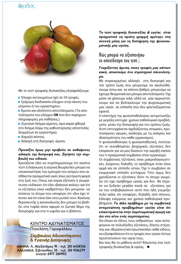 Ðþò ëåéôïõñãåß ôï ôåóô ôñïöéêÞò äõóáíåîßáò & õãåßáò; Ç ìüíç ìÝèïäïò ãéá ôçí ïðïßá õðÜñ÷ïõí áîéüðéóôá åðéóôçìïíéêÜ óôïé÷åßá åßíáé ç ìÝôñçóç ôùí åéäéêþí áíôéóùìÜôùí IgG (Immunoglobulin G) óôéò ôñïöÝò. Ìå ôï ôåóô ôñïöéêÞò äõóáíåîßáò åîáóöáëßæïõìå: • ¸ëåã÷ï áíôéóùìÜôùí IgG óå 59 ôñïöÝò. • ÃñÞãïñç äéáäéêáóßá åëÝã÷ïõ óôçí Üíåóç ôïõ éáôñåßïõ Þ ôïõ åñãáóôçñßïõ . • ¶ìåóá êáé áîéüðéóôá áðïôåëÝóìáôá. (Ôá áðïôåëÝóìáôá ôïõ åëÝã÷ïõ OKtest äåí ðáñÝ÷ïõí ðëçñïöïñßåò ãéá ðáèÞóåéò.) • Æùíôáíü äåßãìá áßìáôïò, Üñá êáìßá öèïñÜ óôï äåßãìá ëüãù ôçò êáèõóôÝñçóçò áðïóôïëÞò äåéãìÜôùí óå åñãáóôÞñéá. • ×áìçëü êüóôïò. • ÁëëáãÞ óôç äéáôñïöÞ Üìåóá. ÐñïóÝîôå üìùò ìçí ðñïâåßôå óå áõèáßñåôåò áëëáãÝò ôçò äéáôñïöÞ óáò. ÆçôÞóôå ôçí óõìâïõëÞ ôïõ åéäéêïý. ×ñåéÜæåôáé åäþ íá óõìðëçñþóïõìå üôé êáíÝíá ôåóô Þ äéÜãíùóç Þ éáôñéêÞ èåùñßá äåí ìðïñåß íá õðïêáôáóôÞóåé ôçí åìðåéñßá ôïõ áôüìïõ ðïõ áéóèÜíåôáé ðñáãìáôéêÜ õãéÝò ßóùò ãéá ðñþôç öïñÜ óôç æùÞ ôïõ. ¼ðùò êáé êáìßá åîÝôáóç Þ ãíùìÜôåõóç «åéäéêþí» üôé üëá «âáßíïõí êáëþò» êáé üôé ïé åîåôÜóåéò åßíáé «êáèñÝðôçò» äåí ìðïñïýí íá ðåßóïõí ôï Üôïìï ðïõ õðïöÝñåé üôé «äåí Ý÷åé ôßðïôá» êáé üôé åßíáé üëá «óôï ìõáëü ôïõ». ÊáíÝíáò èåñáðåõôÞò ç êáôáíáëùôÞò äåí ìðïñåß íá âáäßæåé óôá ôõöëÜ üóïí áöïñÜ ôï æùôéêü èÝìá ôçò äéáôñïöÞò êáé óôï ôé ùöåëåß êáé ôé âëÜðôåé. Ôï ôåóô ôñïöéêÞò äõóáíåîßáò & õãåßáò åßíáé ðñáãìáôéêÜ «ç ðñþôç ãñáììÞ áìýíçò» óôç óõíå÷Þ ìÜ÷ç ãéá ôç äéáôÞñçóç ôçò øõ÷ïóùìáôéêÞò ìáò õãåßáò. Ðþò ìðïñþ íá áîéïðïéÞóù ôï áðïôÝëåóìá ôïõ ôåóô ; Ãíùñßæïíôáò Üìåóá, ðïéåò ôñïöÝò ìáò êÜíïõí êáêü, áðïêôïýìå Ýíá óôñáôçãéêü ðëåïíÝêôçìá. Ìå óõãêåêñéìÝíåò áëëáãÝò óôç äéáôñïöÞ êáé ôïí ôñüðï æùÞò ðïõ ìðïñïýìå íá áêïëïõèÞóïõìå Ýóôù êáé óå êÜðïéï âáèìü, ìðïñïýìå íá Ý÷ïõìå èåáìáôéêÜ êáé ìüíéìá áðïôåëÝóìáôá. ¼÷é ìüíï íá ÷Üóïõìå êéëÜ, áëëÜ íá ìçí áññùóôáßíïõìå êáé íá âåëôéþóïõìå ôçí øõ÷ïóùìáôéêÞ ìáò õãåßá óå åðßðåäá ðïõ äåí öáíôáæüìáóôáí åöéêôÜ. Ç åðéóôÞìç ôçò öõóéïðáèïëïãßáò áíôéìåôùðßæåé ìå ìåãÜëç åðéôõ÷ßá ÷ñüíéá ðáèïëïãéêÜ ðñïâëÞìáôá ìÝóù ôçò äéáôñïöÞò êáé ôïõ ôñüðïõ æùÞò. Áõôü åðéôõã÷Üíåôáé ó÷åäéÜæïíôáò áôïìéêÝò, ðñïôåéíüìåíåò áãùãÝò, áíÜëïãåò ìå ôéò áíÜãêåò êáé éäéáéôåñüôçôåò ôïõ êÜèå ïñãáíéóìïý. Ç öõóéïðáèïëïãßá Þ öõóéêïðáèçôéêÞ, ðéóôåýåé üôé ïé óõíçèéóìÝíåò âéï÷çìéêÝò åîåôÜóåéò äåí åðáñêïýí ãéá íá ìáò äþóïõí ôçí áêñéâÞ åéêüíá ôïõ ôé ðñáãìáôéêÜ óõìâáßíåé óôïí ïñãáíéóìü. Ïé óõìâáôéêÝò åîåôÜóåéò åßíáé ìáêñïäéáãíùóôéêÝò. Äåß÷íïõí, äçëáäÞ, ôï ðñüâëçìá üôáí åßíáé áñãÜ êáé óå åðßðåäï éóôþí. ¼÷é ôé óõìâáßíåé óå åíåñãåéáêü åðßðåäï êõôôÜñùí. Ôüôå üìùò äåí ÷ñåéÜæïíôáé ïé åîåôÜóåéò äéüôé ôï Üôïìï ãíùñßæåé üôé Ý÷åé ðñüâëçìá õãåßáò êáé äåí èá Ýðñåðå íá îïäåýåé ìåãÜëá ðïóÜ óå åîåôÜóåéò ãéá íá ôïõ åðéâåâáéþóïõí áõôü ðïõ Þäç ãíùñßæåé ðïëý êáëÜ, üôé õðïöÝñåé, äçëáäÞ, áðü ðüíïõò, Ýëëåéøç åíÝñãåéáò êáé ÷ñüíéá ðáèïëïãéêÜ ðñïâëÞìáôá. Ôï Üëëï ðñüâëçìá ìå ôç óõìâáôéêÞ áíôéìåôþðéóç ðñïâëçìÜôùí õãåßáò åßíáé üôé åðéêåíôñþíåôáé óôçí óõìðôùìáôéêÞ áãùãÞ êáé ü÷é óôï áßôéï åíüò óõìðôþìáôïò. Èá Ýëåãá óå üëïõò ôïõò áíèñþðïõò ðñéí êáôáöýãïõí óå ðïëõÝîïäåò åîåôÜóåéò, äßáéôåò óôÝñçóçò êáé «èåñáðåõôéêÜ ðñùôüêïëëá» êÜèå åßäïõò, íá åîáóöáëßóïõí üôé ïé ôñïöÝò ðïõ ôñþíå üíôùò ðñïóôáôåýïõí ôçí õãåßá ôïõò. Êáé ðþò èá ôï ìÜèïõí áõôü? ÊÜíïíôáò Ýíá ôåóô ôñïöéêÞò äõóáíåîßáò & õãåßáò. |