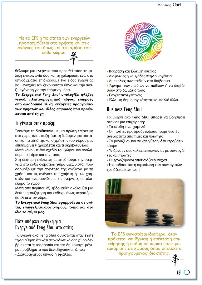 Ìå ôï EFS ç ðïéüôçôá ôùí åíåñãåéþí ðñïóáñìüæåôáé óôï ÷ñÞóôç êáé óôéò áíÜãêåò ôïõ üðùò êáé óôç ÷ñÞóç ôïõ êÜèå ÷þñïõ. Ð.÷. óôï óáëüíé èÝëïõìå ìéá åíÝñãåéá ðïõ ðñïùèåß ôüóï ôç öéëéêÞ åðéêïéíùíßá üóï êáé ôç ÷áëÜñùóç, åíþ óôï õðíïäùìÜôéï åðéäéþêïõìå Ýíá åßäïò åíÝñãåéáò ðïõ åíéó÷ýåé ôïí îåêïýñáóôï ýðíï êáé ôçí áíáæùïãüíçóç ãéá ôçí åðüìåíç ìÝñá. Ôï Åíåñãåéáêü Feng Shui õðïëïãßæåé öëÝâåò íåñïý, çëåêôñïìáãíçôéêü íÝöïò, åðéññïÝò áðü ïéêïäïìéêÜ õëéêÜ, åíÝñãåéåò ðñïçãïýìåíùí ÷ñçóôþí êáé Üëëåò åðéññïÝò ðïõ ðñïÝñ÷ïíôáé áðü ôç ãç. Ôé ãßíåôáé óôçí ðñÜîç; ÎåêéíÜìå ôç äéáäéêáóßá ìå ìéá ðñþôç åðßóêåøç óôï ÷þñï, üðïõ óõæçôÜìå ôç äåäïìÝíç êáôÜóôáóç êáé ôá áßôéÜ ôçò êáé ï ÷ñÞóôçò ôïõ ÷þñïõ ìáò åðéóçìáßíåé ôé ÷ñåéÜæåôáé êáé ôé áêñéâþò èÝëåé. ÌåôÜ êÜíïõìå Ýíá ó÷Ýäéï ôïõ ÷þñïõ êáé áíáëýïõìå ôï êôßñéï êáé ôïí ôüðï. Óôç äåýôåñç åðßóêåøç ìåôáôñÝðïõìå ôçí åíÝñãåéá óôï êÜèå äùìÜôéïÞ ÷þñï îå÷ùñéóôÜ, ðñïóáñìüæïõìå ôçí ðïéüôçôá ôçò áíÜëïãá ìå ôç ÷ñÞóç êáé ôéò áíÜãêåò ôïõ ÷ñÞóôç Þ ôùí ÷ñçóôþí êáé åíáñìïíßæïõìå ôéò åíÝñãåéåò óå ïëüêëçñï ôï ÷þñï. ÌåôÜ áðü ðåñßðïõ Ýîé åâäïìÜäåò áêïëïõèåß ìéá äåýôåñç óõæÞôçóç êáé åíäå÷ïìÝíùò ðåñáéôÝñù äïõëåéÜ óôïí ÷þñï. Ôï Åíåñãåéáêü Feng Shui åöáñìüæåôáé óå óðßôéá, åðáããåëìáôéêïýò ÷þñïõò, ôïðßá êáé óôï ßäéï ôï óþìá ìáò. Ðüôå õðÜñ÷åé áíÜãêç ãéá Åíåñãåéáêü Feng Shui óôï óðßôé; Ôï Eíåñãåéáêü Feng Shui óõíéóôÜôáé üôáí Ý÷åôå ôçí áßóèçóç üôé êÜôé óôïí éäéùôéêü óáò ÷þñï äåí âñßóêåôáé óå éóïññïðßá êáé óáò äçìéïõñãåß ìüíéìá ðñïâëÞìáôá ðïõ äåí åîçãïýíôáé, üðùò: - ÄéáôáñáãìÝíïò ýðíïò Þ åöéÜëôåò - Êïýñáóç êáé Ýëëåéøç åõåîßáò - Äéáöùíßåò Þ êáõãÜäåò óôçí ïéêïãÝíåéá - Äõóêïëßåò ôùí ðáéäéþí óôï äéÜâáóìá - ¶ñíçóç ôùí ðáéäéþí íá ðáßîïõí Þ íá äéáâÜóïõí óôï äùìÜôéü ôïõò - Åíï÷ëçôéêïß ãåßôïíåò - ¸ëëåéøç äçìéïõñãéêüôçôáò êáé ðïëëÜ Üëëá. Business Feng Shui Ôï Åíåñãåéáêü Feng Shui ìðïñåß íá âïçèÞóåé üôáí óå ìéá åðé÷åßñçóç: - Tá êÝñäç åßíáé ÷áìçëÜ - Ïé ðåëÜôåò ðñïôéìïýí Üëëïõò ðñïìçèåõôÝò áíåîÜñôçôá áðü ôéìÝò êáé ðïéüôçôá - Ôï ìáãáæß, áí êáé óå êáëÞ èÝóç, äåí «ôñáâÜåé» êüóìï - ÕðÜñ÷ïõí äõóêïëßåò åðéêïéíùíßáò ìå óõíåñãÜôåò êáé ðåëÜôåò - Ïé åñãáæüìåíïé áðïõóéÜæïõí óõ÷íÜ - Ç áðüäïóç êáé ç áöïóßùóç ôùí óõíåñãáôþí ÷ñåéÜæåôáé âåëôßùóç - Ç åíïéêßáóç Þ ç ðþëçóç åðáããåëìáôéêþí ÷þñùí êáèõóôåñåß ÷ùñßò ëüãï. |