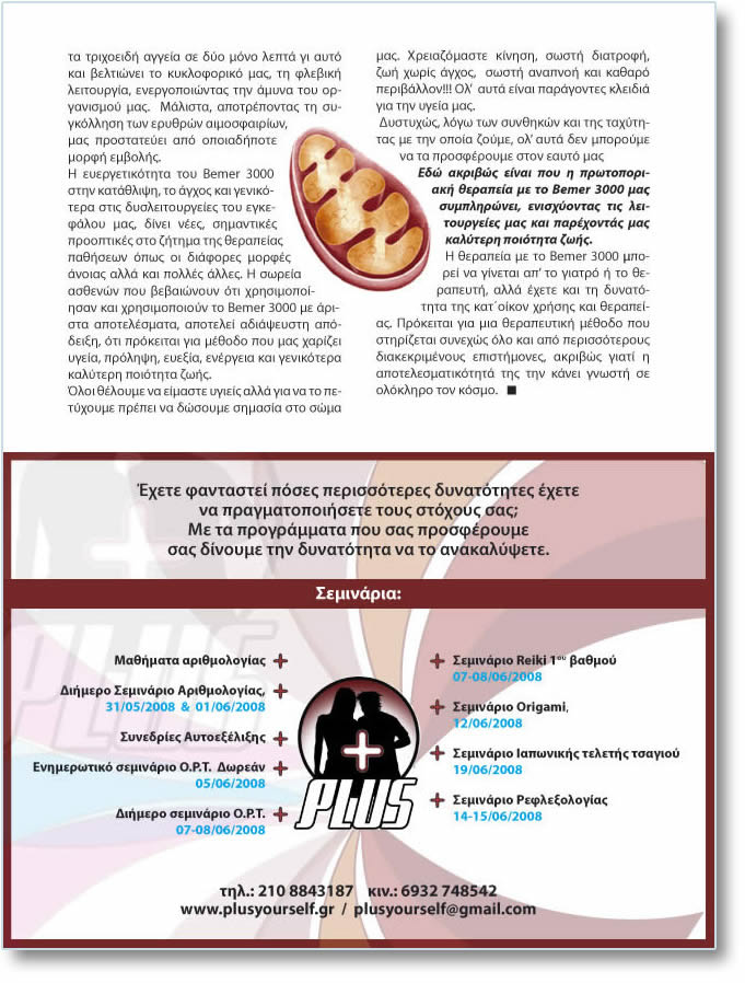 (ÔÏ ÃÊÑÉÆÏ ÊÅÉÌÅÍÏ ÅÉÍÁÉ Ç ÁÑ×Ç ÔÇÓ ÐÑÏÔÁÓÇÓ ÁÐÏ ÔÇÍ ÐÑÏÇÃÏÕÌÅÍÇ ÓÅËÉÄÁ ÔÇÓ ÅÍÔÕÐÇÓ ÅÊÄÏÓÇÓ) Áíïßãåé ôá ôñé÷ïåéäÞ áããåßá óå äýï ìüíï ëåðôÜ ãé áõôü êáé âåëôéþíåé ôï êõêëïöïñéêü ìáò, ôç öëåâéêÞ ëåéôïõñãßá, åíåñãïðïéþíôáò ôçí Üìõíá ôïõ ïñãáíéóìïý ìáò. ÌÜëéóôá, áðïôñÝðïíôáò ôç óõãêüëëçóç ôùí åñõèñþí áéìïóöáéñßùí, ìáò ðñïóôáôåýåé áðü ïðïéáäÞðïôå ìïñöÞ åìâïëÞò. Ç åõåñãåôéêüôçôá ôïõ Âemer 3000 óôçí êáôÜèëéøç, ôï Üã÷ïò êáé ãåíéêüôåñá óôéò äõóëåéôïõñãåßåò ôïõ åãêåöÜëïõ ìáò, äßíåé íÝåò, óçìáíôéêÝò ðñïïðôéêÝò óôï æÞôçìá ôçò èåñáðåßáò ðáèÞóåùí üðùò ïé äéÜöïñåò ìïñöÝò Üíïéáò áëëÜ êáé ðïëëÝò Üëëåò. Ç óùñåßá áóèåíþí ðïõ âåâáéþíïõí üôé ÷ñçóéìïðïßçóáí êáé ÷ñçóéìïðïéïýí ôï Bemer 3000 ìå Üñéóôá áðïôåëÝóìáôá, áðïôåëåß áäéÜøåõóôç áðüäåéîç, üôé ðñüêåéôáé ãéá ìÝèïäï ðïõ ìáò ÷áñßæåé õãåßá, ðñüëçøç, åõåîßá, åíÝñãåéá êáé ãåíéêüôåñá êáëýôåñç ðïéüôçôá æùÞò. ¼ëïé èÝëïõìå íá åßìáóôå õãéåßò áëëÜ ãéá íá ôï ðåôý÷ïõìå ðñÝðåé íá äþóïõìå óçìáóßá óôï óþìá ìáò. ×ñåéáæüìáóôå êßíçóç, óùóôÞ äéáôñïöÞ, æùÞ ÷ùñßò Üã÷ïò, óùóôÞ áíáðíïÞ êáé êáèáñü ðåñéâÜëëïí!!! Ïë’ áõôÜ åßíáé ðáñÜãïíôåò êëåéäéÜ ãéá ôçí õãåßá ìáò. Äõóôõ÷þò, ëüãù ôùí óõíèçêþí êáé ôçò ôá÷ýôçôáò ìå ôçí ïðïßá æïýìå, ïë’ áõôÜ äåí ìðïñïýìå íá ôá ðñïóöÝñïõìå óôïí åáõôü ìáò Åäþ áêñéâþò åßíáé ðïõ ç ðñùôïðïñéáêÞ èåñáðåßá ìå ôï Âemer 3000 ìáò óõìðëçñþíåé, åíéó÷ýïíôáò ôéò ëåéôïõñãåßåò ìáò êáé ðáñÝ÷ïíôÜò ìáò êáëýôåñç ðïéüôçôá æùÞò. Ç èåñáðåßá ìå ôï Âemer 3000 ìðïñåß íá ãßíåôáé áð’ ôï ãéáôñü Þ ôï èåñáðåõôÞ, áëëÜ Ý÷åôå êáé ôç äõíáôüôçôá ôçò êáô´ïßêïí ÷ñÞóçò êáé èåñáðåßáò. Ðñüêåéôáé ãéá ìéá èåñáðåõôéêÞ ìÝèïäï ðïõ óôçñßæåôáé óõíå÷þò üëï êáé áðü ðåñéóóüôåñïõò äéáêåêñéìÝíïõò åðéóôÞìïíåò, áêñéâþò ãéáôß ç áðïôåëåóìáôéêüôçôÜ ôçò ôçí êÜíåé ãíùóôÞ óå ïëüêëçñï ôïí êüóìï. |
