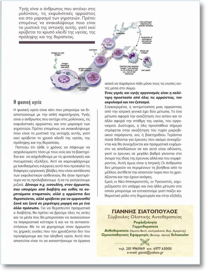 Ç öõóéêÞ õãåßá. Ç öõóéêÞ õãåßá åßíáé êÜôé ðïõ ìðïñïýìå íá äéáðéóôþóïõìå ìå ôçí áðëÞ ðáñáôÞñçóç. ÕãéÞò åßíáé ï Üíèñùðïò ðïõ áíôÝ÷åé óôéò ìïëýíóåéò, ôéò åêöõëéóôéêÝò áññþóôéåò êáé óôï ìáñáóìü ôùí ãçñáôåéþí. ÐñÝðåé åðïìÝíùò íá áíáêáëýøïõìå ðïéï åßíáé ôï ìõóôéêü ôçò áíôï÷Þò áõôÞò, ãéáôß åêåß êñýâåôáé ôï ÷ñõóü êëåéäß ôçò õãåßáò, ôçò ðñüëçøçò êáé ôçò èåñáðåßáò. Ðéóôåýù üôé Þëèå ï ÷ñüíïò íá ðÜøïõìå íá áó÷ïëïýìáóôå ôüóï ìå ôïõò éïýò êáé ôá âáêôçñßäéá êáé íá áó÷ïëçèïýìå ìå ôéò öõóéïëïãéêÝò êáé ðíåõìáôéêÝò åîåëßîåéò. Áíôß íá êáìïõöëÜñïõìå ìå ëáíèáóìÝíåò åíÝñãåéåò áõôü ðïõ ðñïêáëåß ôéò äéÜöïñåò ïñãáíéêÝò âëÜâåò ðïõ åßíáé êáôÜëïéðá ôùí åêöõëéóôéêþí áóèåíåéþí, èá Þôáí ðñïôéìüôåñï íá ôéò ðñïëáâáßíïõìå Þ íá ôéò ãéáôñåýïõìå ñéæéêÜ. Äßíïõìå ð. ÷. éíóïõëßíç, óôïí Üññùóôï, ðïõ õðïöÝñåé áðü äéáâÞôç êáé åõèýò ôá óõìðôþìáôá óôáìáôïýí, áëëÜ ç áññþóôéá äåí èåñáðåýåôáé, áëëÜ êñýâåôáé ãéá íá åìöáíéóèåß îáíÜ êáé îáíÜ óå ÷åéñüôåñç ìïñöÞ êáé ìå Ýíá Üëëï ðñüóùðï. Ãéá íá èåñáðåõôåß ðñáãìáôéêÜ ï äéáâÞôçò èá ðñÝðåé íá âñïýìå üëåò ôéò áéôßåò êáé ôá ìÝóá ðïõ èá ìðïñïýóáí íá áíáíåþóïõí ôá ðáãêñåáôéêÜ êýôôáñá Þ êáé íá ôá áíôéêáôáóôÞóïõí. Ìå ôï íá ÷ïñçãïýìå óôïí Üññùóôï ôéò ÷çìéêÝò ïõóßåò ðïõ ôïõ ÷ñåéÜæïíôáé äåí ôïõ ðñïóöÝñïõìå êáé ôçí áëçèéíÞ õãåßá. Áõôü ðïõ áðáéôåßôáé åßíáé ôï íá êáôáóôÞóïõìå ôá üñãáíá éêáíÜ íá ðáñÜãïõí ðÜëé ìüíá ôïõò ôéò ïõóßåò áõôÝò ìÝóá óôï óþìá. ¸íáò ãåñüò êáé õãéÞò ïñãáíéóìüò åßíáé ç êáëýôåñç ðñïóôáóßá áðü üëåò ôéò áññþóôéåò, ôïí åêöõëéóìü êáé ôïí îåðåóìü. ÓõãêåêñéìÝíá, ç áíôéìåôþðéóç ìéáò áññþóôéáò áðü ôçí éáôñéêÞ ãåíéêÜ Ý÷åé äýï ìÝôùðá. Ôï Ýíá ìÝôùðï áöïñÜ ôçí áíáæÞôçóç ôïõ áéôßïõ êáé ôï Üëëï áöïñÜ ôçí óôÜèìç ôçò õãåßáò, ôïõ ïñãáíéóìïý. Äõóôõ÷þò, ç üëç ðñïóðÜèåéá óÞìåñá óôñÝöåôáé óôçí áíáæÞôçóç ôïõ ôõ÷üí ìéêñïâéáêïý ðáñÜãïíôá, éïý, Þ âáêôçñéäßïõ. ÔåñÜóôéá ðïóÜ äßäïíôáé ãéá Ýñåõíåò ðïõ áêüìá óõíå÷ßæïíôáé êáé èá óõíå÷éæïíôáé êáé ðñáãìáôéêÜ åõ÷üìáóôå íá áðïäþóïõí áí êáé áõôü åßíáé áäýíáôï, ãéáôß ïé Ýñåõíåò óå ìåãÜëï âáèìü ãßíïíôáé óôï üíïìá ôçò ßäéáò ôçò Ýñåõíáò áëëÜ êáé ôïõ óõìöÝñïíôïò. ÁõôÞ üìùò åßíáé ç ÉáôñéêÞ; Ïé Üíèñùðïé äåí ìðïñïýí íá ðåñéìÝíïõí ôç âïÞèåéá áðü ôï ìÝëëïí, áíôßèåôá ôçí áðáéôïýí ôþñá ðïõ ôç ÷ñåéÜæïíôáé êáé ôçí Ý÷ïõí áíÜãêç. Åìåßò ïé ÍÝï-ÉððïêñáôéóôÝò, ïé ÕãéåéíéóôÝò, éó÷õñéæüìáóôå üôé õðÜñ÷åé êáé Ýíá Üëëï ìÝôùðï óôï ïðïßï ìðïñïýìå íá åóôéáóôïýìå ãéáôß ðáßæåé êáèïñéóôéêü ñüëï óôç äçìéïõñãßá êáé óôçí åîÝëéîç ìéáò áññþóôéáò. (ÔÏ ÃÊÑÉÆÏ ÊÅÉÌÅÍÏ ÅÉÍÁÉ Ç ÏËÏÊËÇÑÙÓÇ ÔÇÓ ÐÑÏÔÁÓÇÓ ÓÔÇÍ ÅÐÏÌÅÍÇ ÓÅËÉÄÁ ÔÇÓ ÅÍÔÕÐÇÓ ÅÊÄÏÓÇÓ)